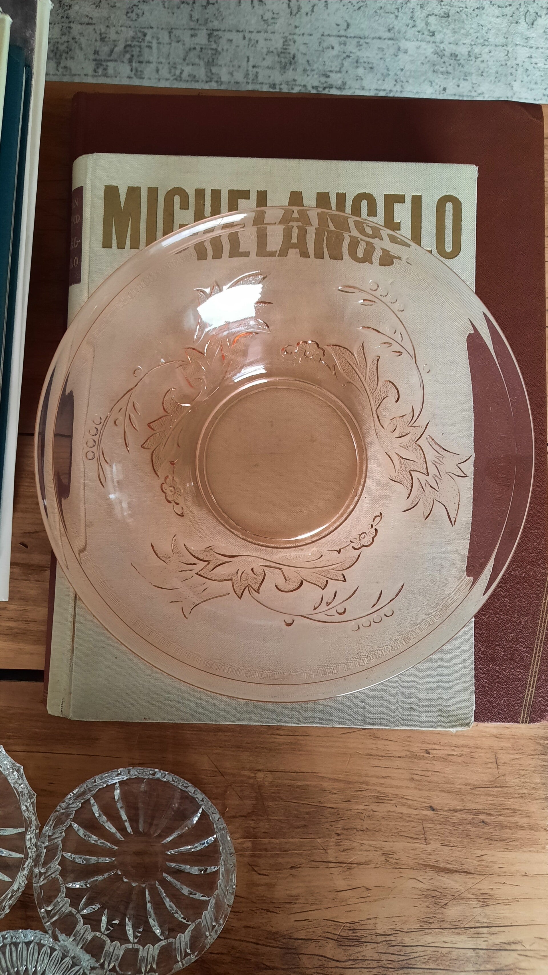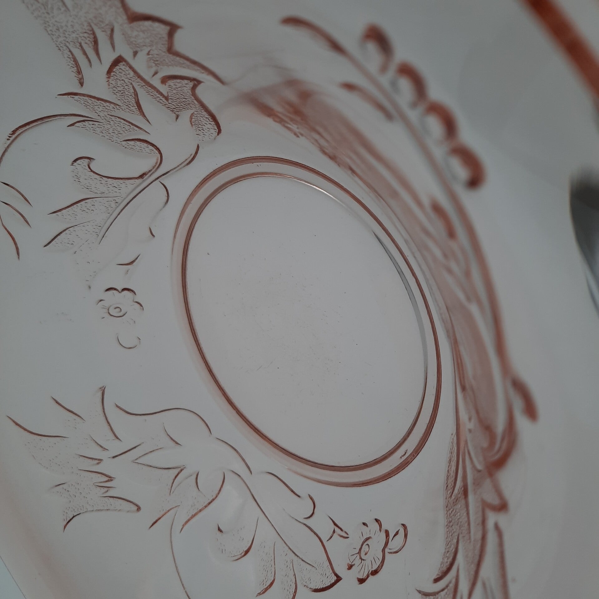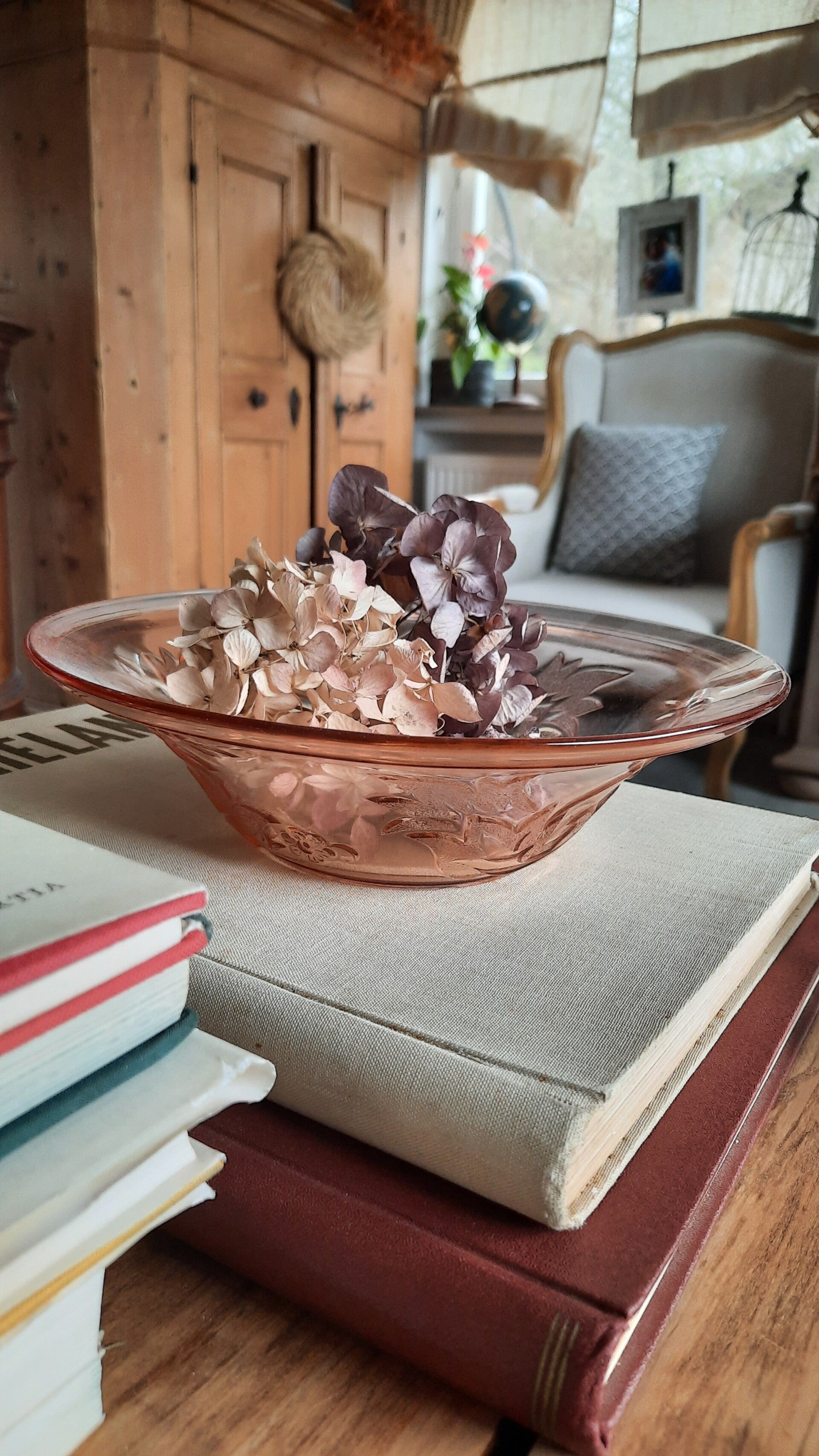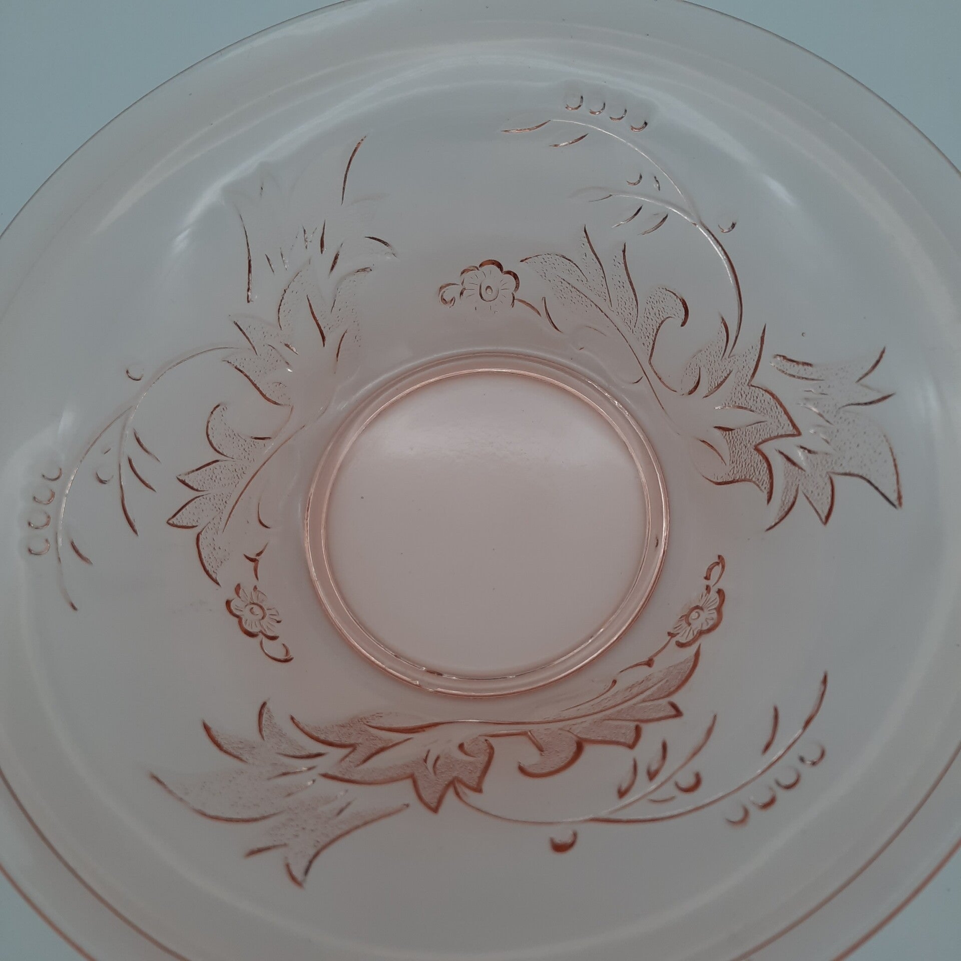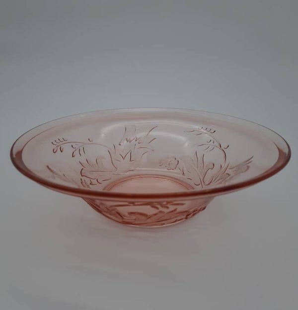 A charming vintage pink glass bowl adorned with intricate flower motifs.
