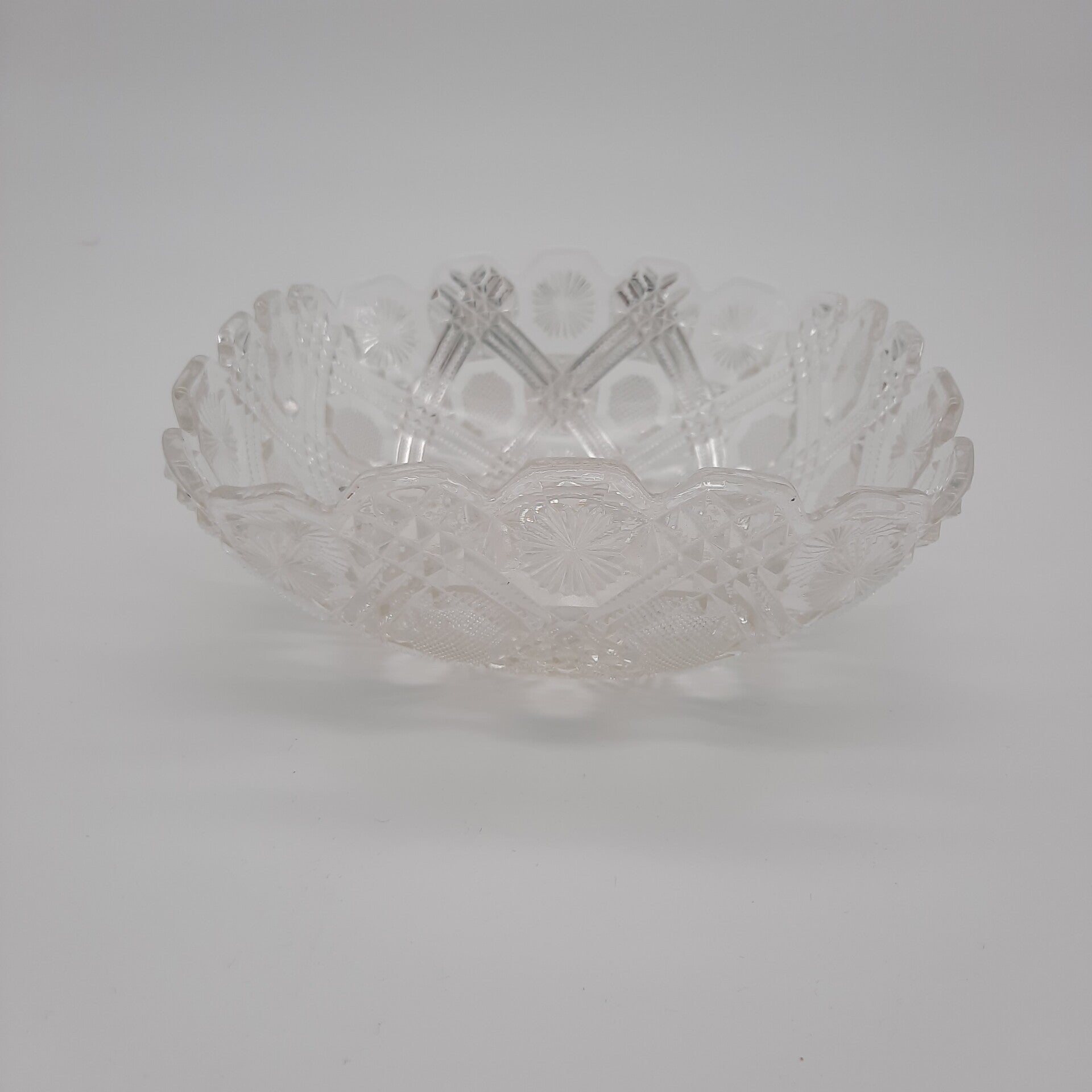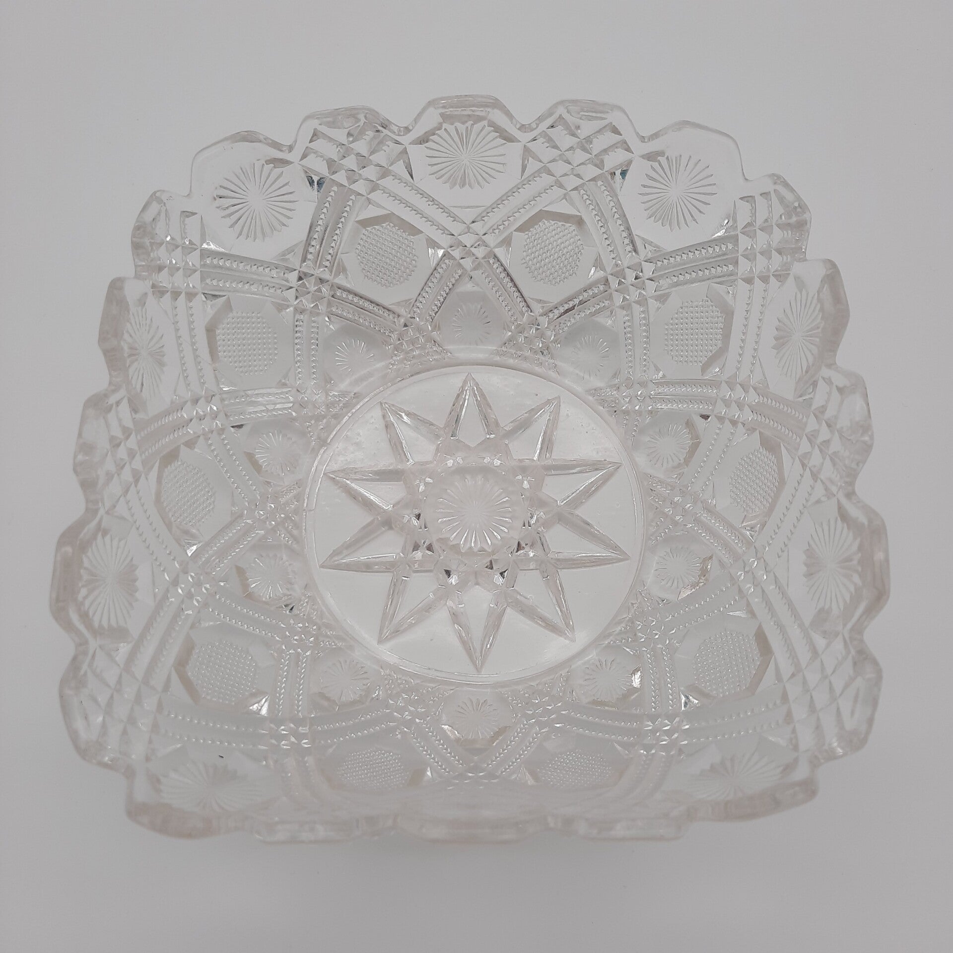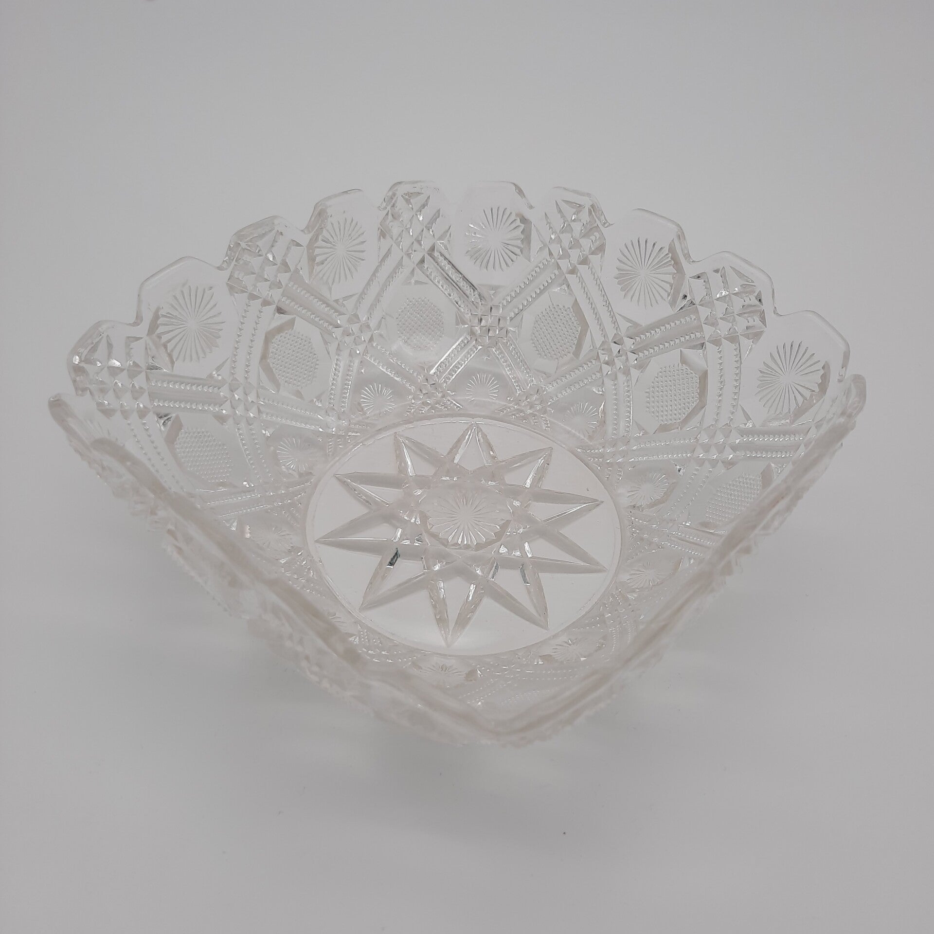 Beautiful vintage glass serving bowl with a curved edge and beautiful floral decorations, as well as a large star at the bottom.