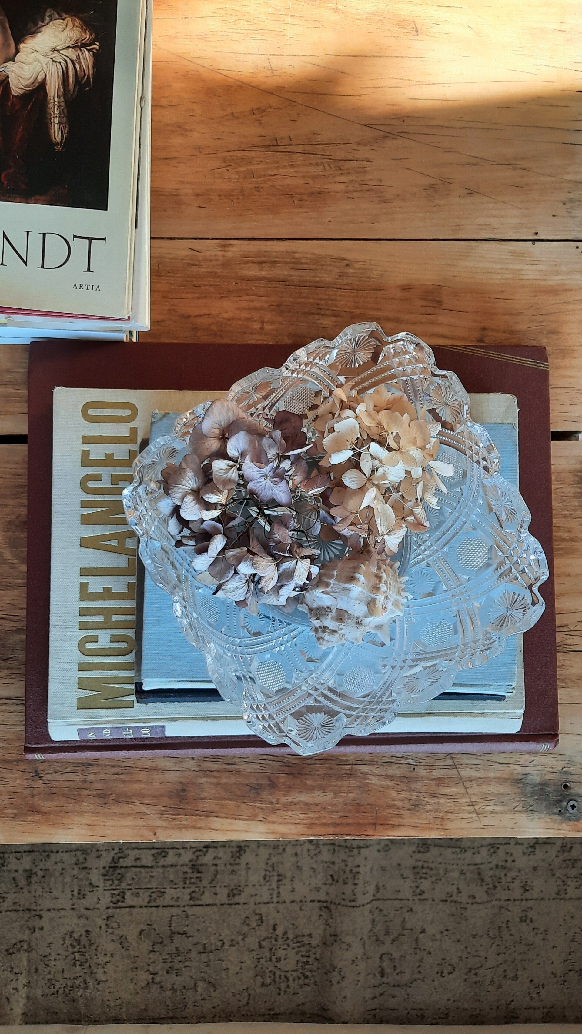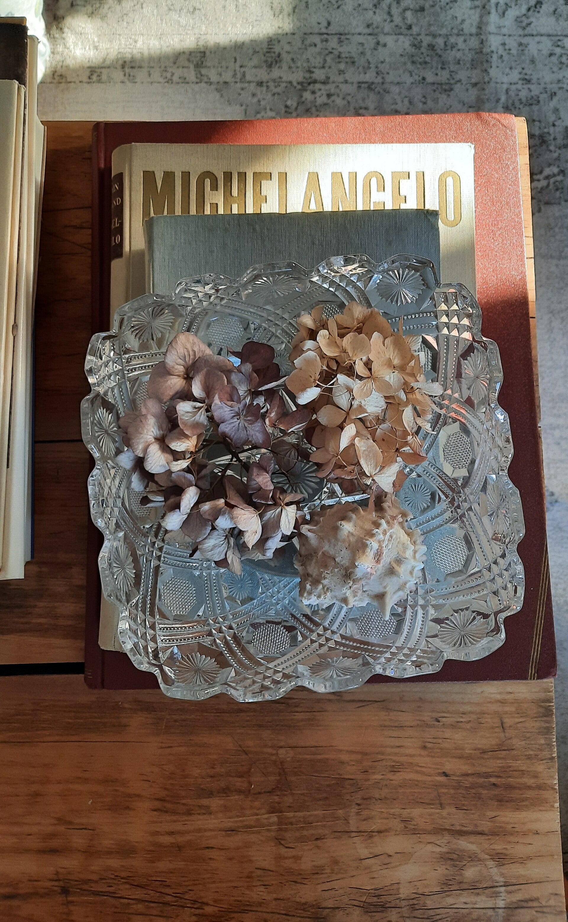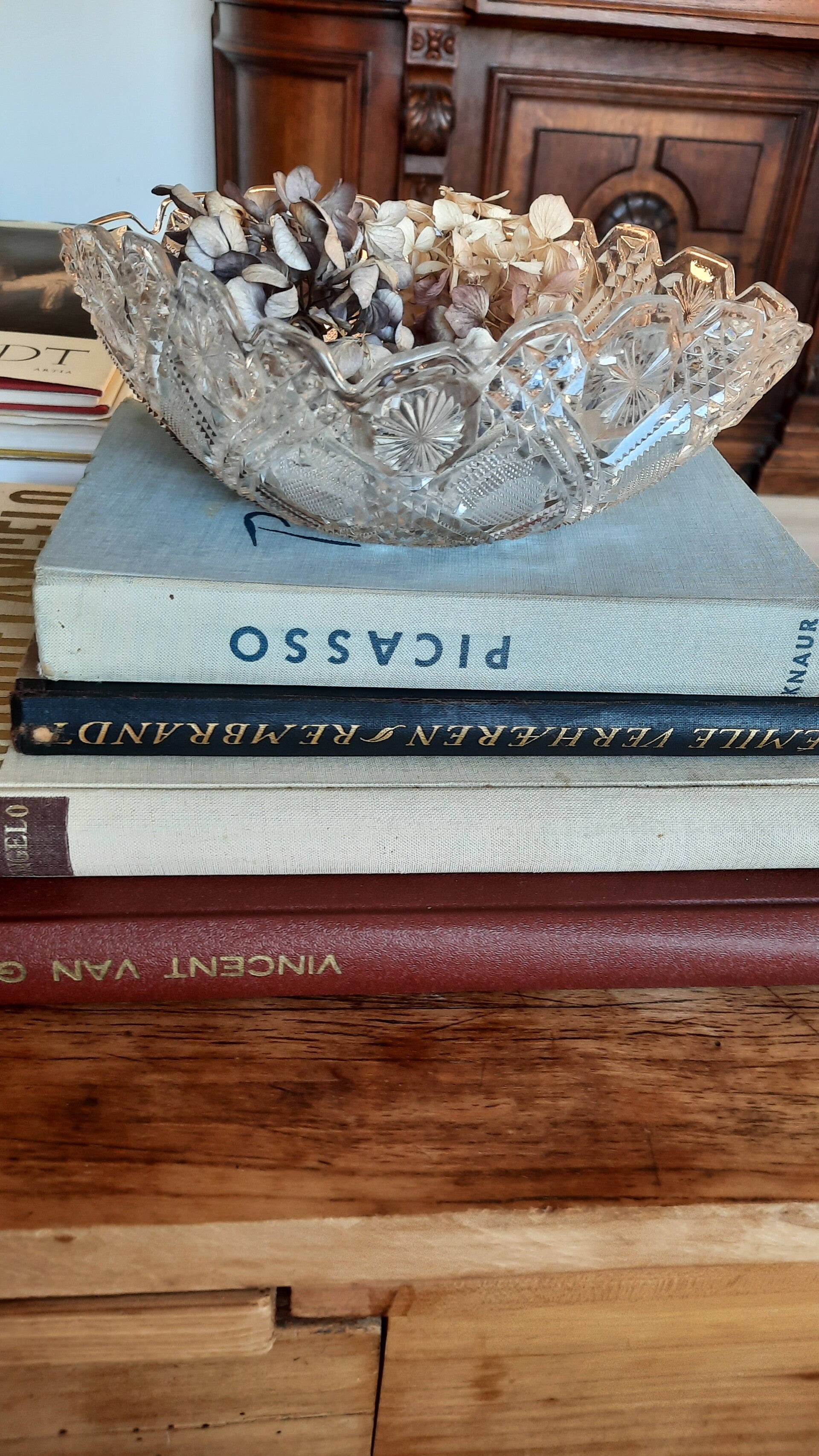 Beautiful vintage glass serving bowl with a curved edge and beautiful floral decorations, as well as a large star at the bottom.