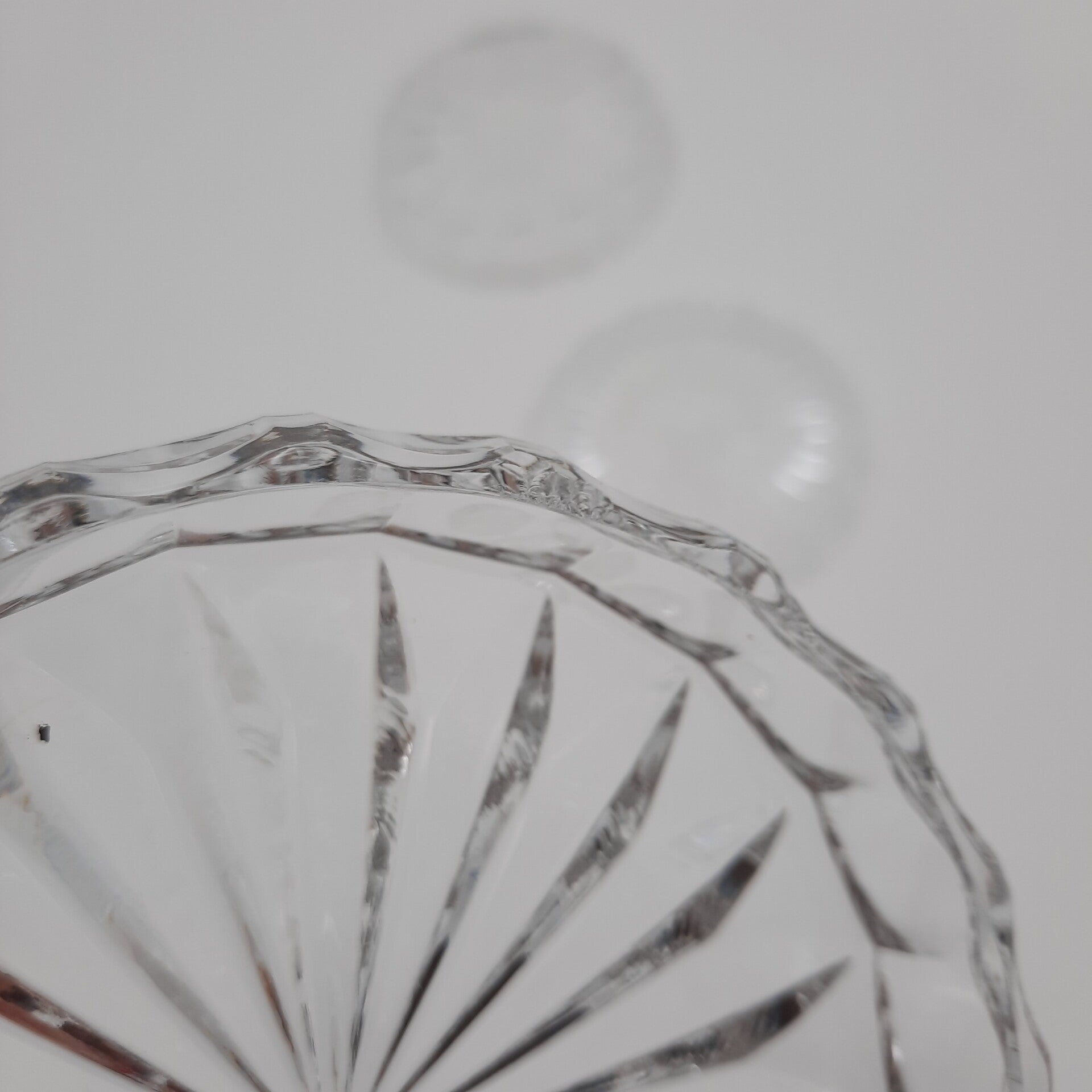 In very good condition. The big crystal coaster has tiny chips on the rim, and the glass dessert bowl has some scratches.