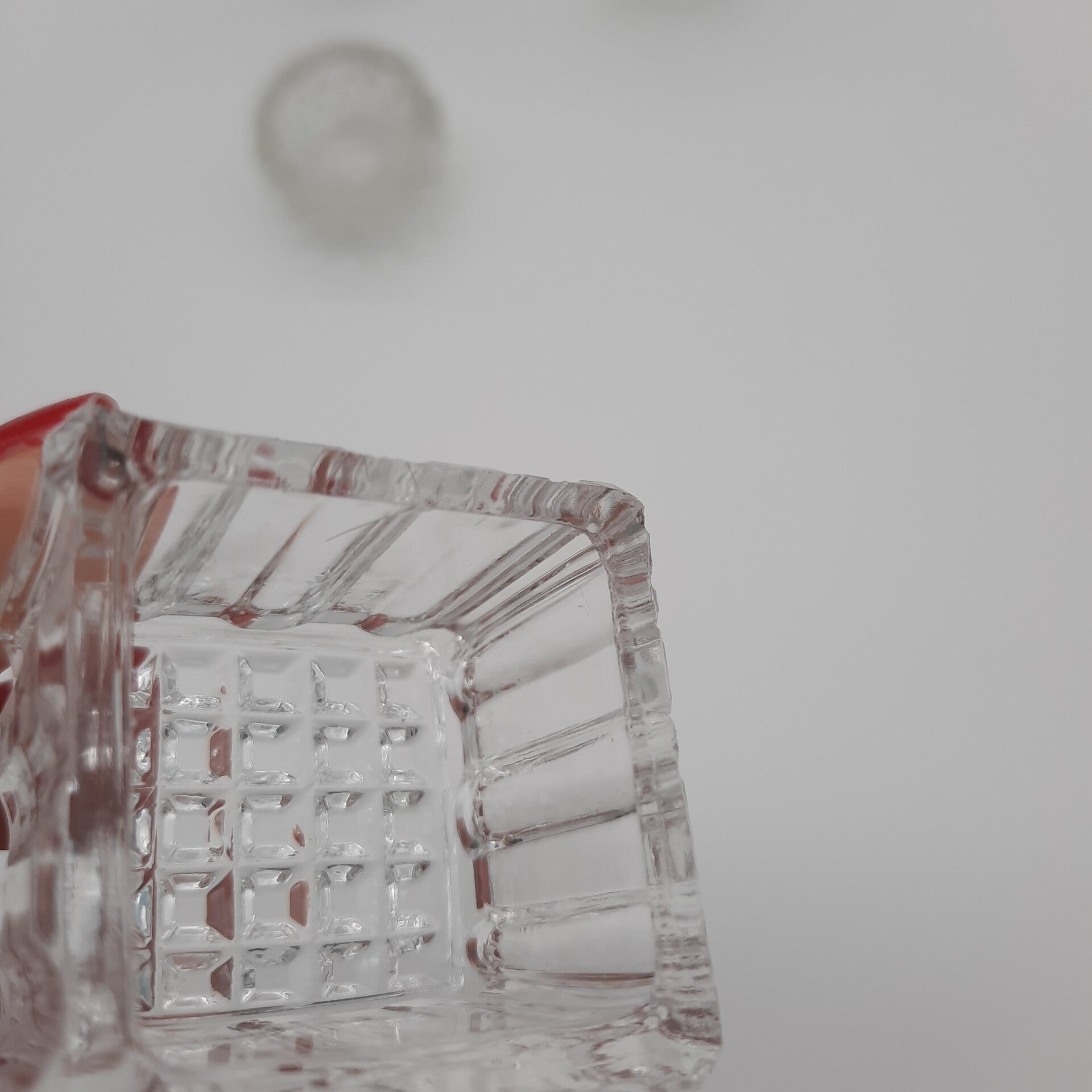In very good condition. The Toothpick-Cocktail Stick Holder has tiny chips on the rim, and the salt cellars also have tiny chips. The Round Salt Cellar has some scratches inside, the Square Salt Cellar has a small crack, and the Crystal Vase has tiny chips.