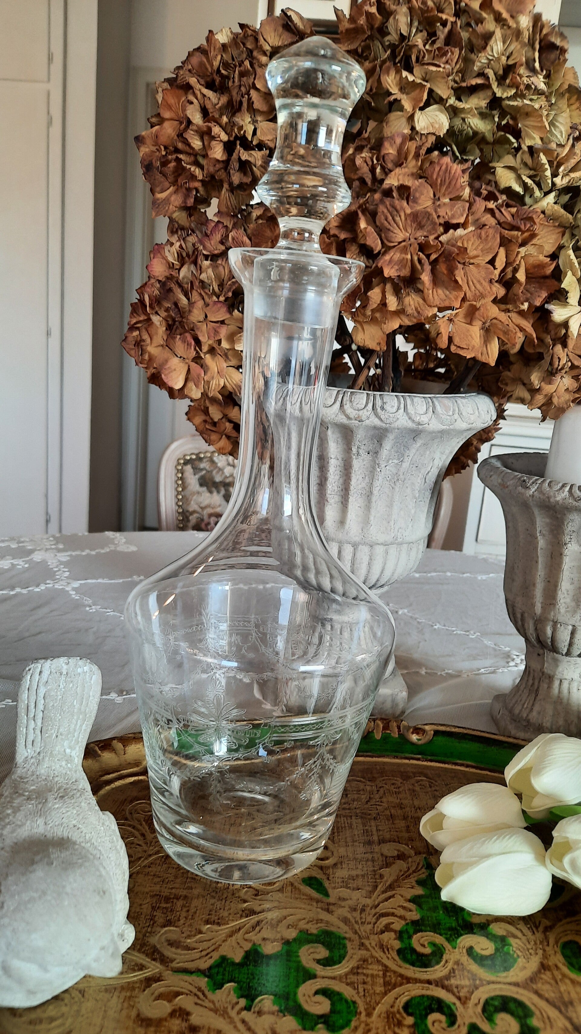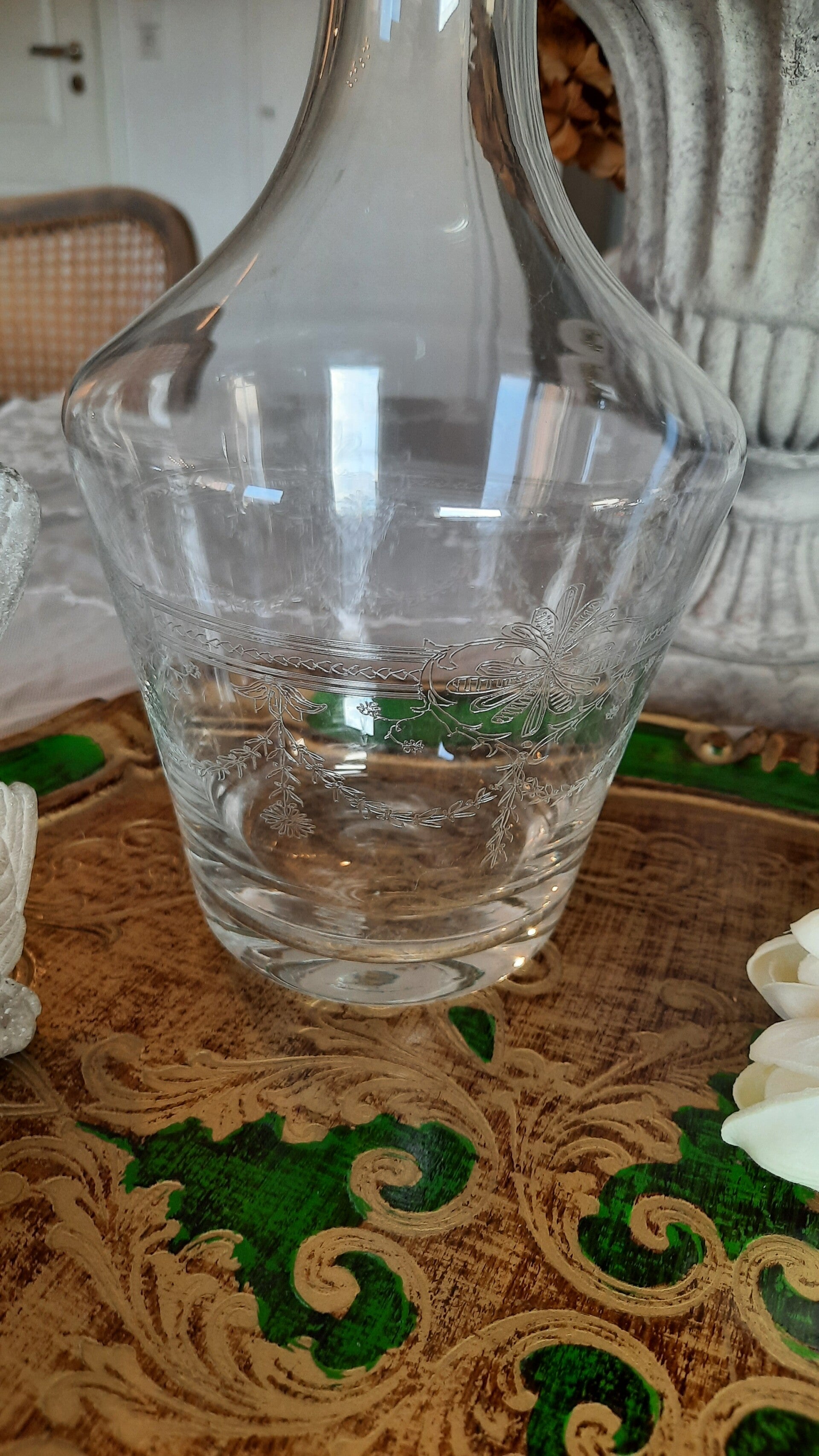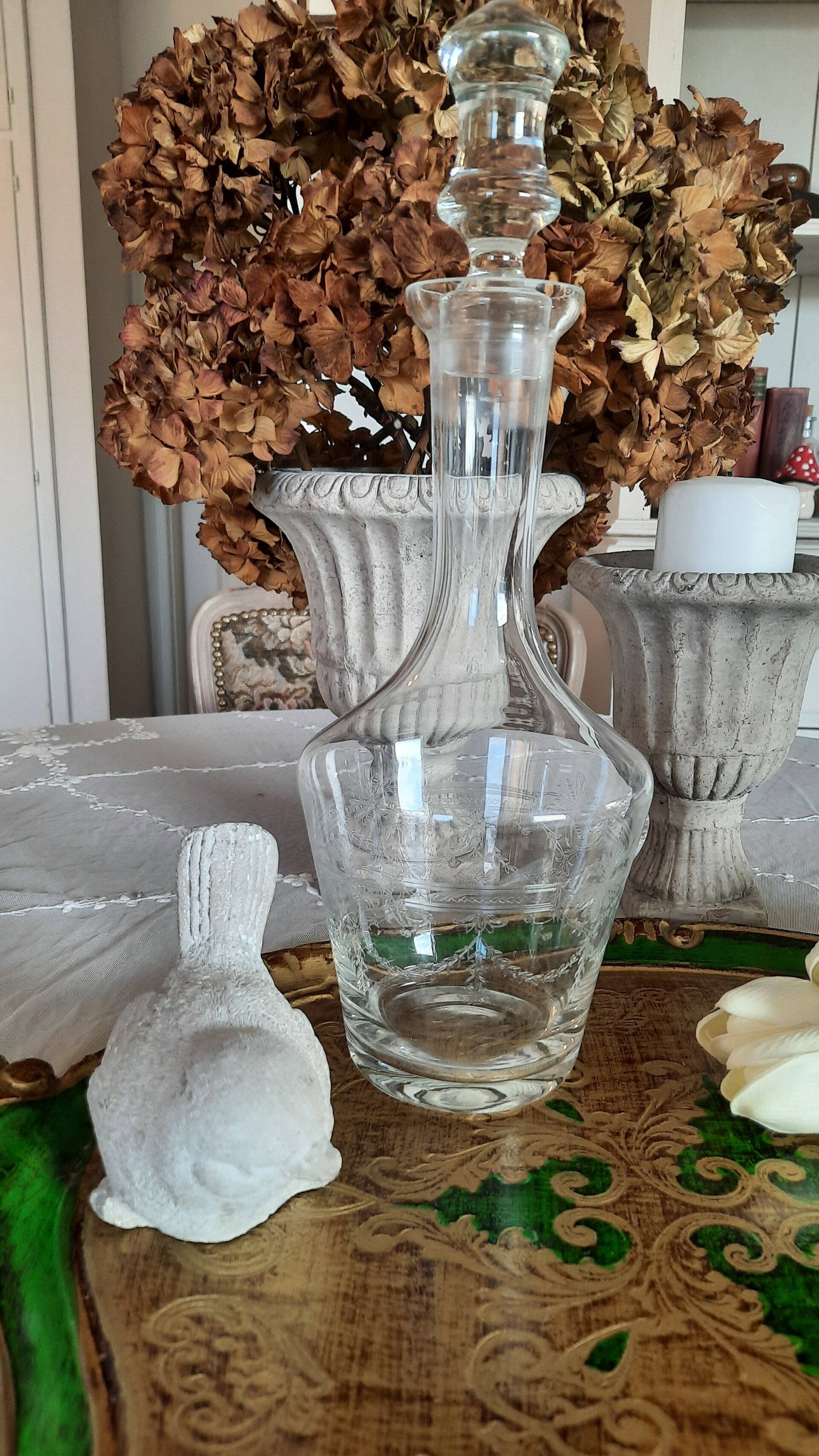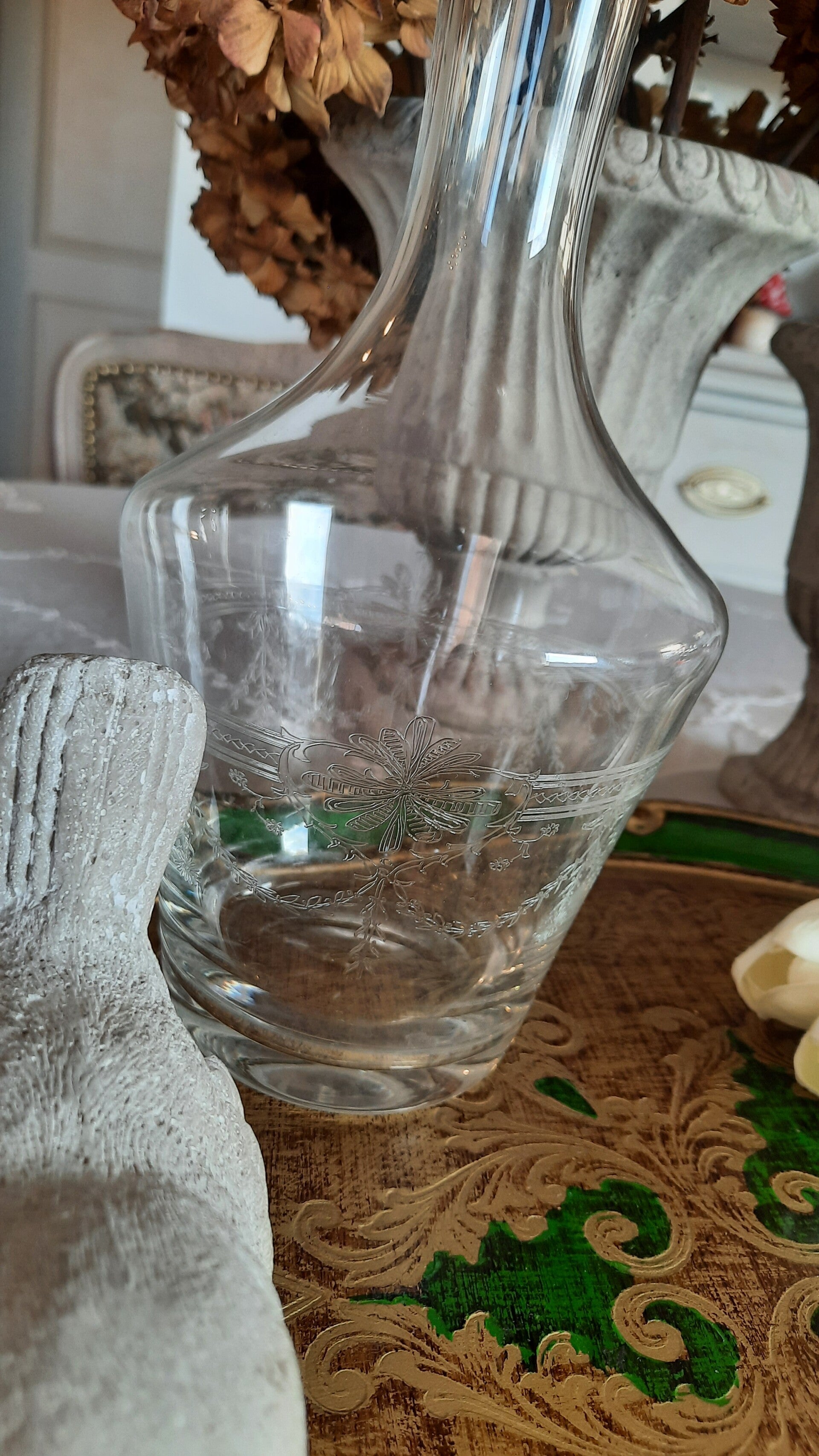 A beautifully vintage engraved glass wine carafe, perfect for adding charm to any collection or table setting.