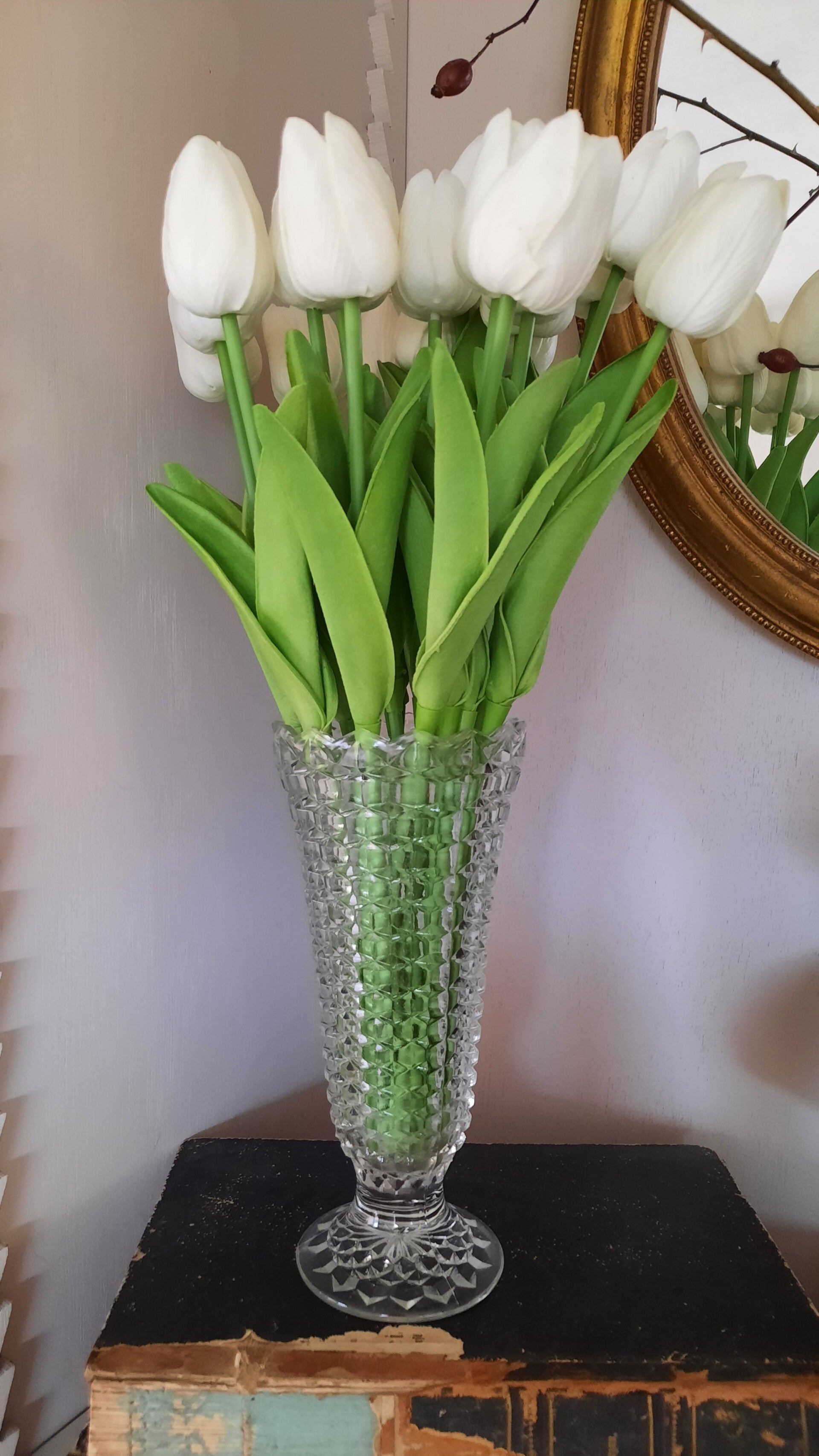 An elegant vintage pressed glass vase featuring a diamond point pattern.