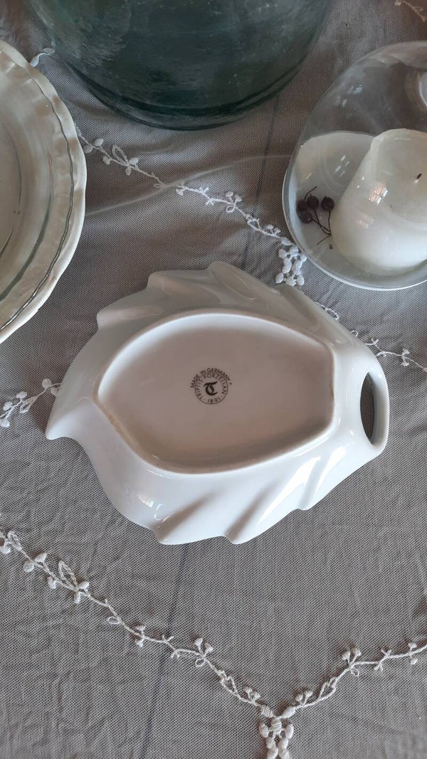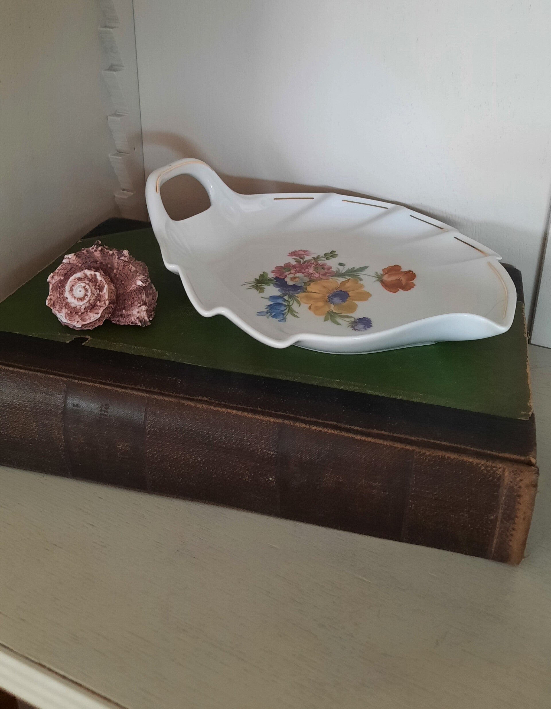 Vintage Porcelain Serving Bowl in Leaf Shape with Golden Rim and Flower Bouquet Pattern.This charming vintage porcelain serving bowl is crafted in the shape of a leaf, featuring a delicate flower bouquet pattern and an elegant golden rim. The bowl includes a handle and raised details, adding both beauty and functionality. It is marked on the bottom with Triptis Porzellan - 1891 Made in Germany, indicating its rich heritage and craftsmanship.