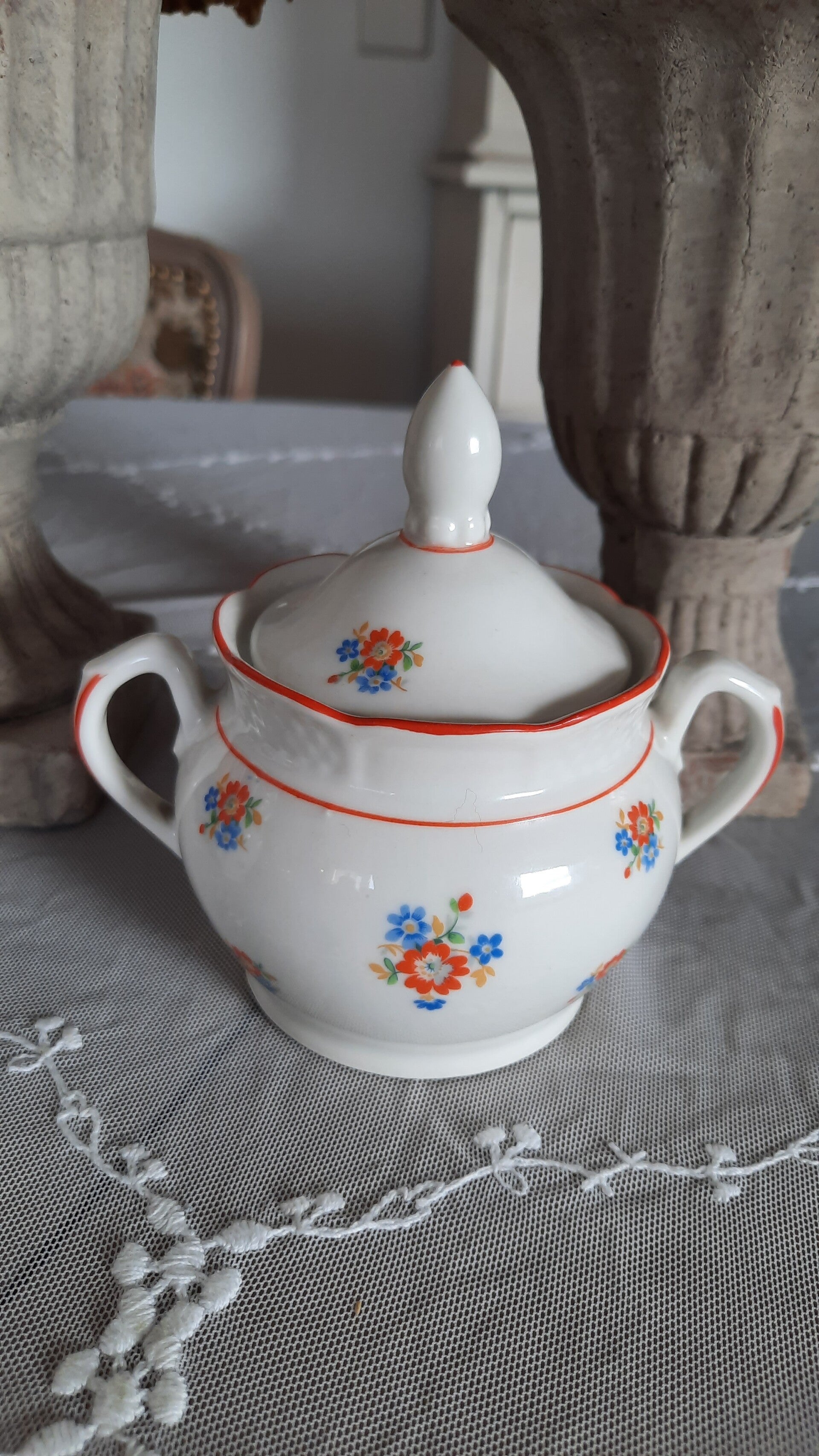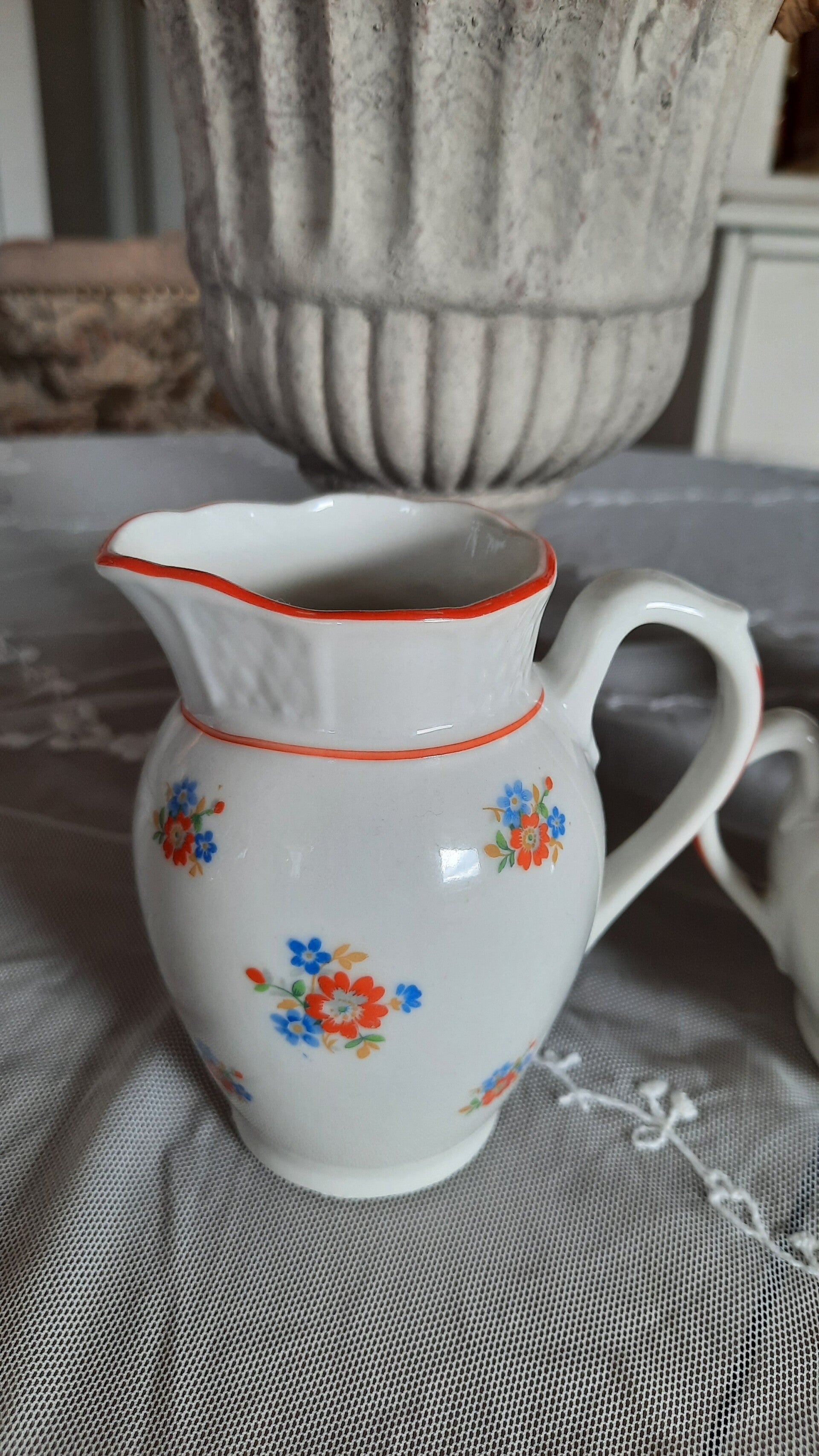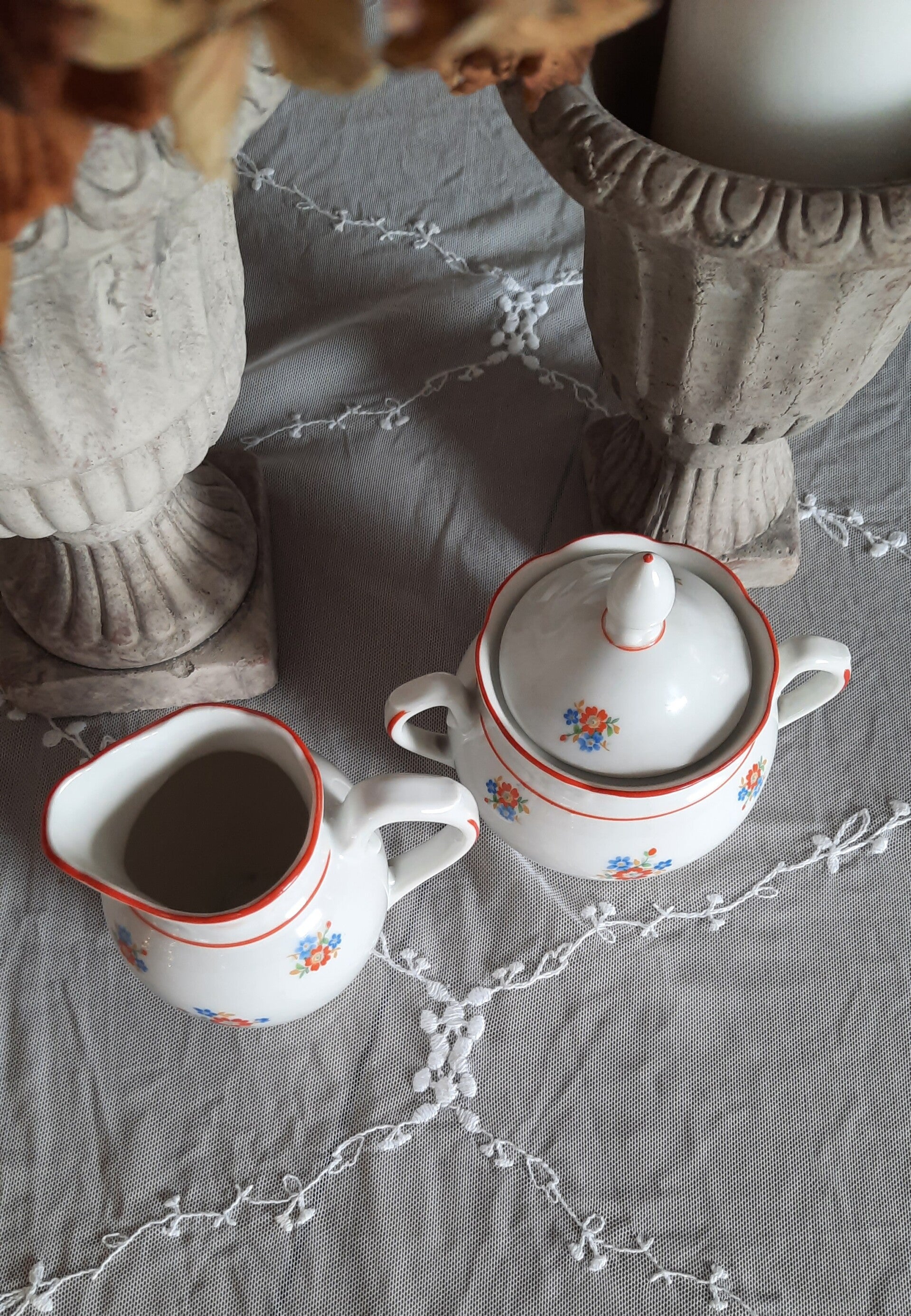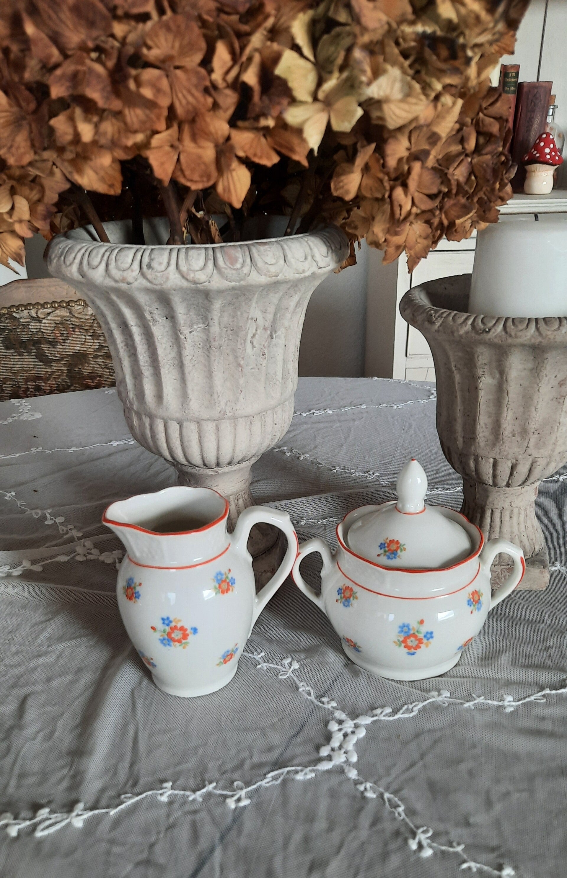 Beautiful Vintage Sugar Bowl and Creamer with Flower Pattern and Raised Details.This charming vintage sugar bowl and creamer set features a delicate flower pattern and intricate raised details, adding a touch of vintage elegance to any table. The pieces are designed with fine craftsmanship, showcasing both beauty and functionality.