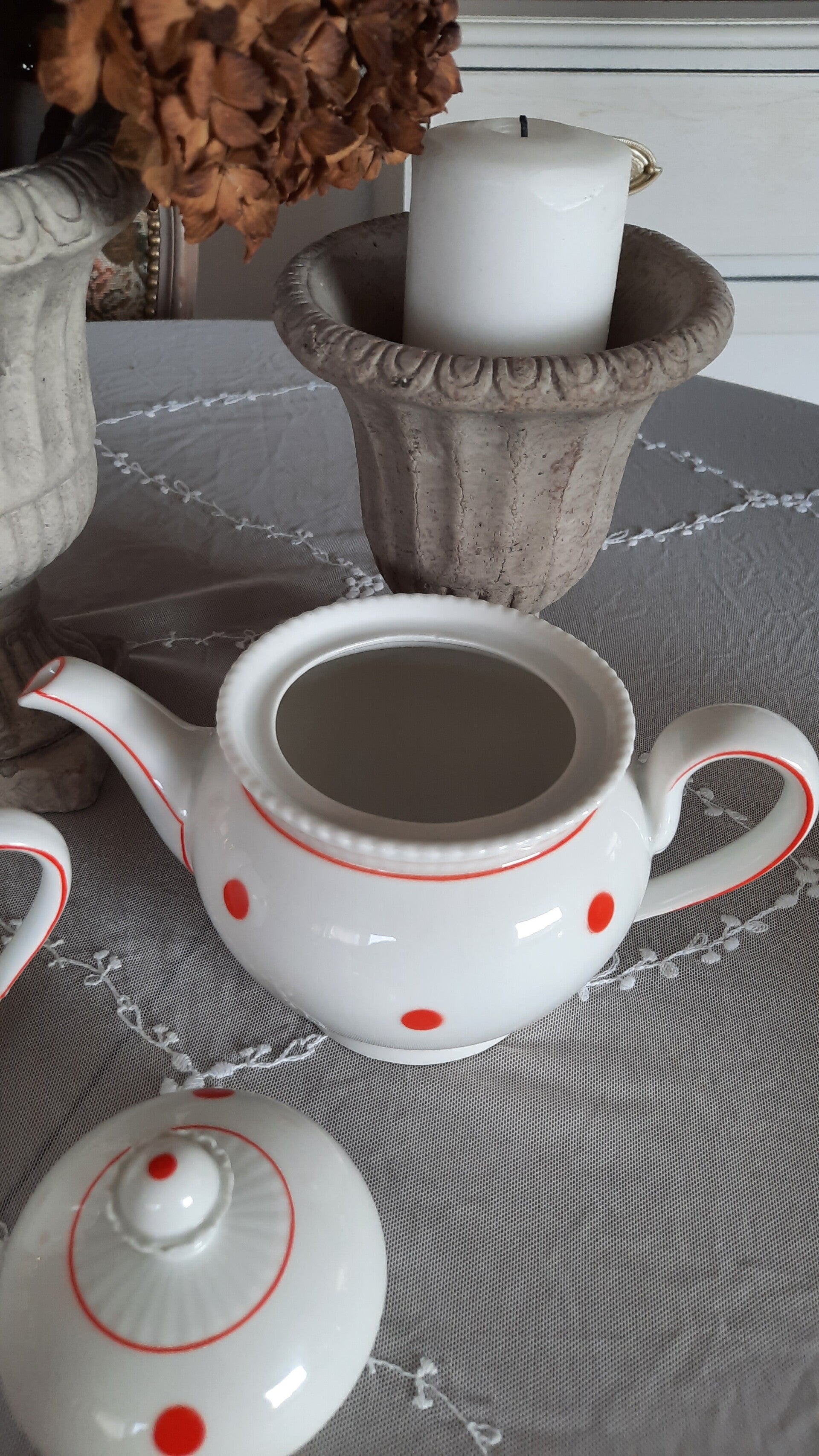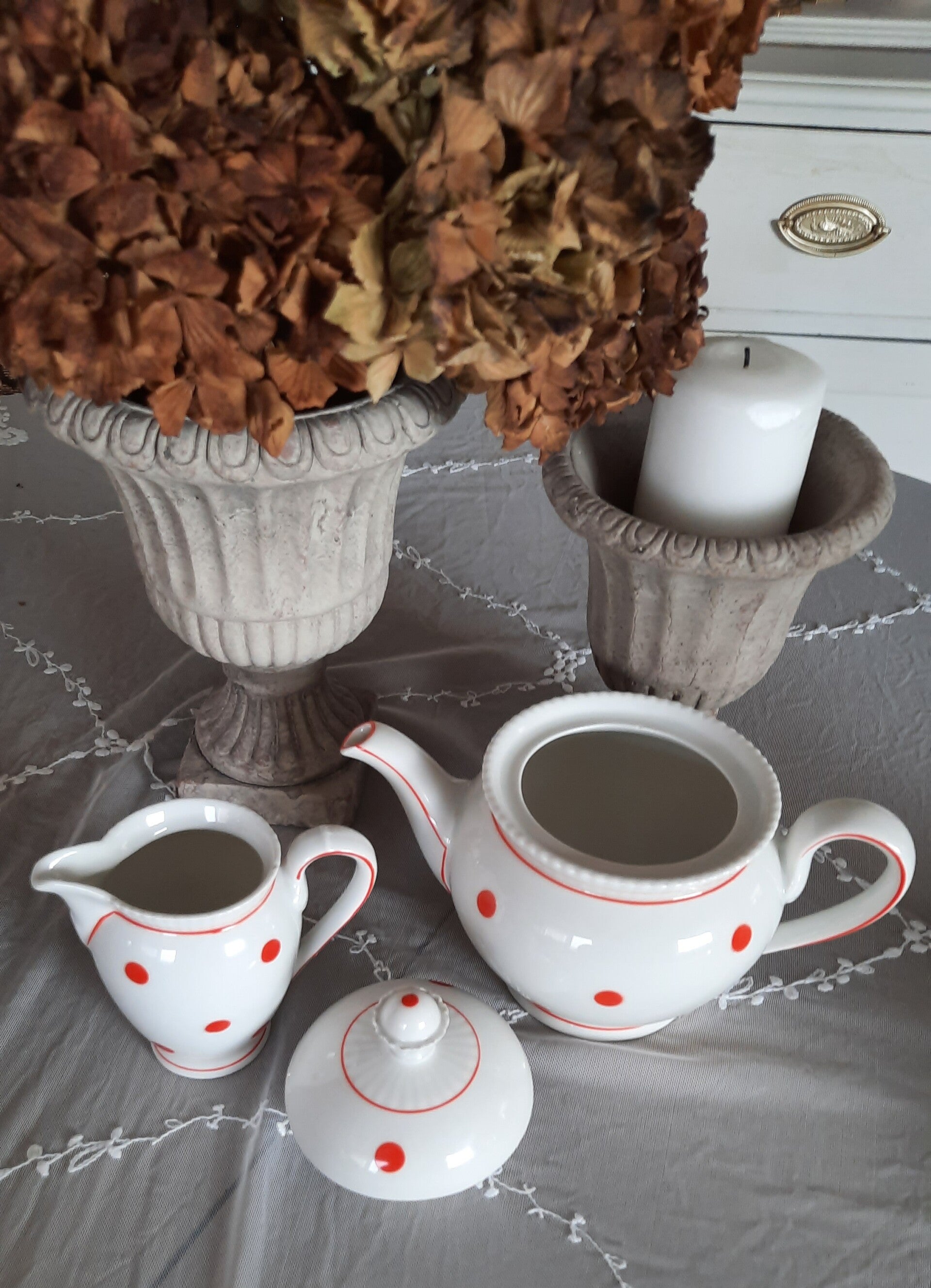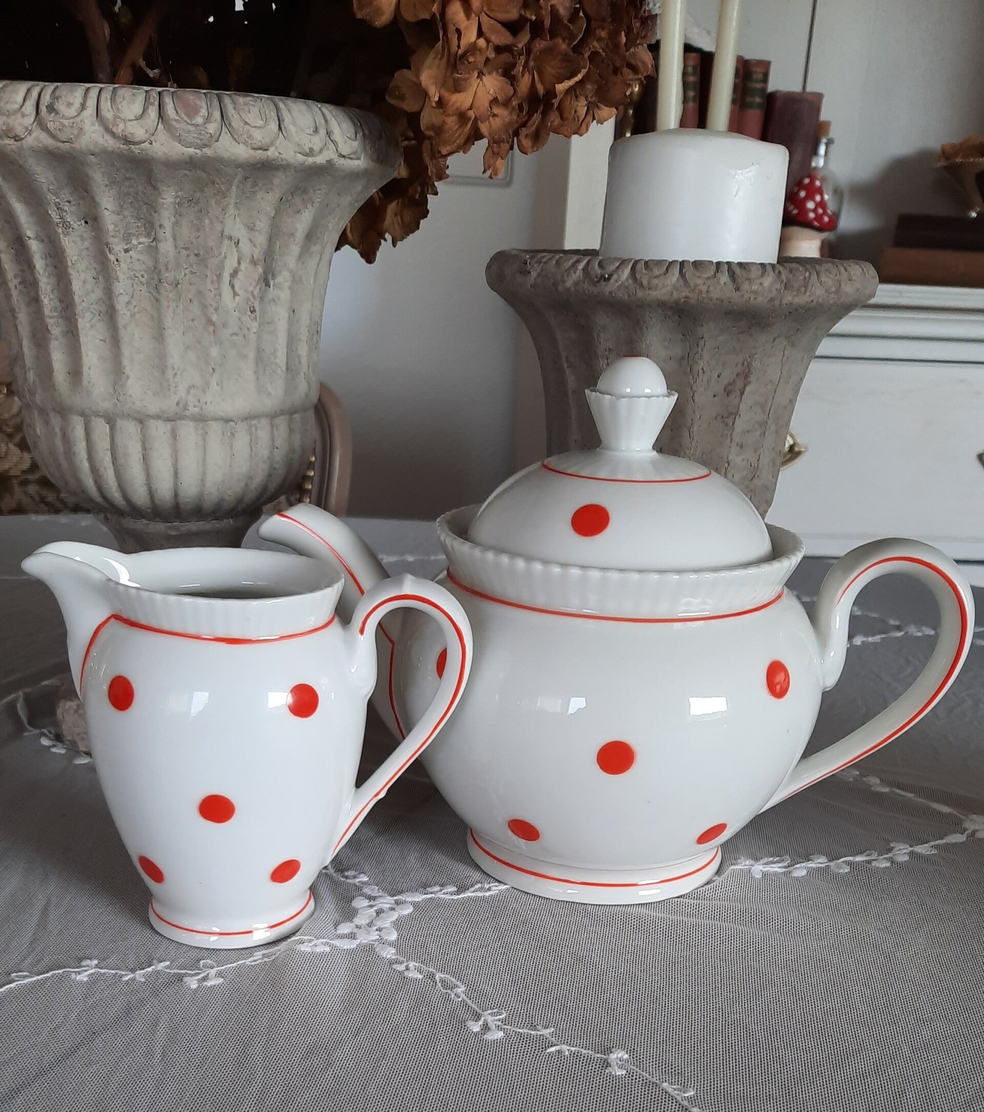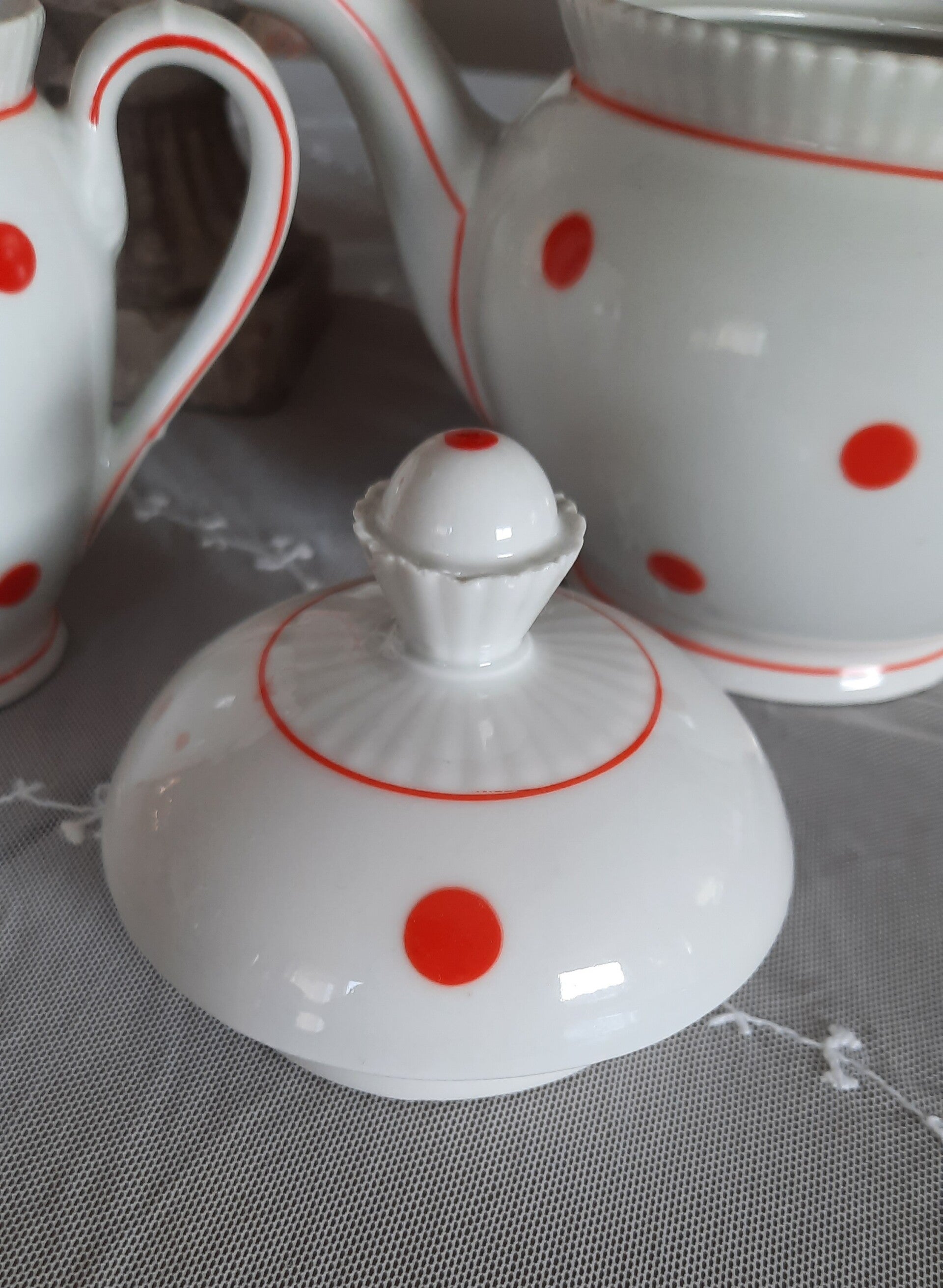 This charming vintage teapot and creamer set, crafted from fine porcelain, features playful red polka dots and delicate raised details. Its whimsical design and bright colors make it a standout piece for any tea lover or collector.