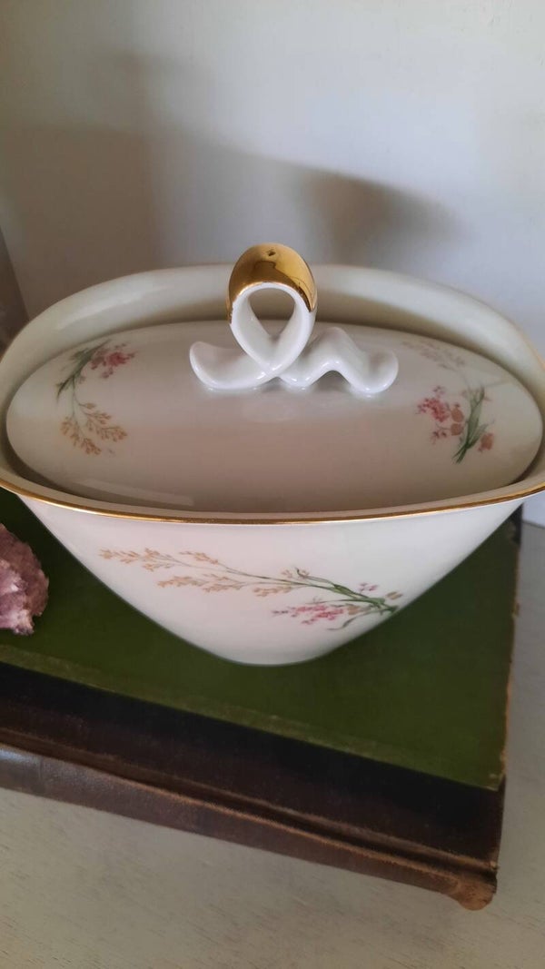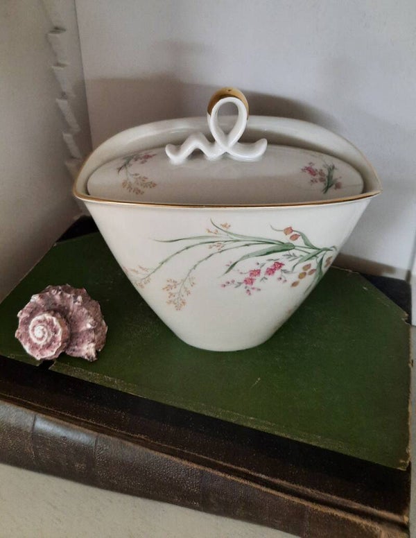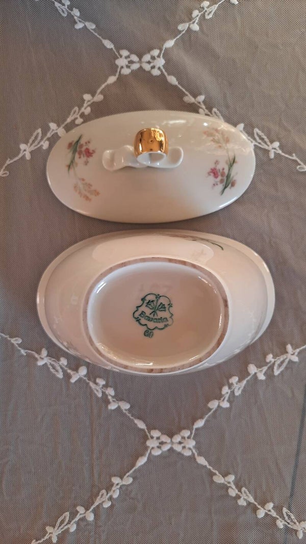 Lovely Vintage Candy Bowl with Lid in Cream Color and Flower Pattern. This charming vintage candy bowl features a soft cream color with a delicate flower pattern, crafted from fine porcelain. It is marked on the bottom with Bavaria, a symbol of quality craftsmanship. The bowl comes with a matching lid, making it not only functional but also a beautiful decorative piece for any room.
