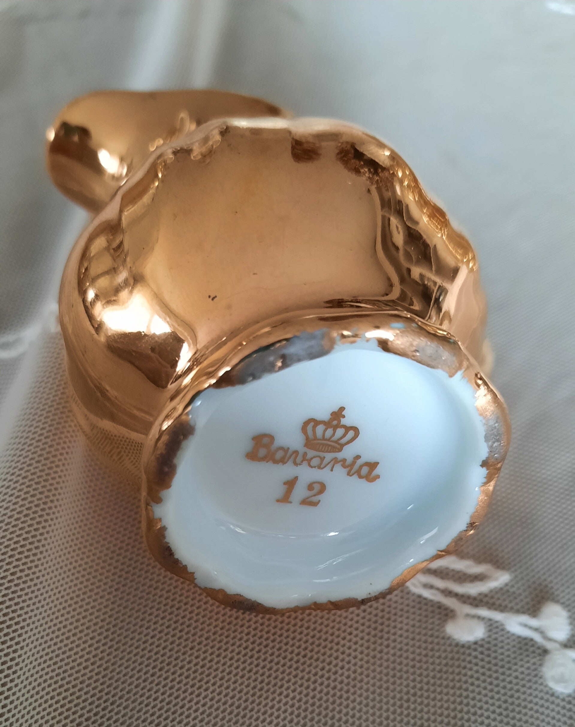 This elegant mocha service set includes a teapot, matching sugar bowl, and creamer, all crafted from vergoldet porcelain (gold-plated porcelain). Each piece is delicately marked on the bottom with Bavaria, signifying its quality craftsmanship. The set is perfect for serving mocha, espresso, or small tea portions, with luxurious detailing that adds a sophisticated touch to any occasion.