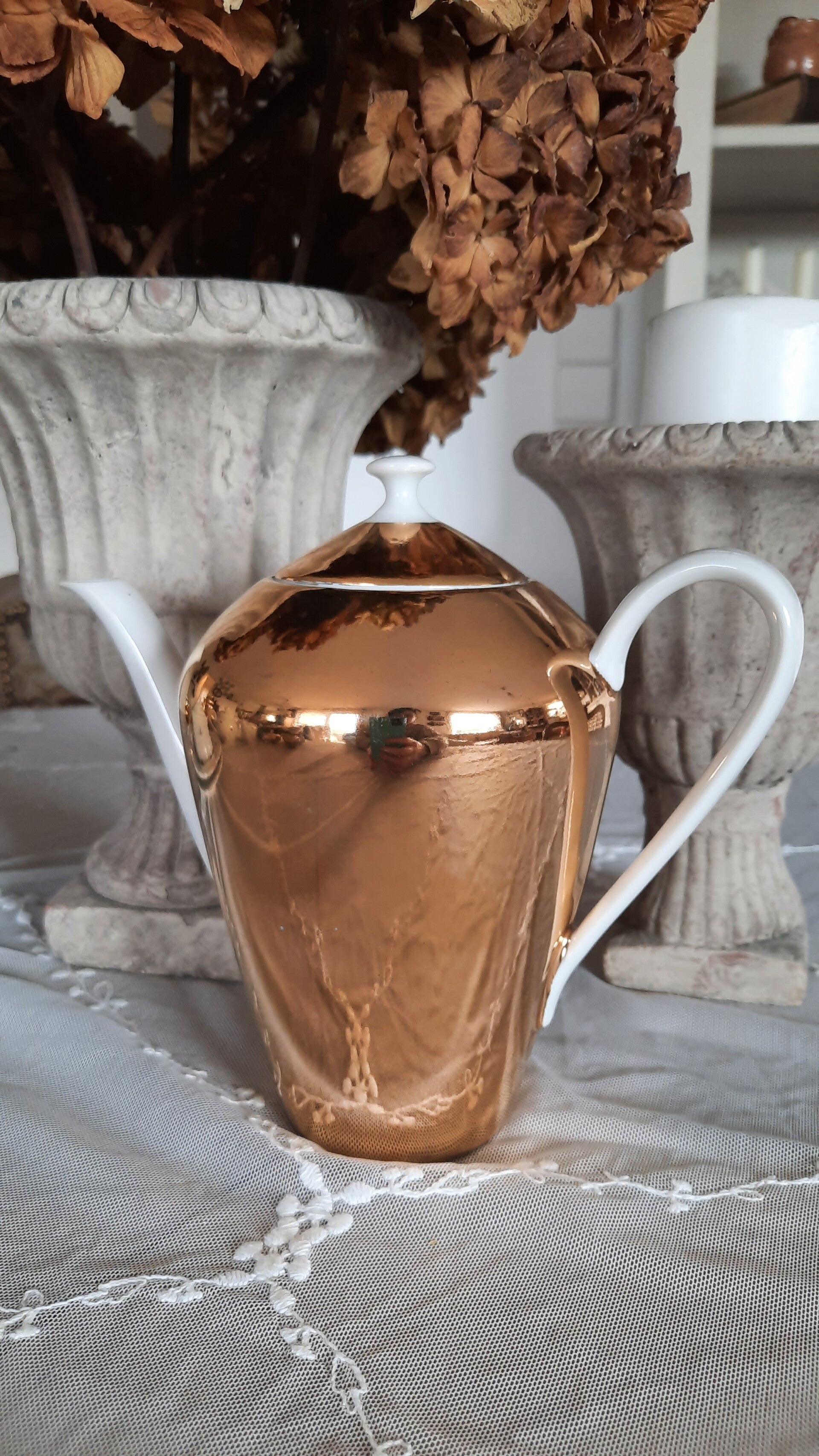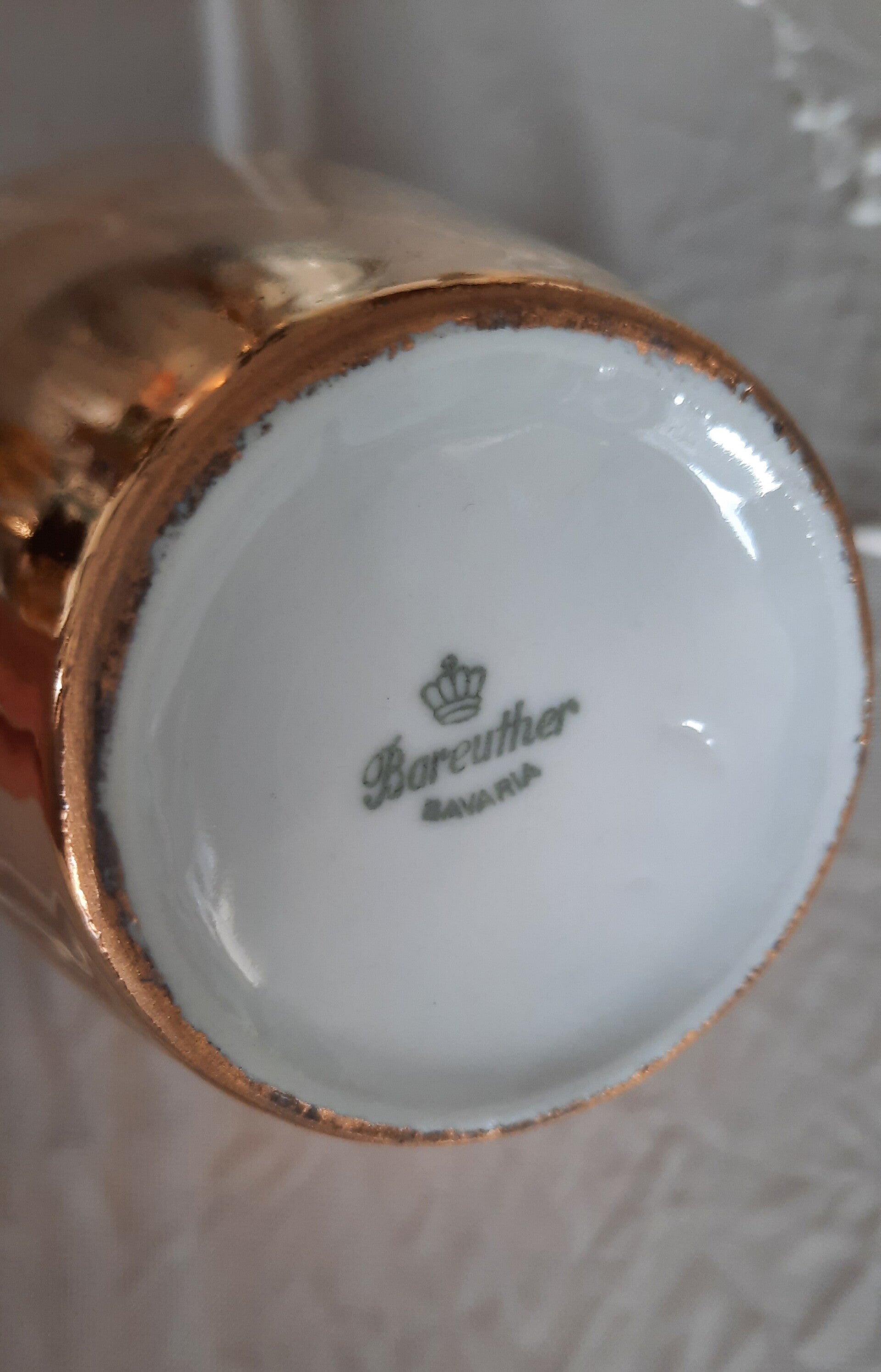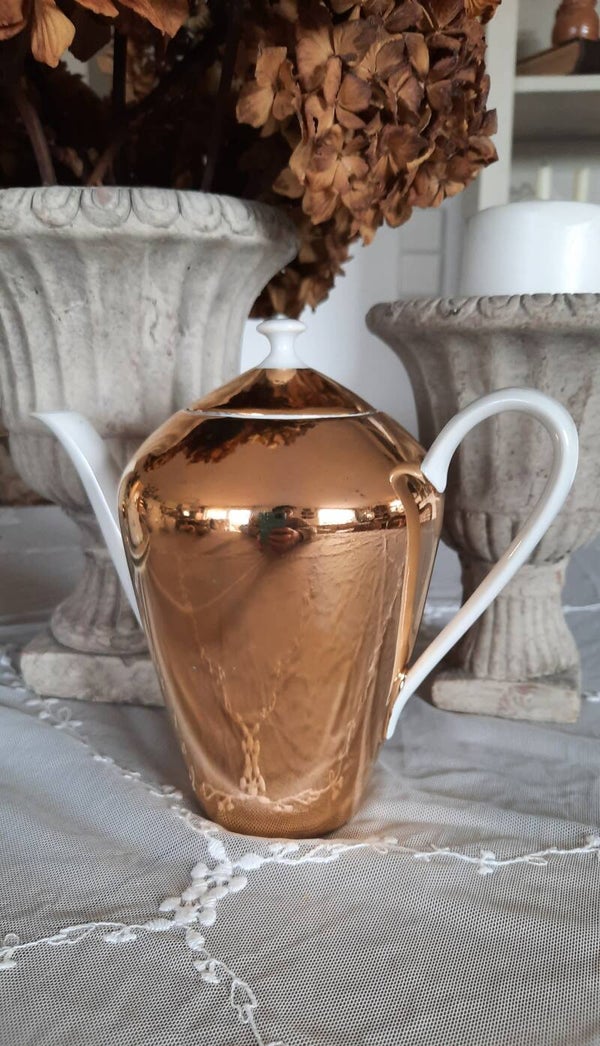 This charming vintage mocha teapot features a rich gold color with a contrasting white spout and handle. Marked on the bottom with Bareuther Bavaria, a renowned maker of high-quality porcelain, this teapot exudes elegance and timeless appeal. Perfect for serving your favorite mocha, espresso, or tea, it combines functionality with classic beauty.