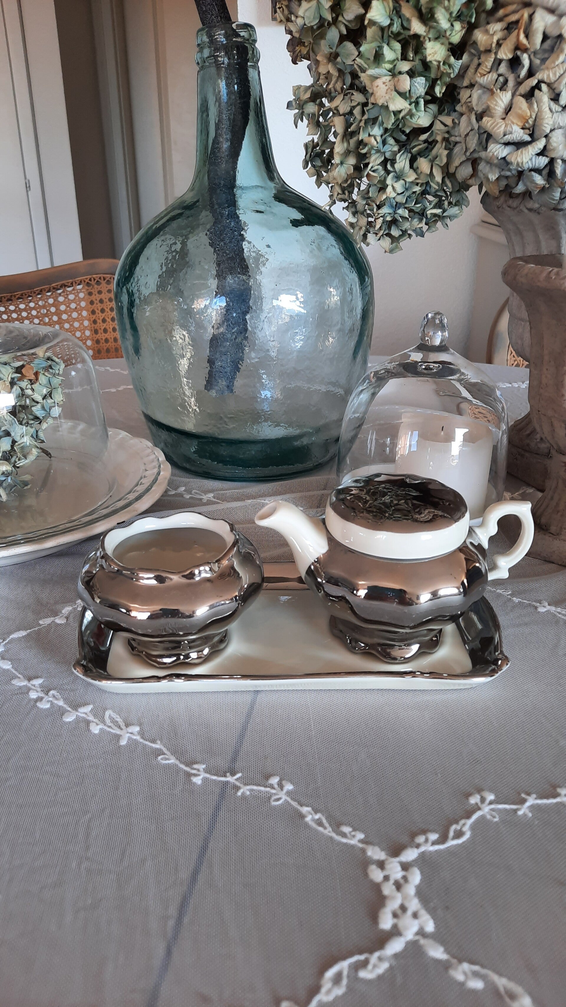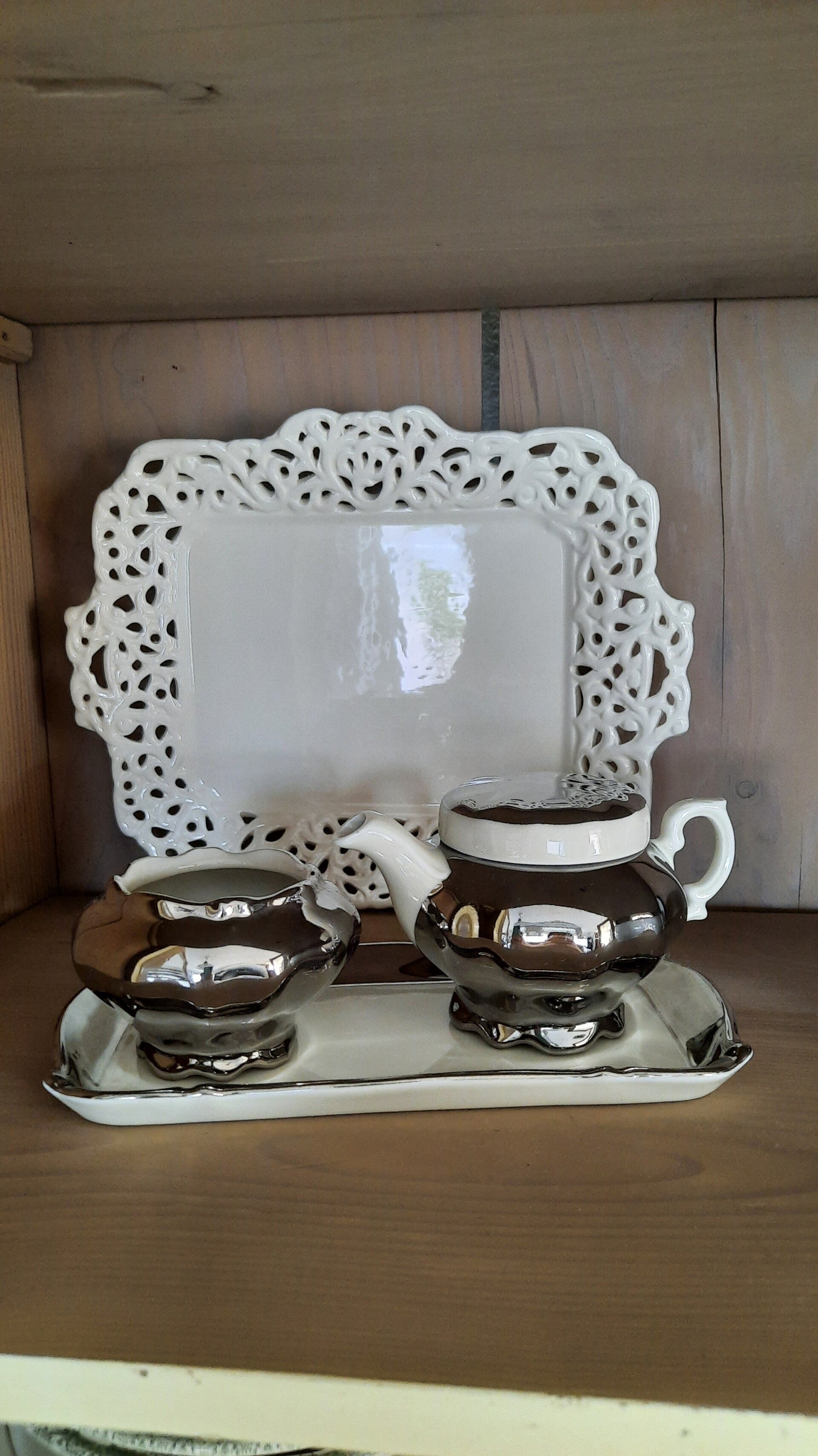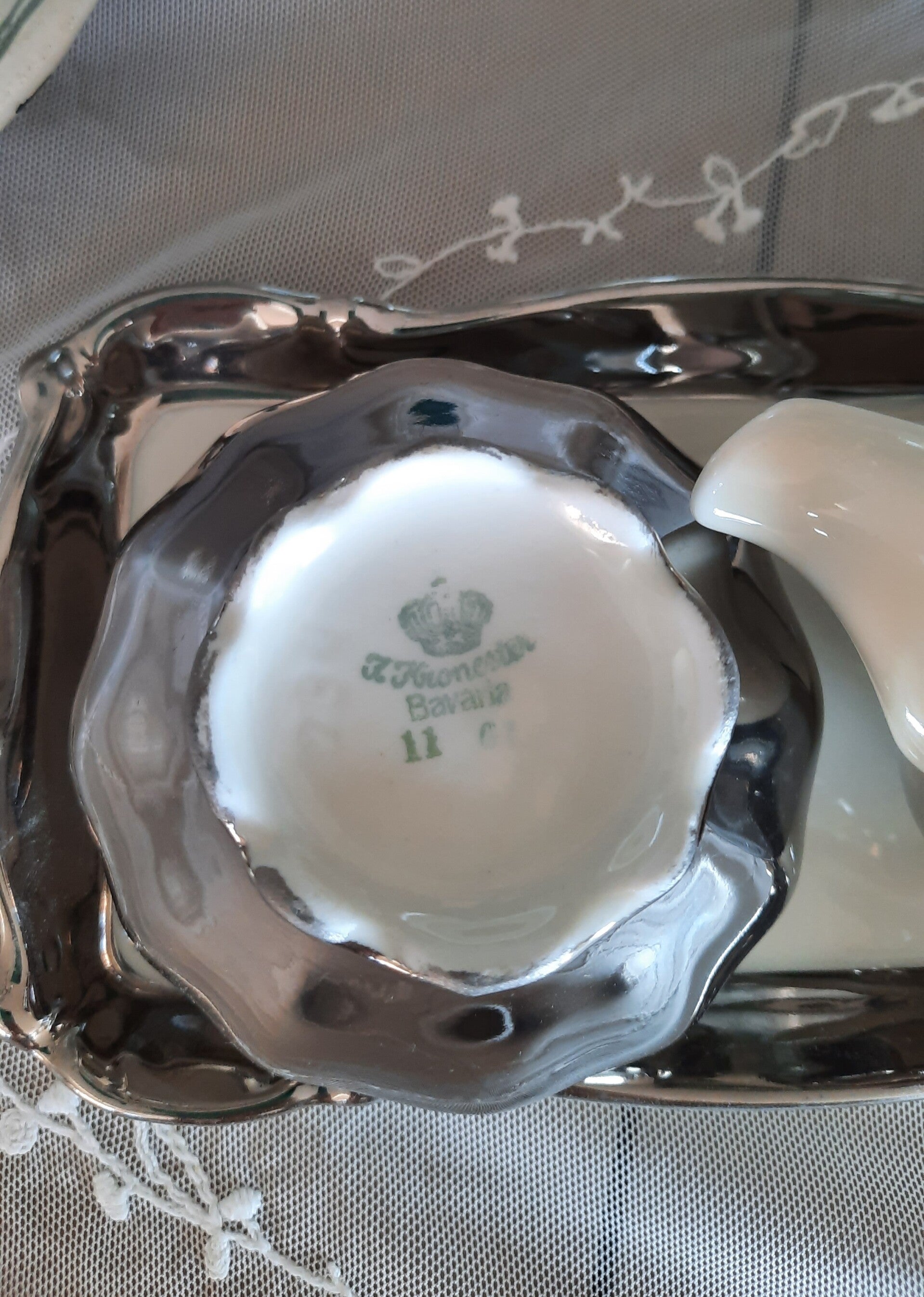 A lovely porcelain set consisting of a milk jug with lid, sugar bowl, and matching tray in silver and white. From the 1950s. Marked on the bottom: J. Kronester Bavaria.