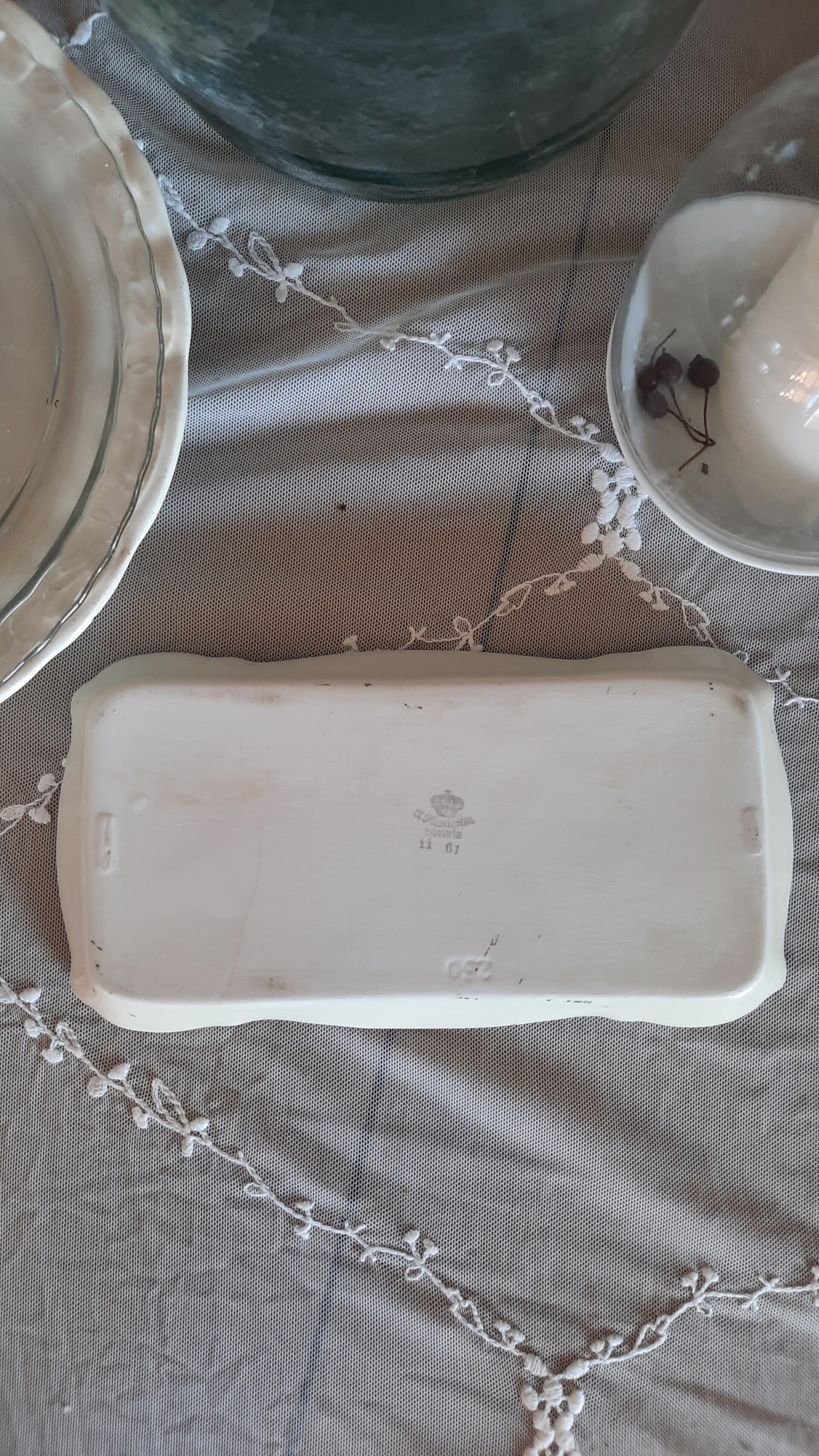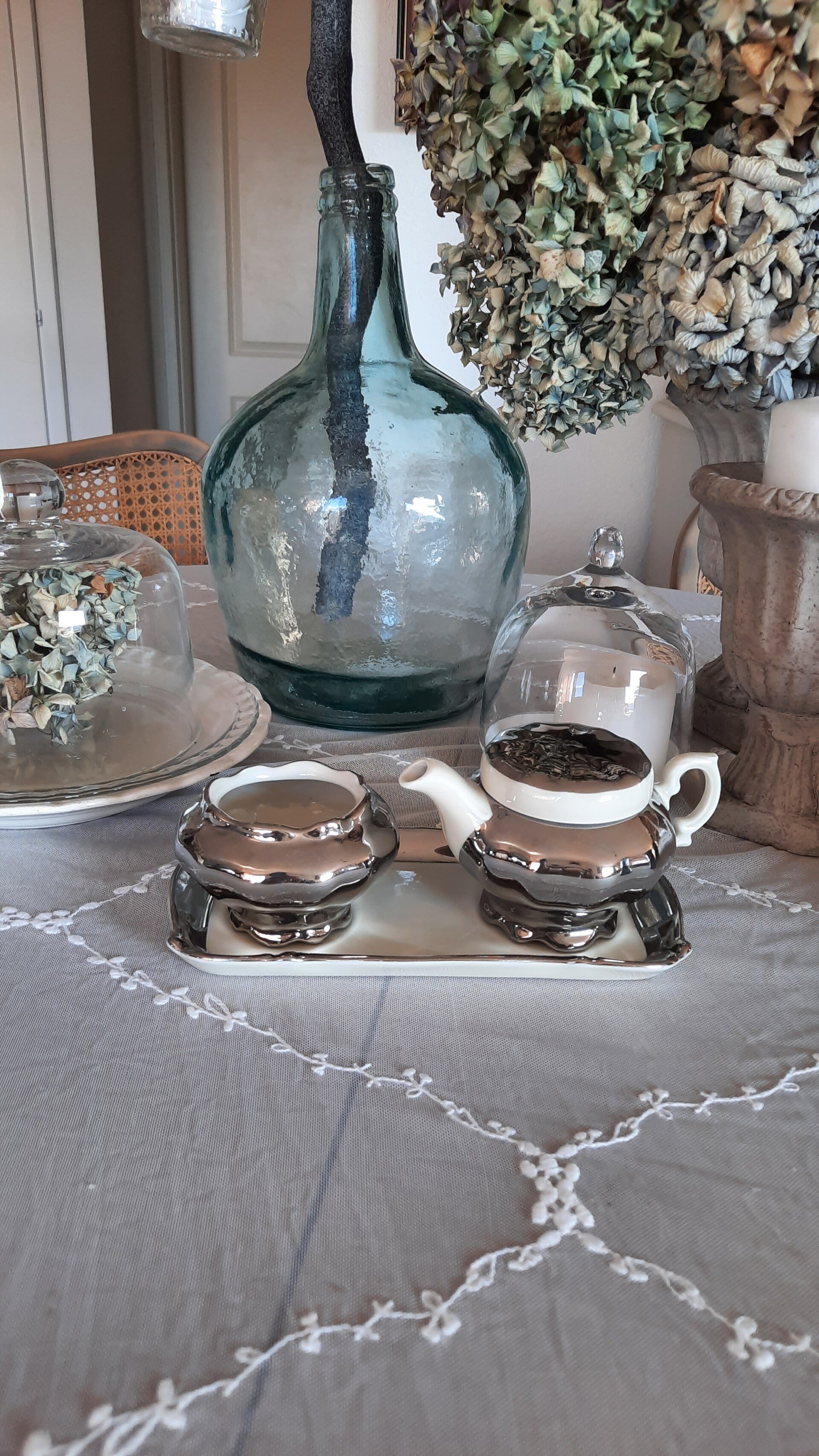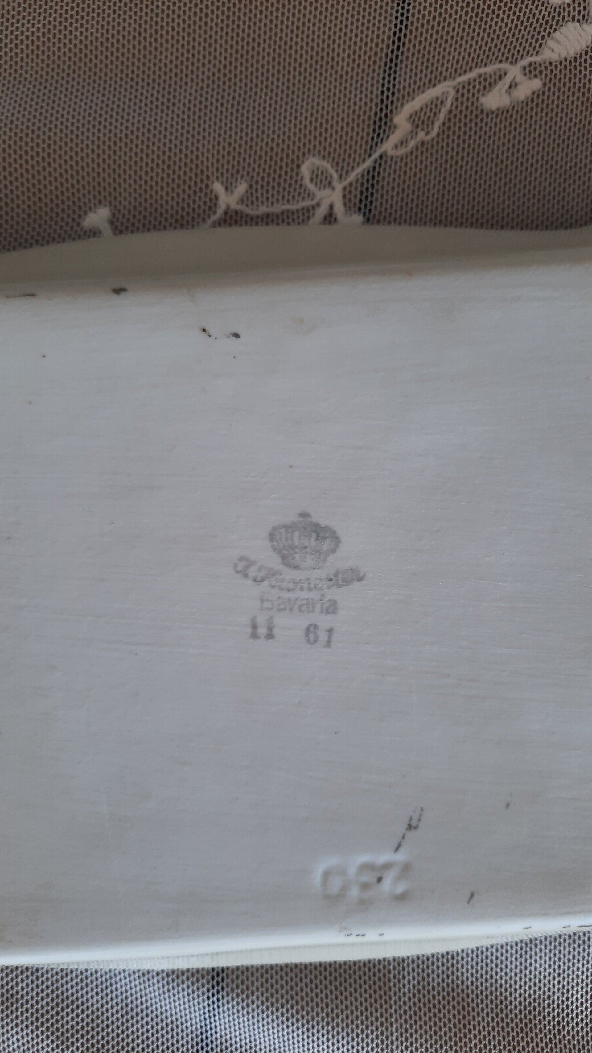 A lovely porcelain set consisting of a milk jug with lid, sugar bowl, and matching tray in silver and white. From the 1950s. Marked on the bottom: J. Kronester Bavaria.