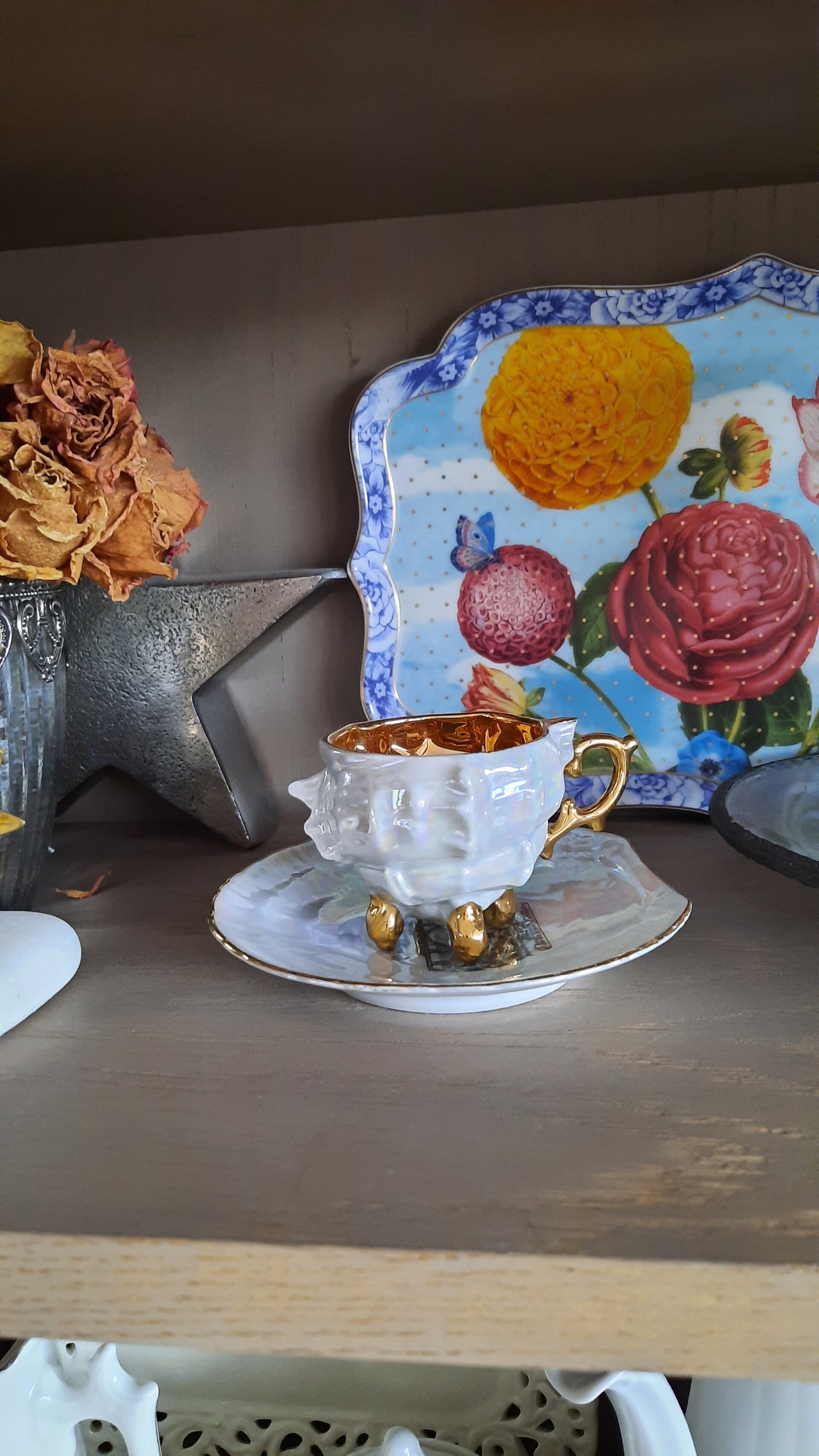 Elegant Iridescent Gilded Cup and Saucer in Seashell Shape
