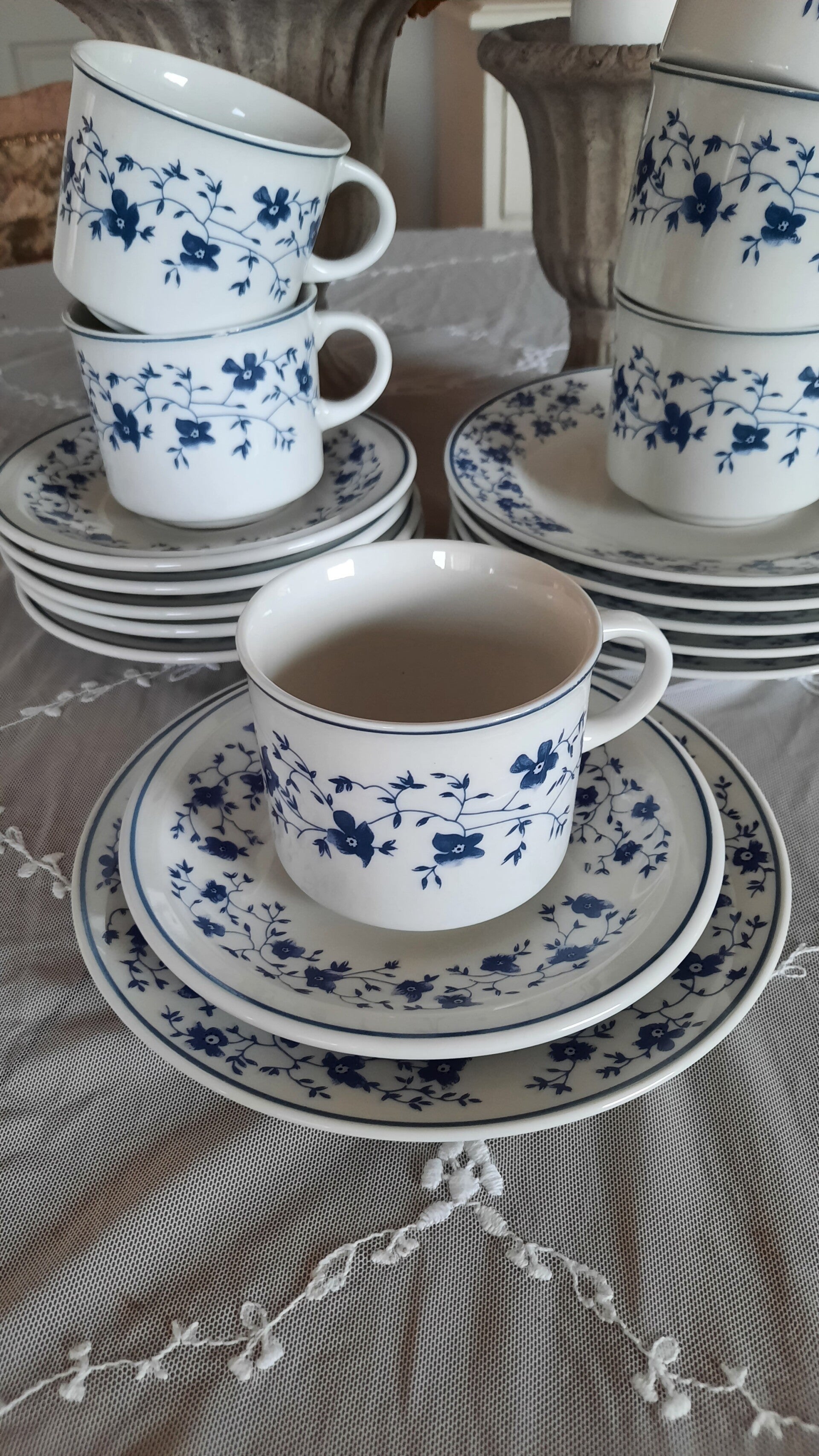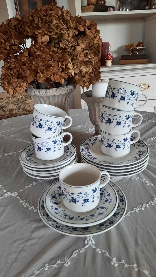 In very good used condition with no chips, cracks, or crazing. One cup has a tiny chip on the rim, barely visible. There is also some minor wear to the blue decoration on the rim of a cup, which is barely noticeable.