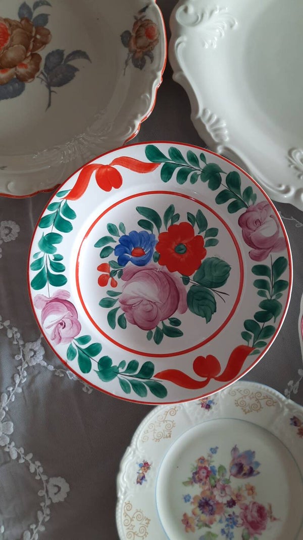 A gorgeous vintage pottery plate with a beautiful floral pattern. It is handmade with a hand-painted design. There is a cord on the back for wall hanging. Marked on the bottom: GRANIT, made in Hungary.