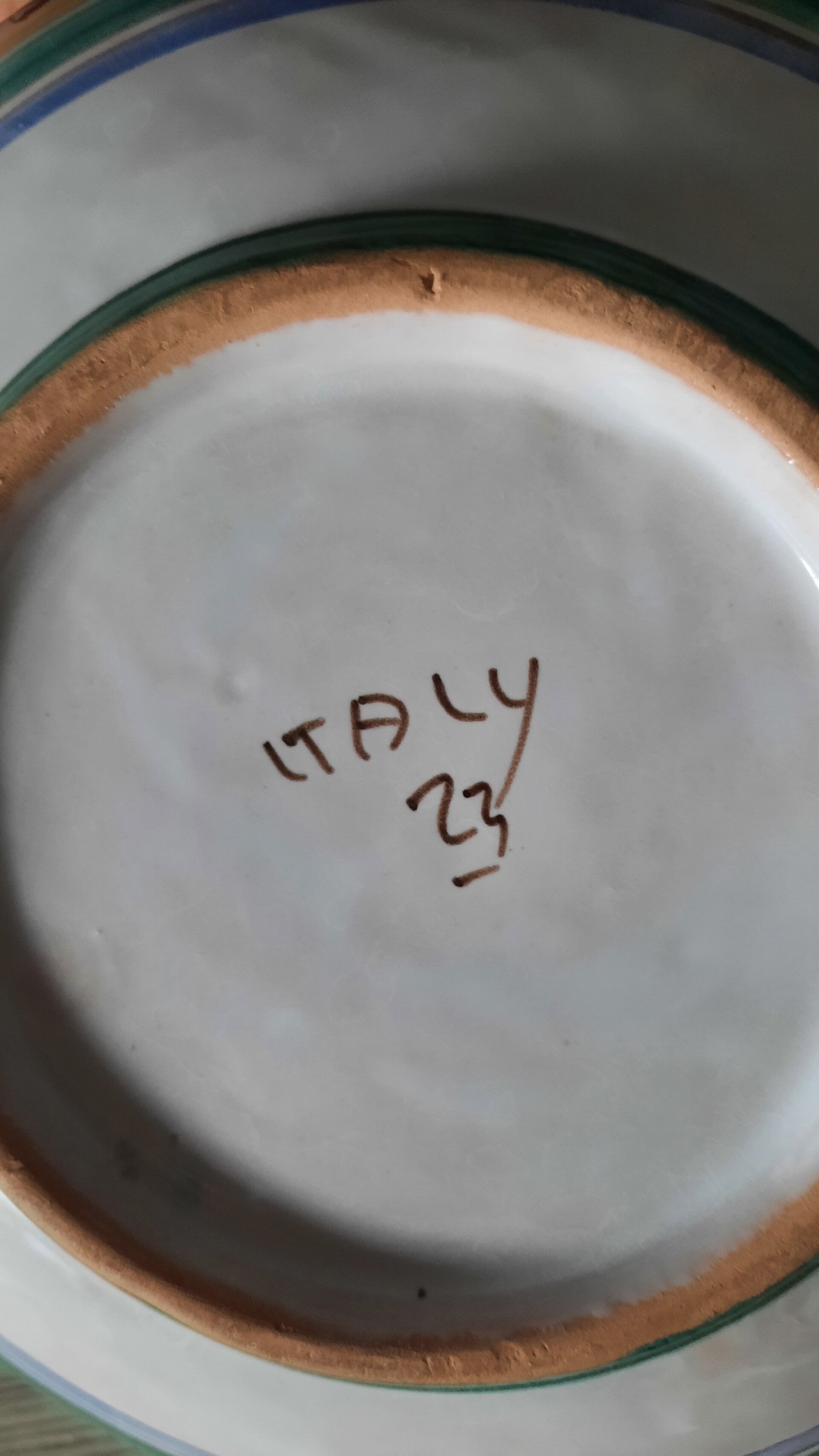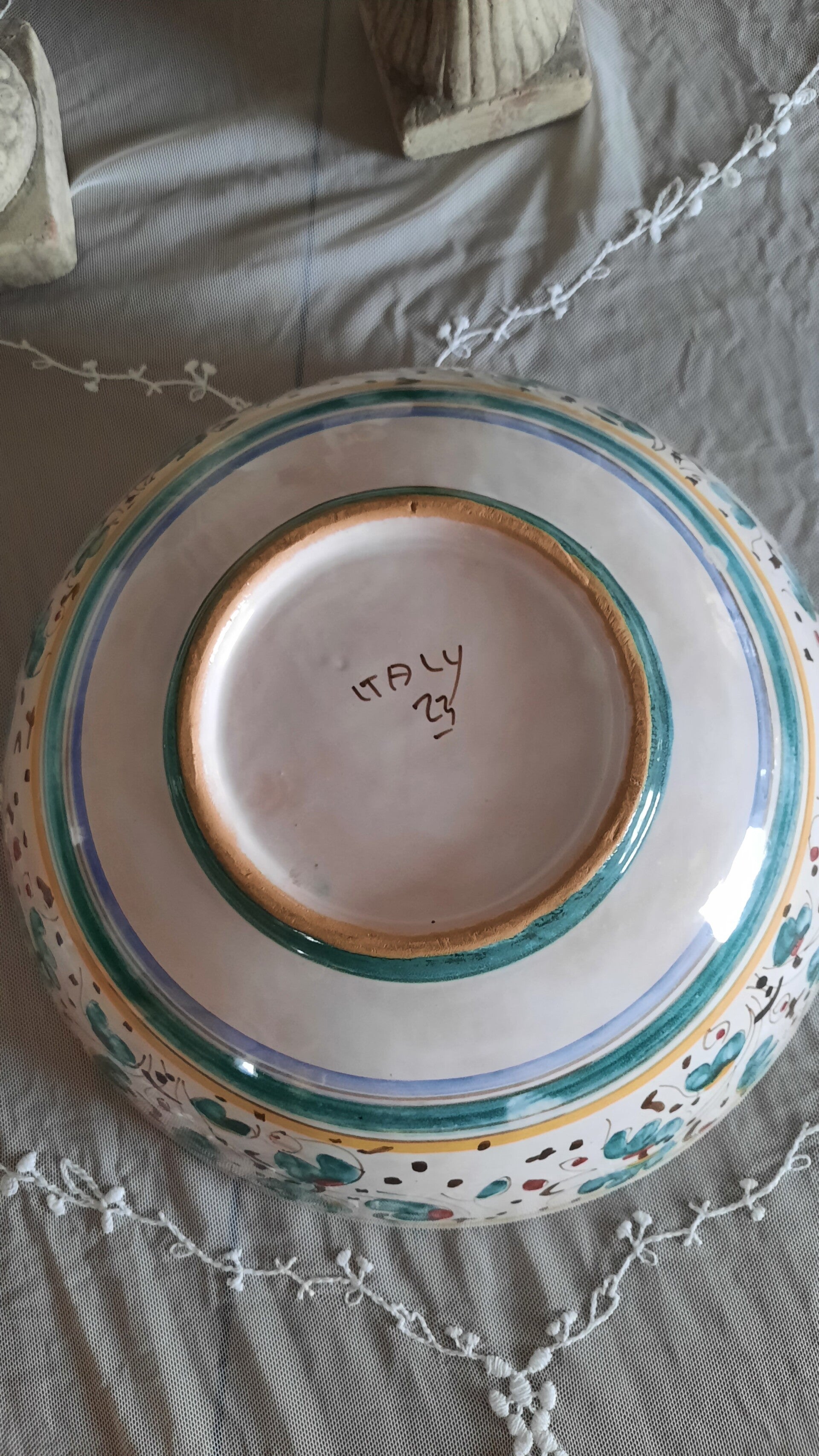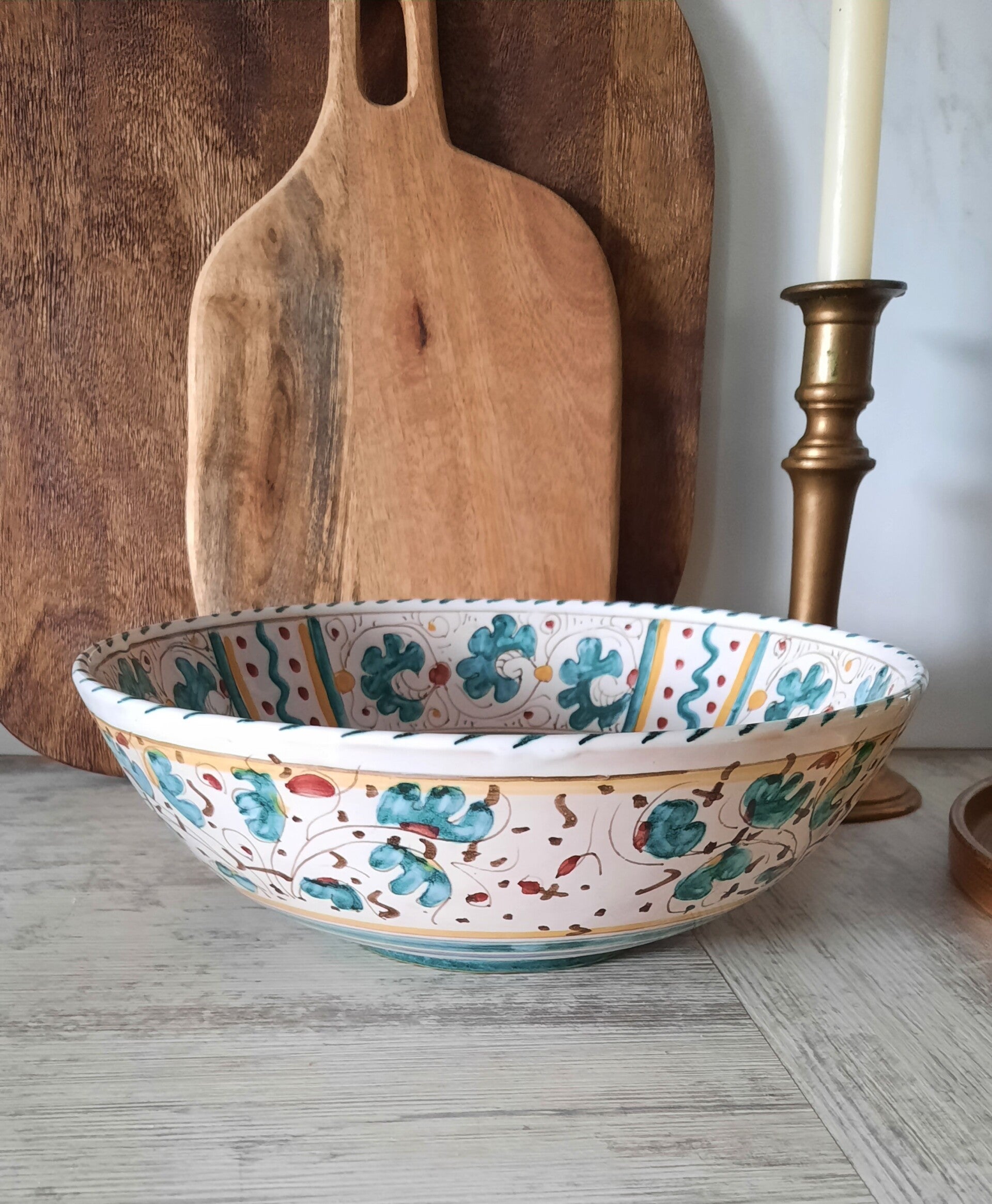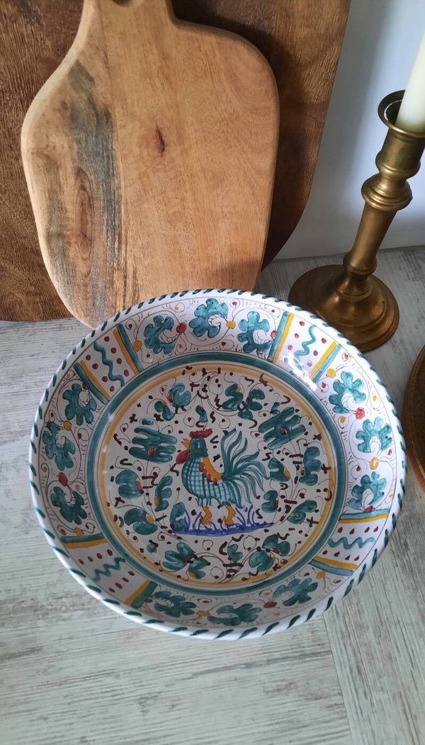 A beautiful rustic Deruta large bowl in white, with green, red, yellow, and brown patterns, and a rooster motif in the center. It is handmade and hand-painted. Made in Italy.