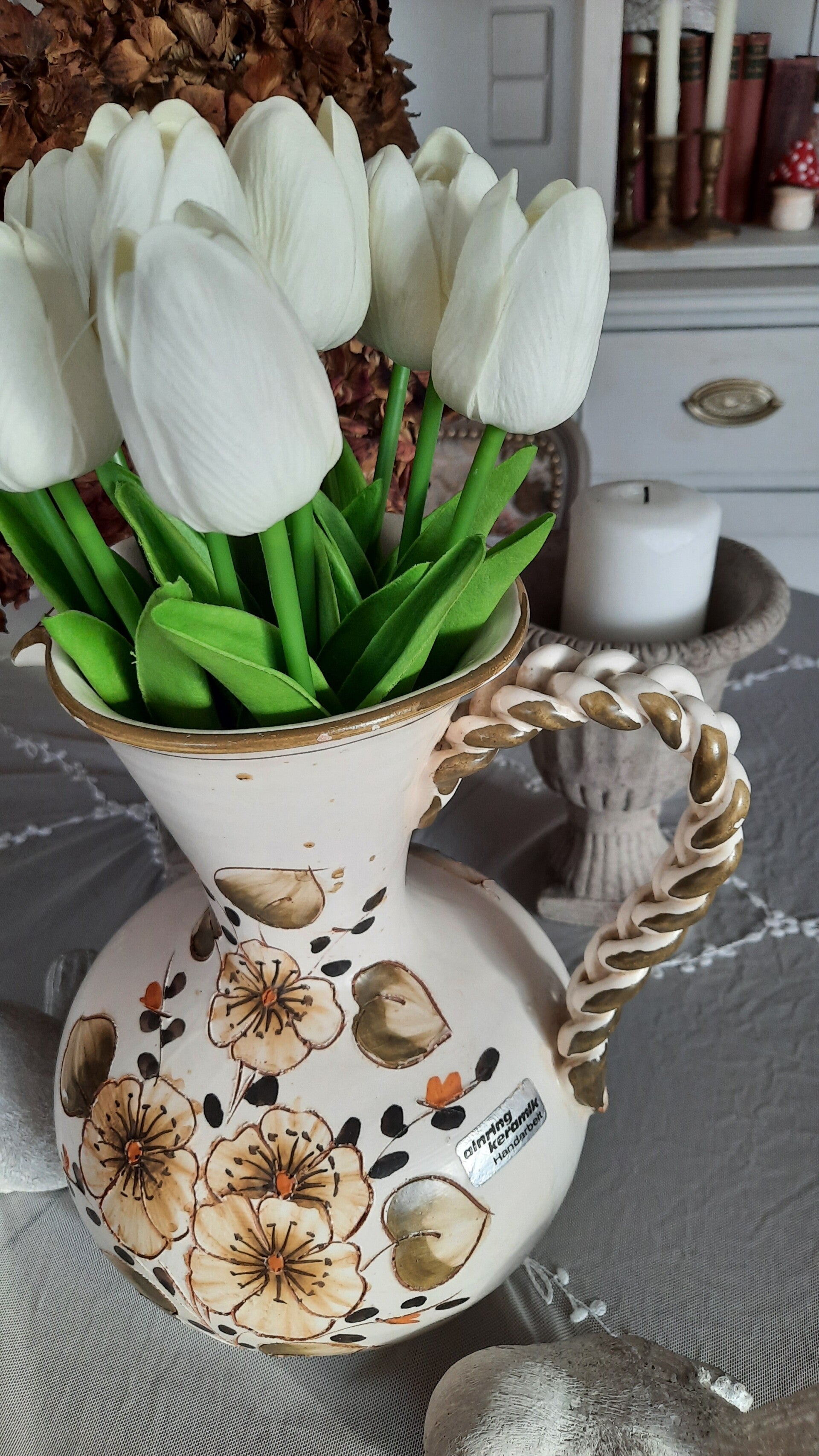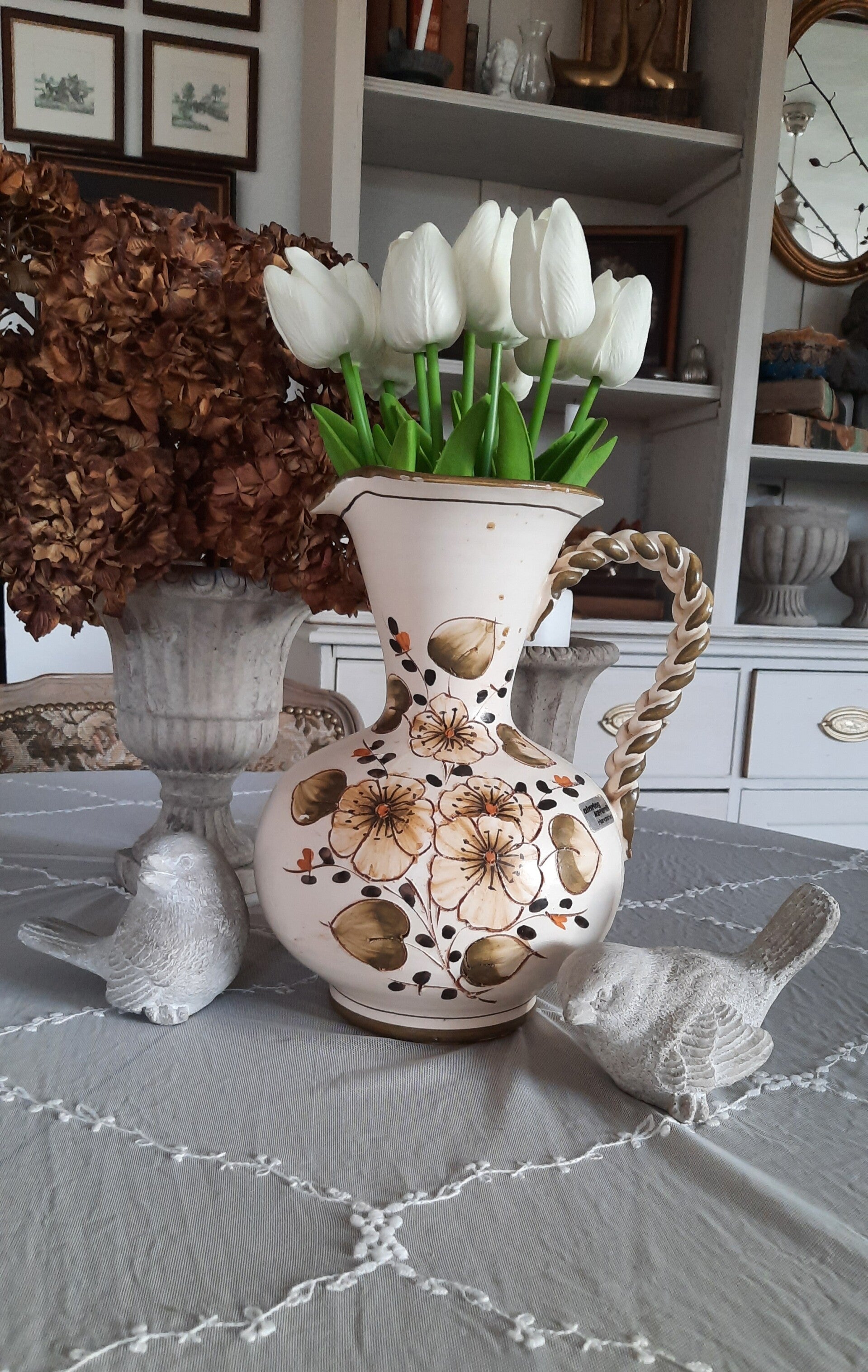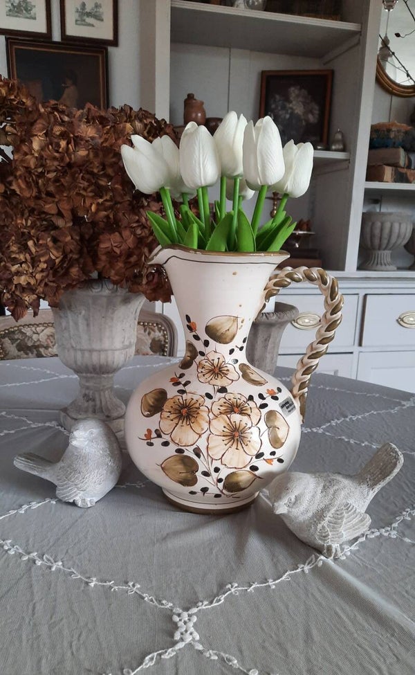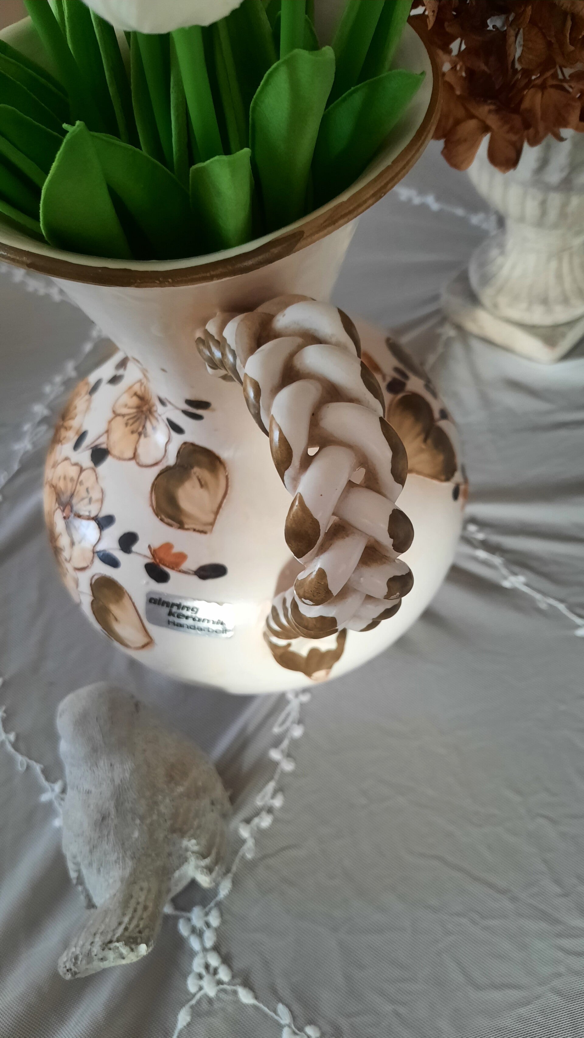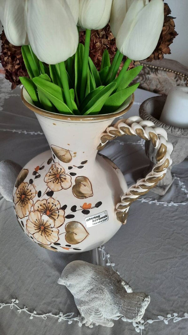 A beautiful pitcher vase in cream with carved/engraved flowers in olive green. It features a gorgeous rope-style handle in olive green and cream beige. Handmade and hand-painted, it is heavy and solid. There is a label on it, and it was made in Germany.