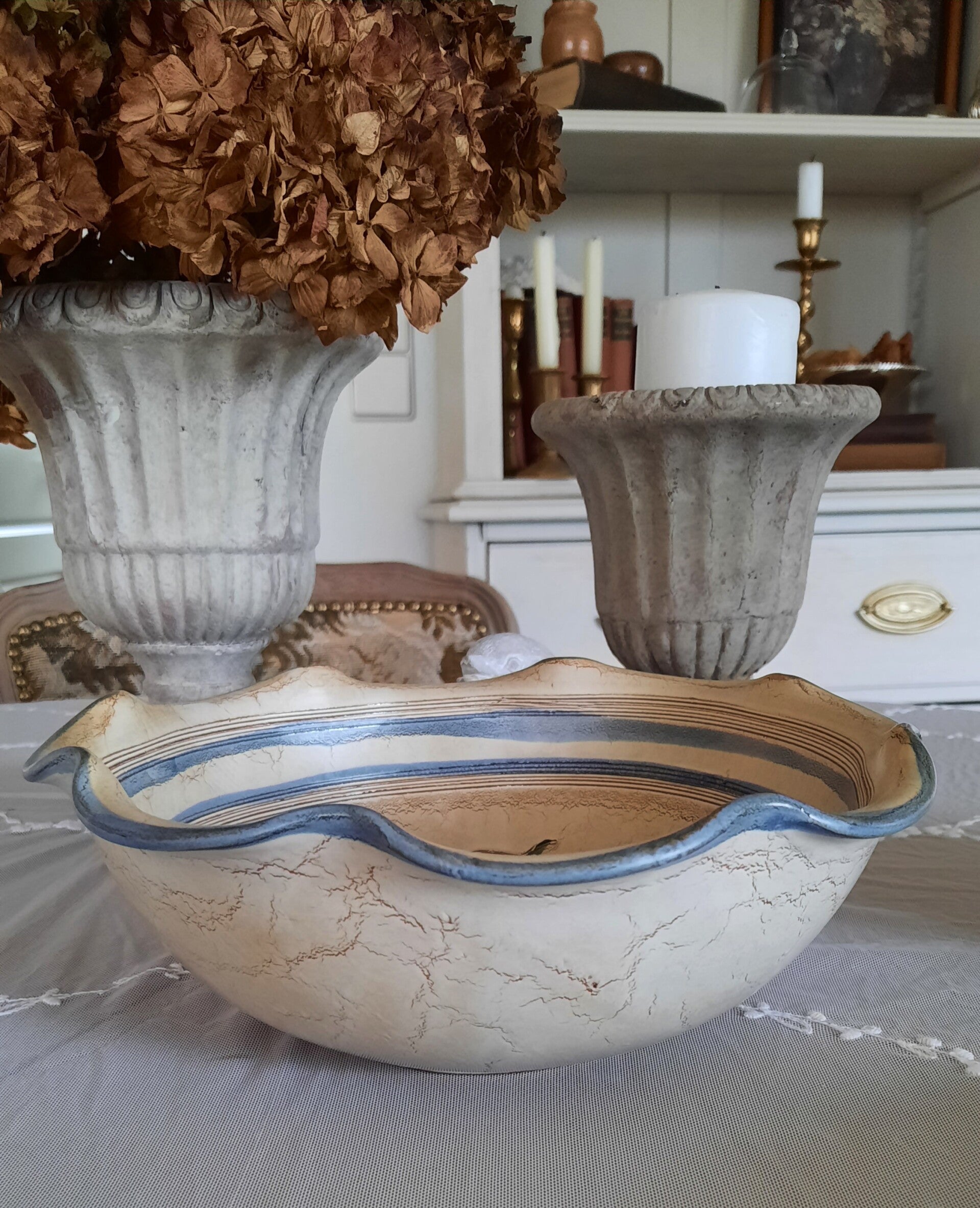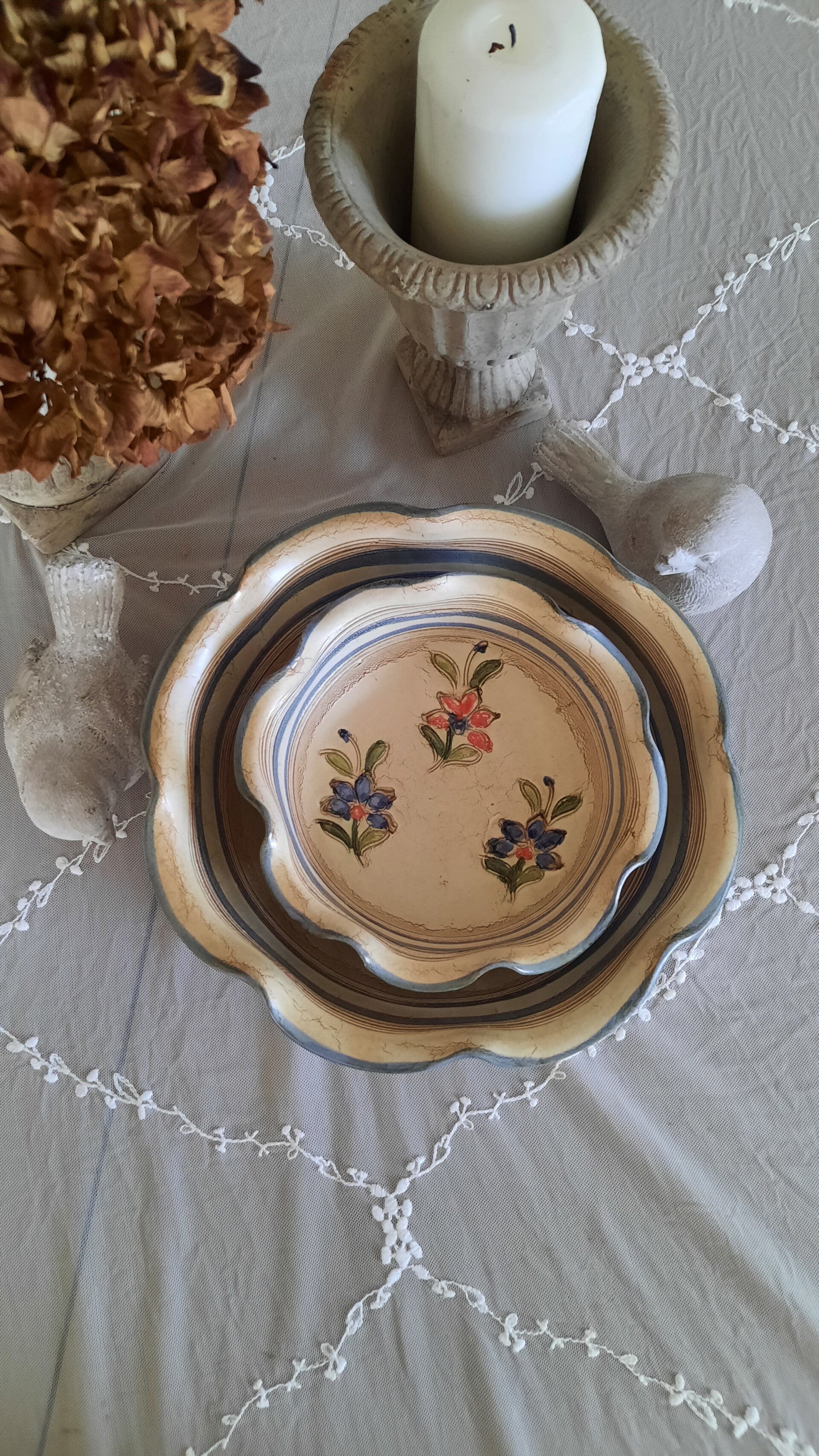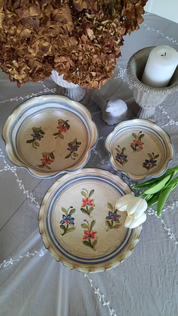 A beautiful rustic set of 2 bowls in two different sizes, one small and one medium-sized, in gray-beige with curved engraved flower motifs in vivid colors (green, blue, red). They have blue, curved rims. The wall plate is also in gray-beige with the same engraved flower motifs and a blue, curved rim. There are two holes on the back for wall hanging. All pieces have a label.