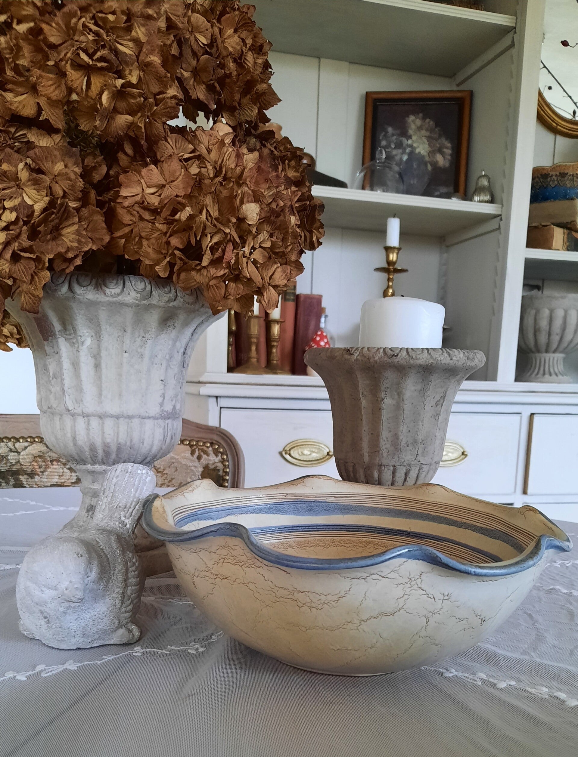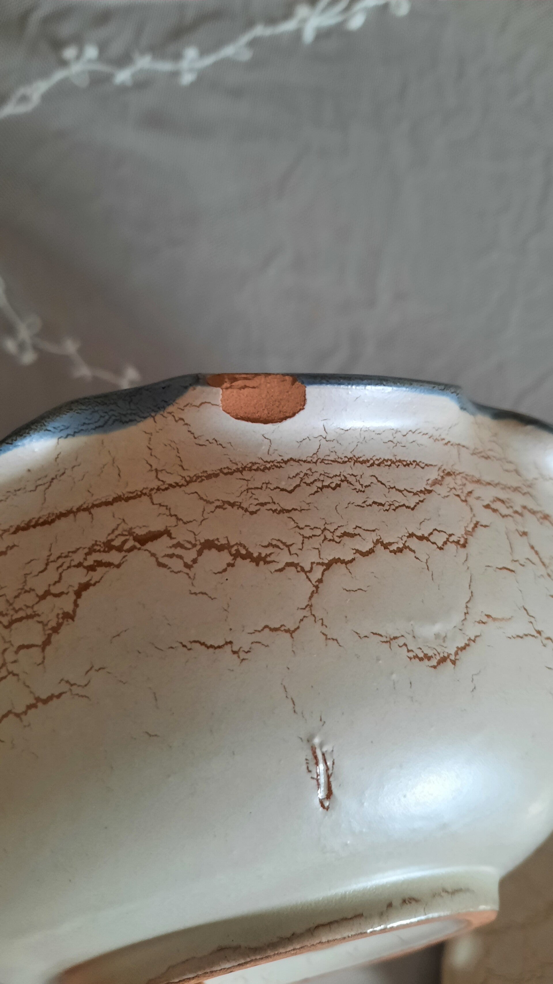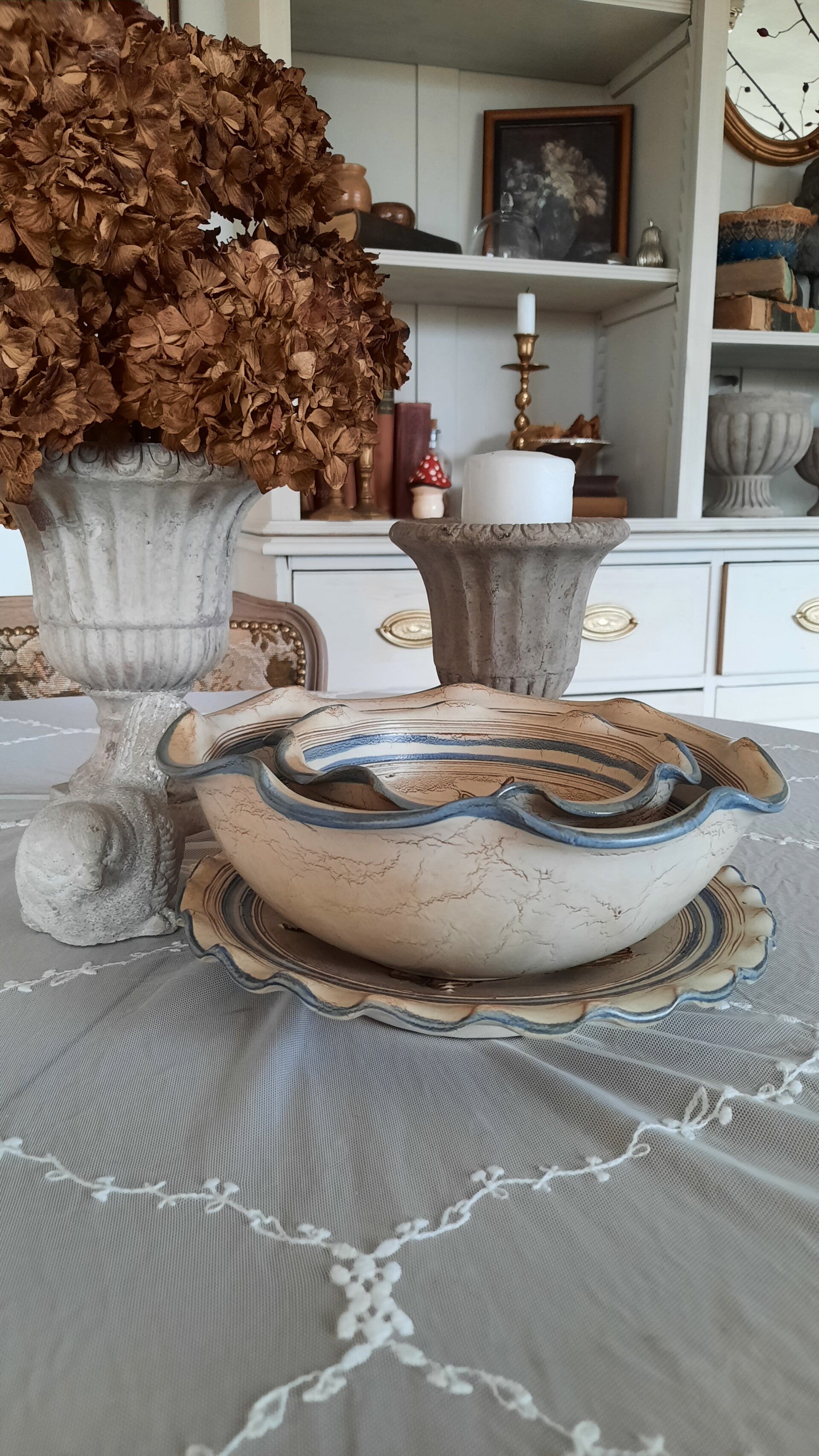 A beautiful rustic set of 2 bowls in two different sizes, one small and one medium-sized, in gray-beige with curved engraved flower motifs in vivid colors (green, blue, red). They have blue, curved rims. The wall plate is also in gray-beige with the same engraved flower motifs and a blue, curved rim. There are two holes on the back for wall hanging. All pieces have a label.