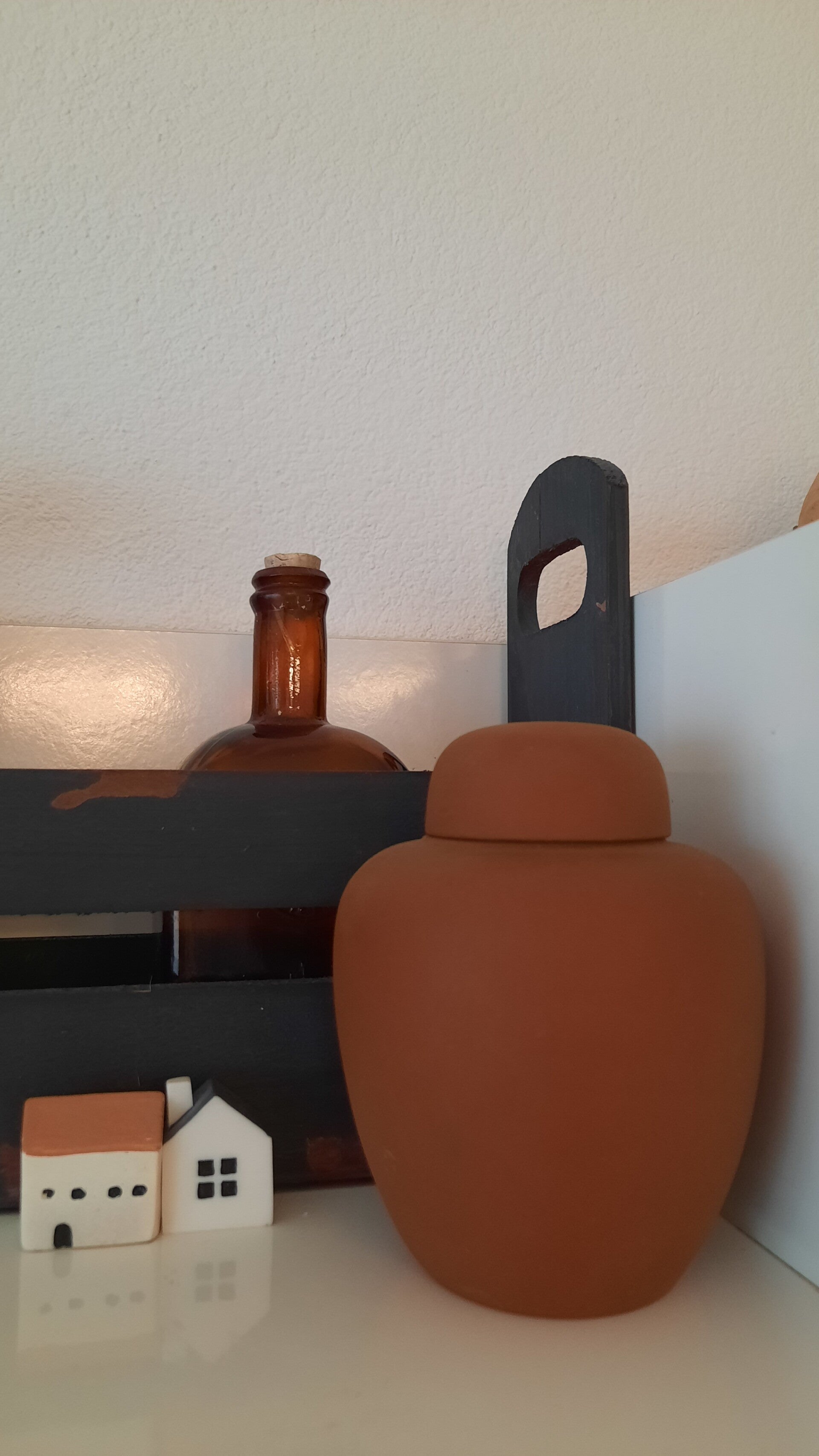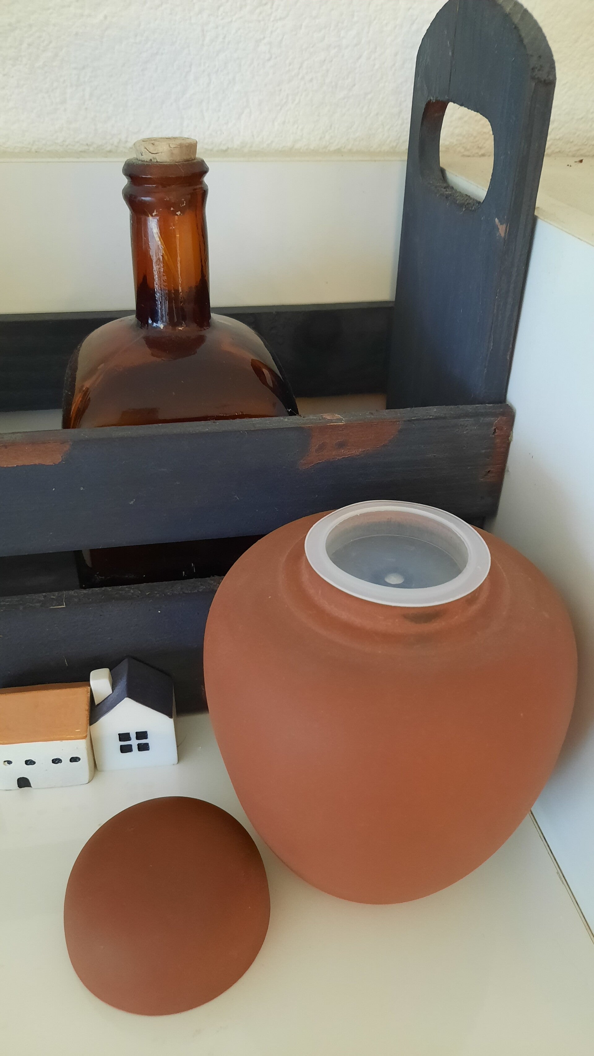 A vintage Japanese ceramic tea urn in brown. It is a ceramic vase/jar with a lid to store tea.