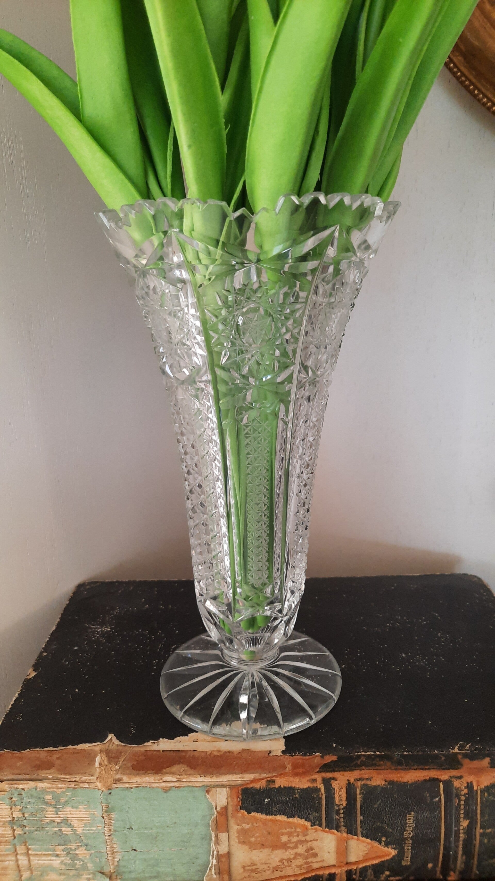 An elegant vintage crystal glass footed vase in trumpet shape, with star motifs and a sawtooth rim.