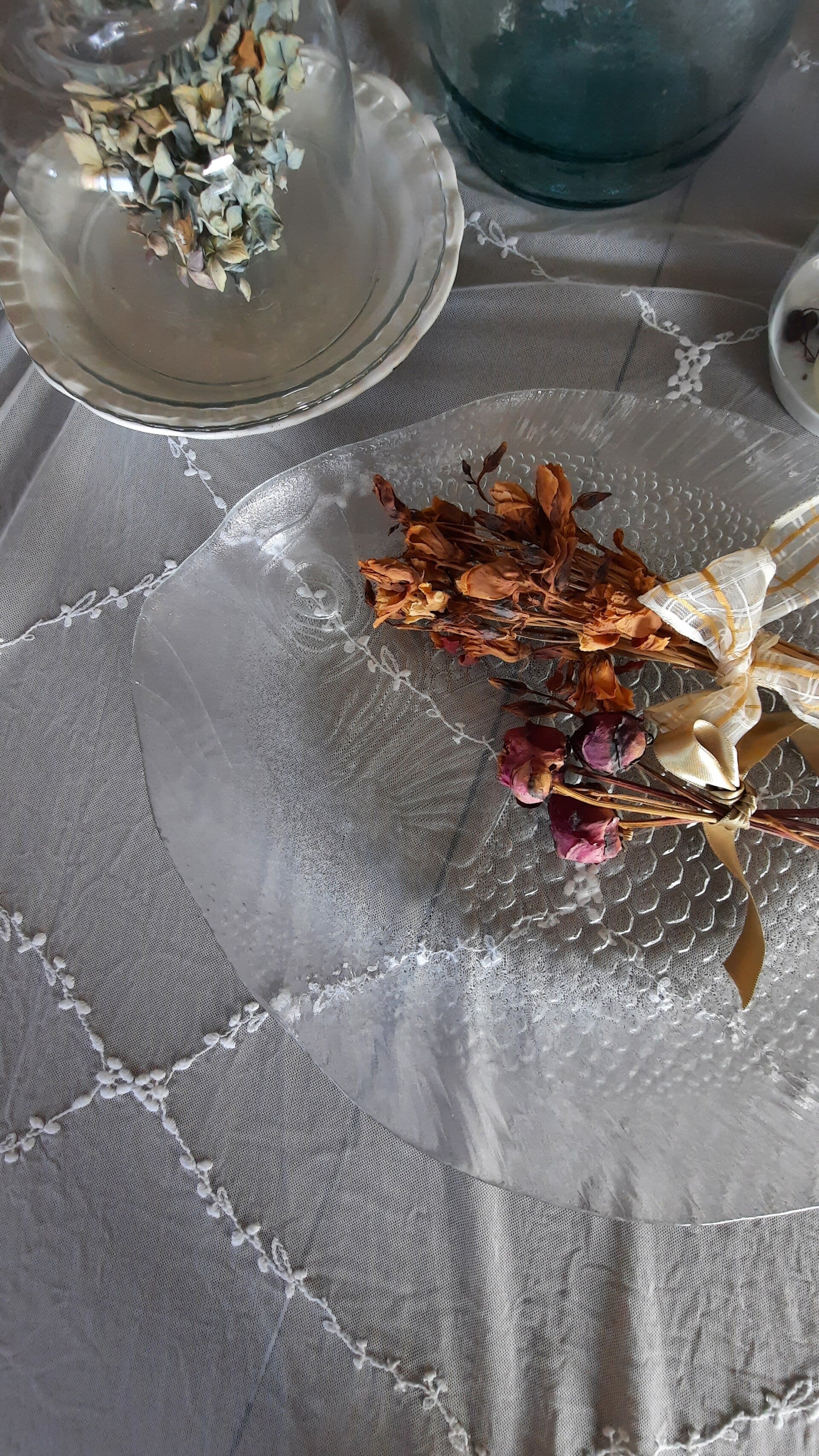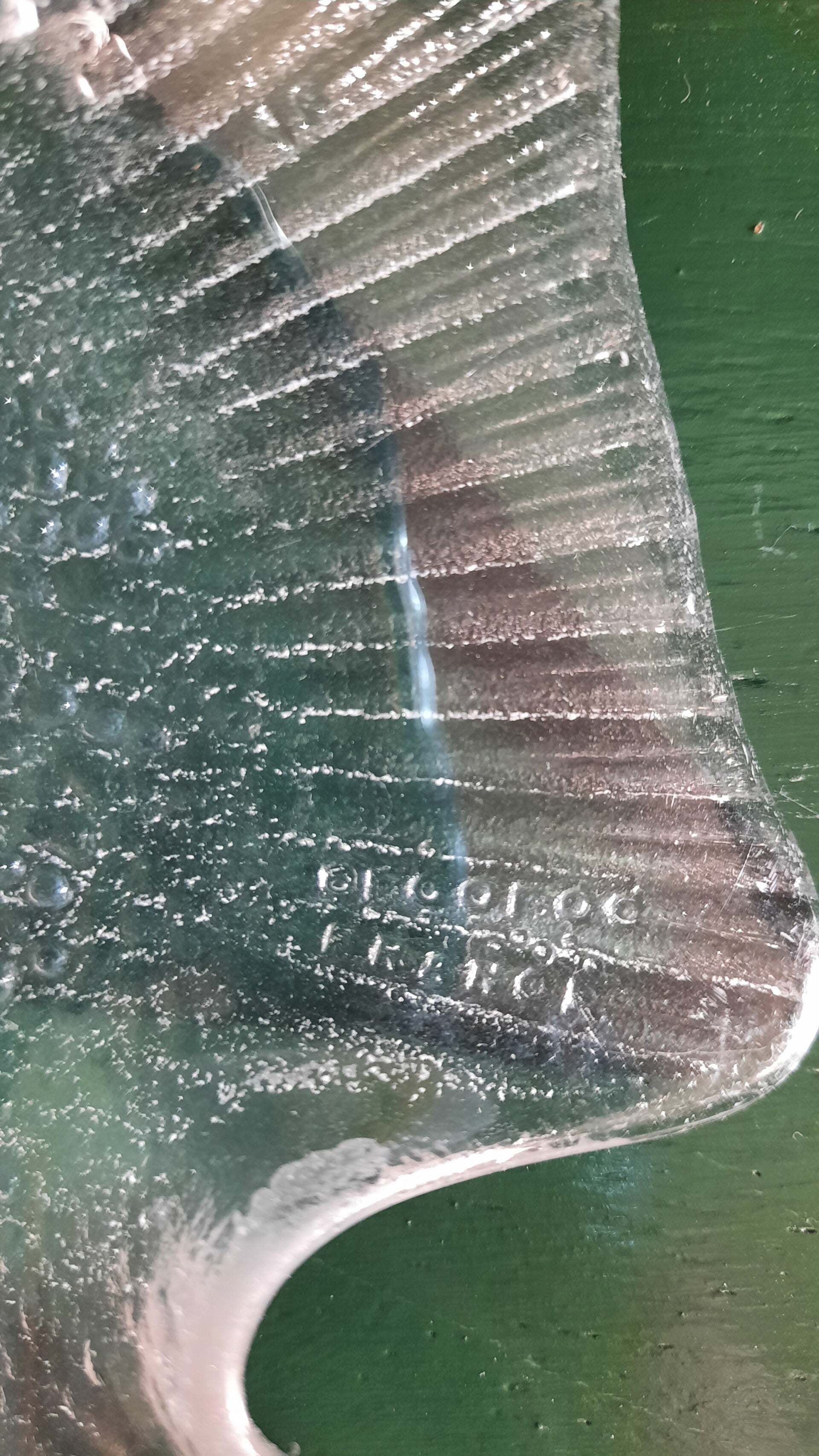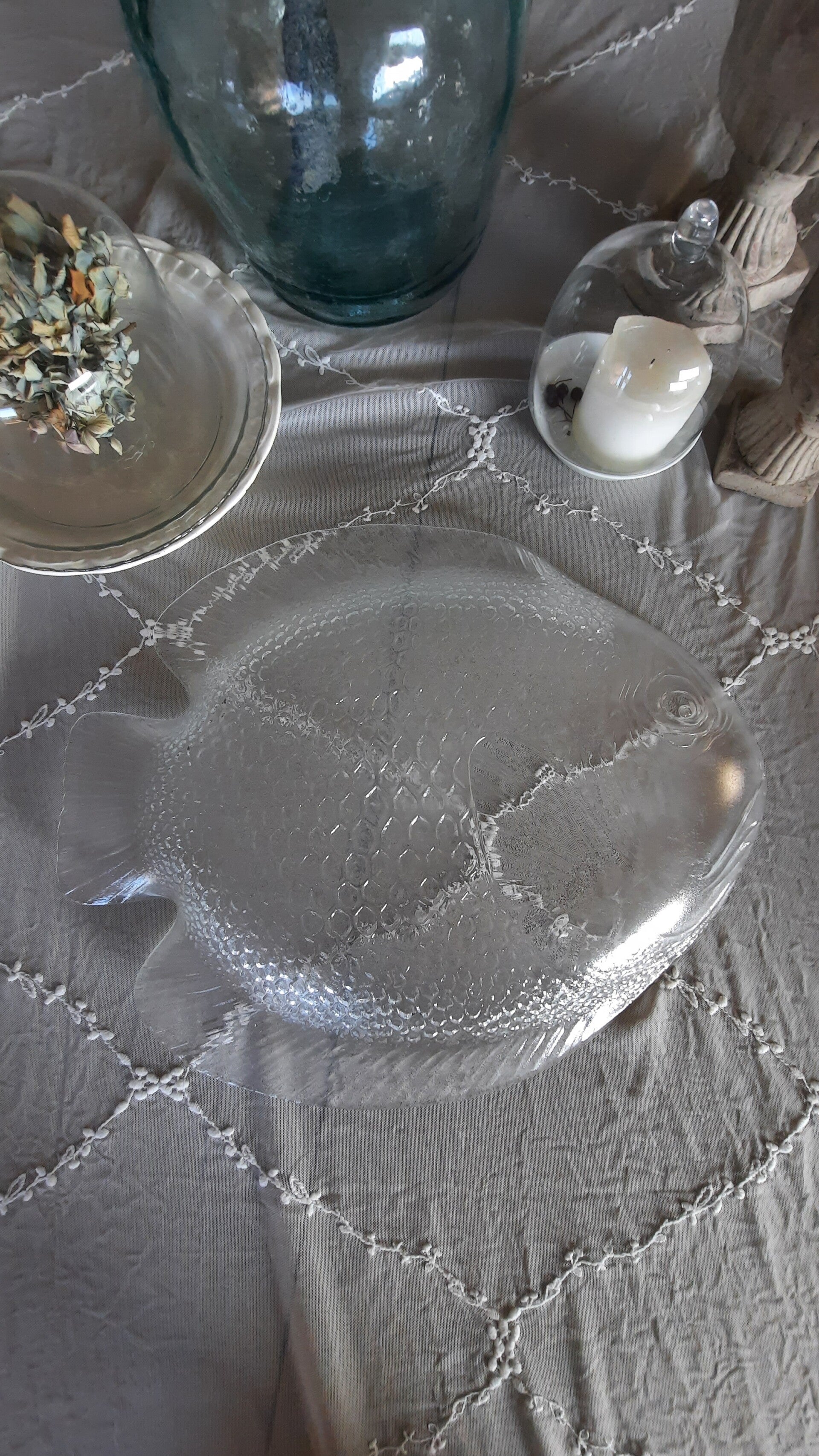 A beautiful vintage glass platter in the shape of a fish. Marked on the bottom (on the fish's tail).