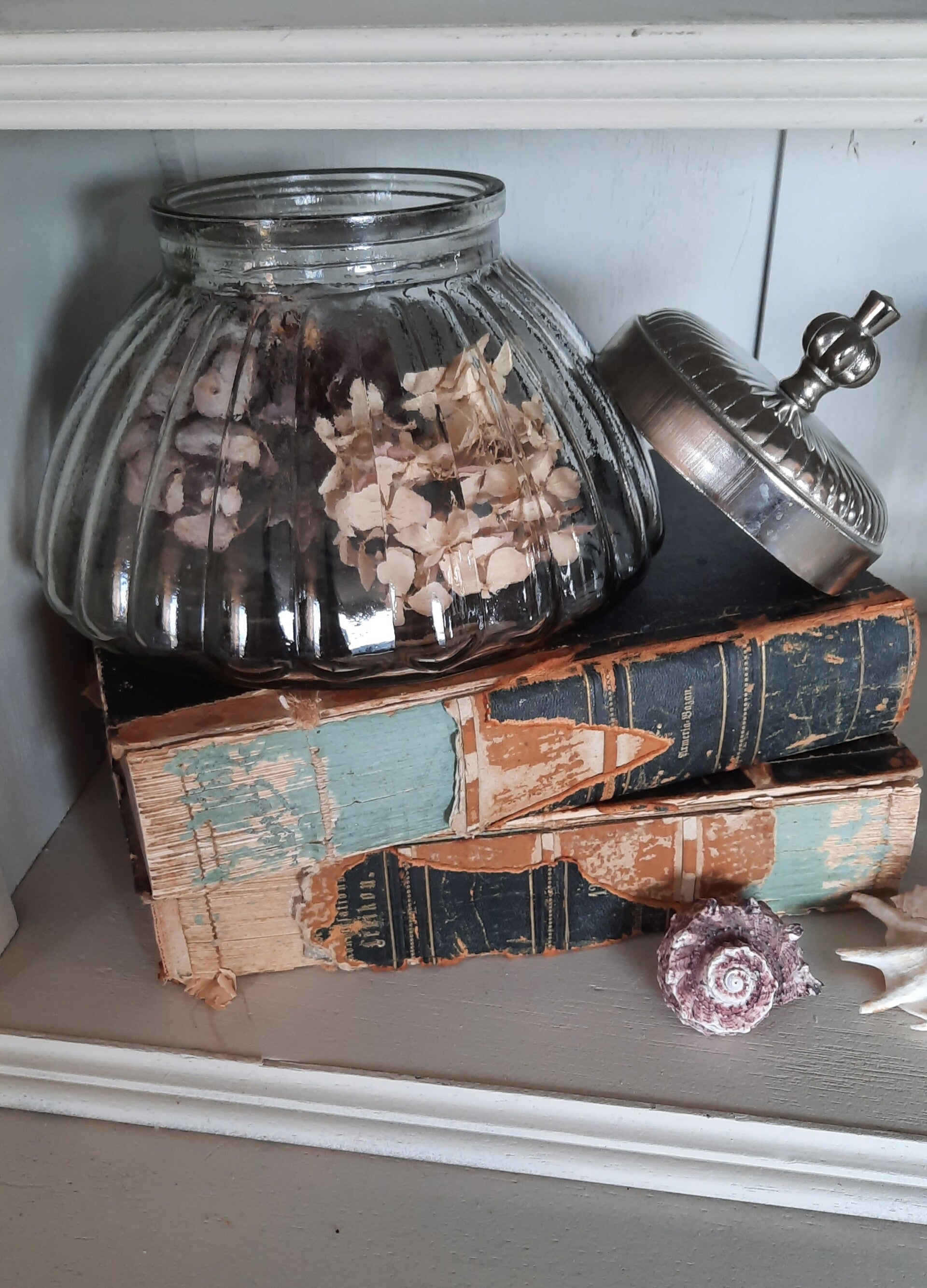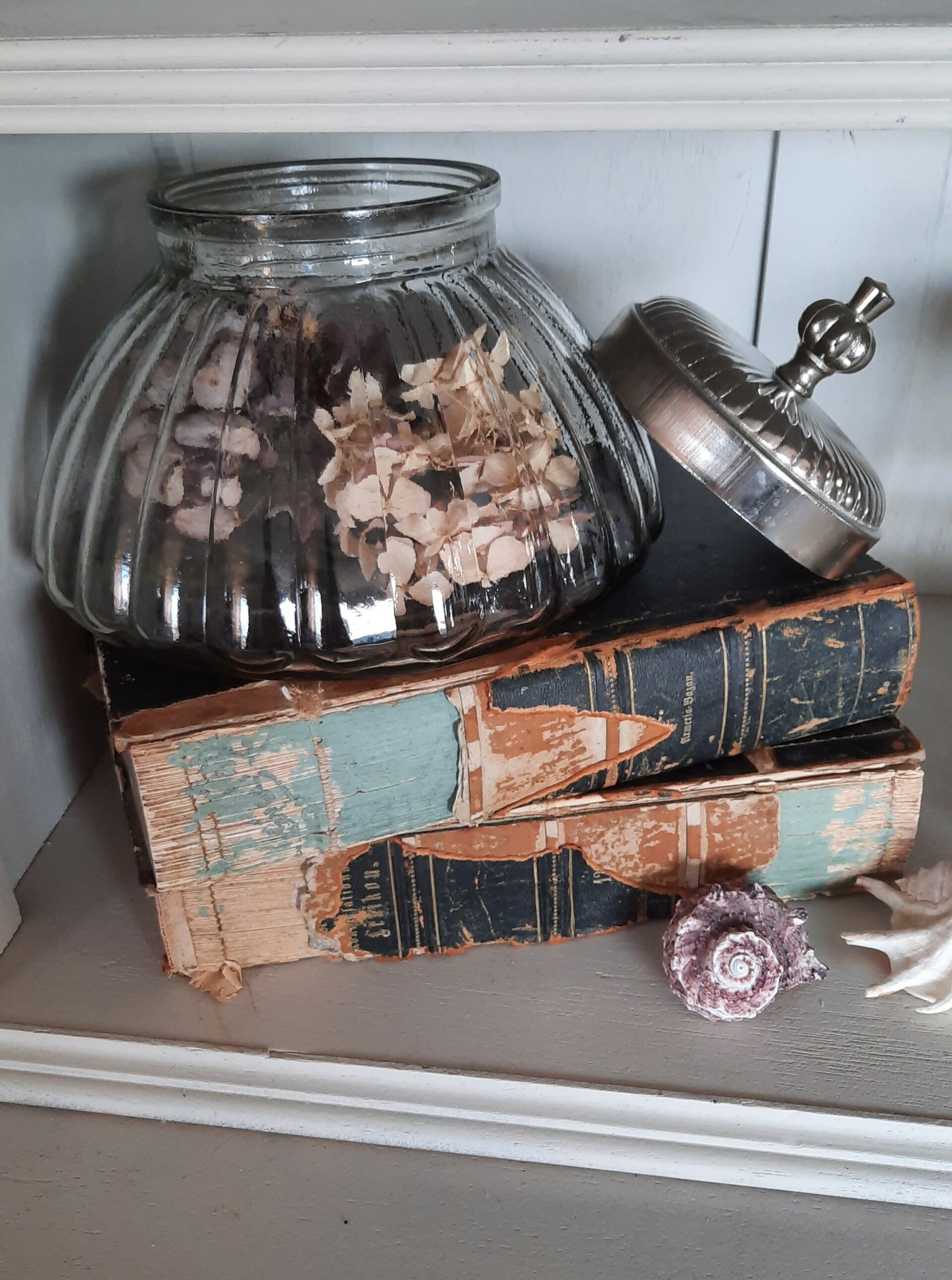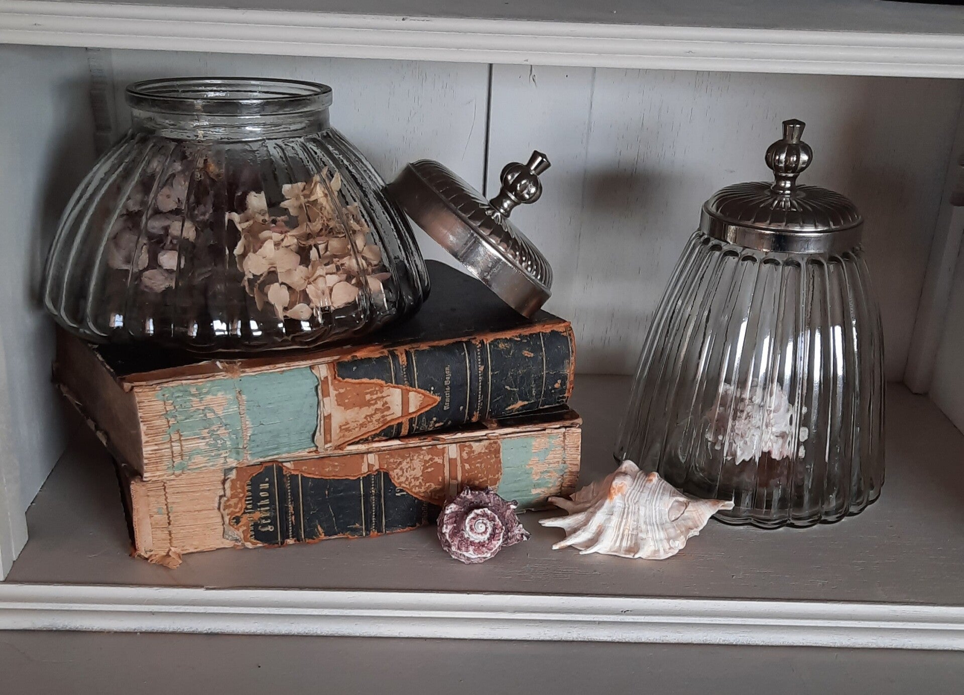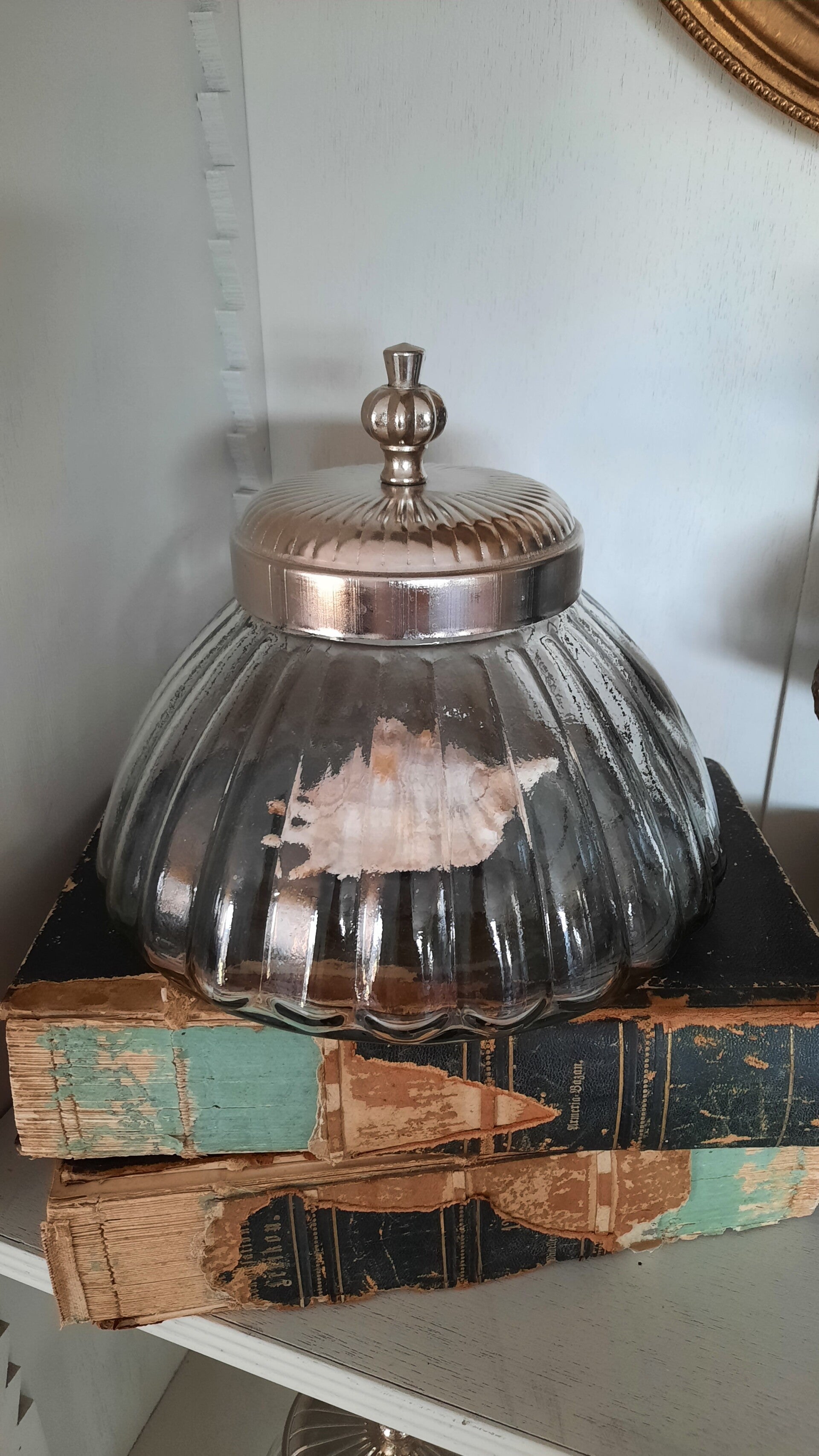A beautiful vintage ribbed clear glass heavy storage candy jar. Hand-blown with air bubbles, in nice shape, and featuring a metal lid. It has a conical shape.