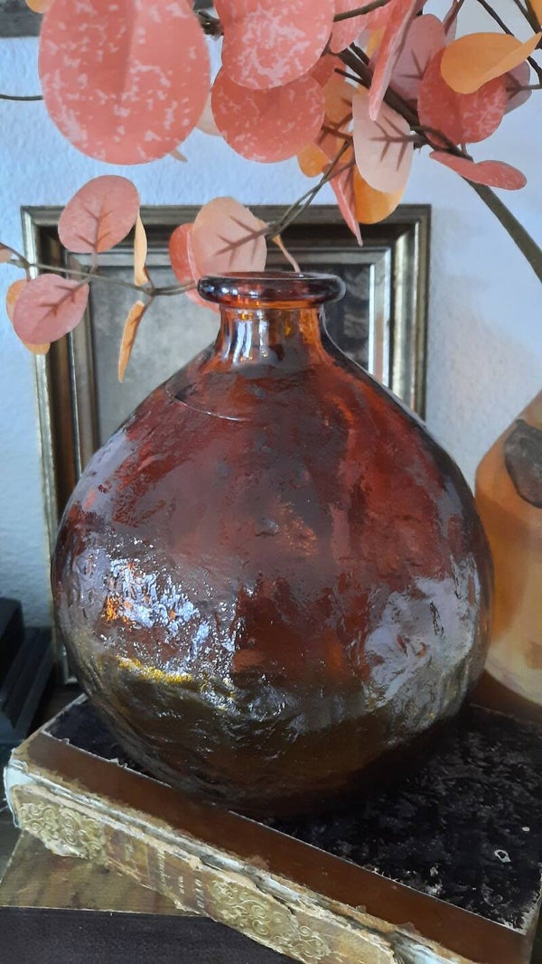 A beautiful embossed heavy glass vase in brown-orange, amber color, in a nice shape.