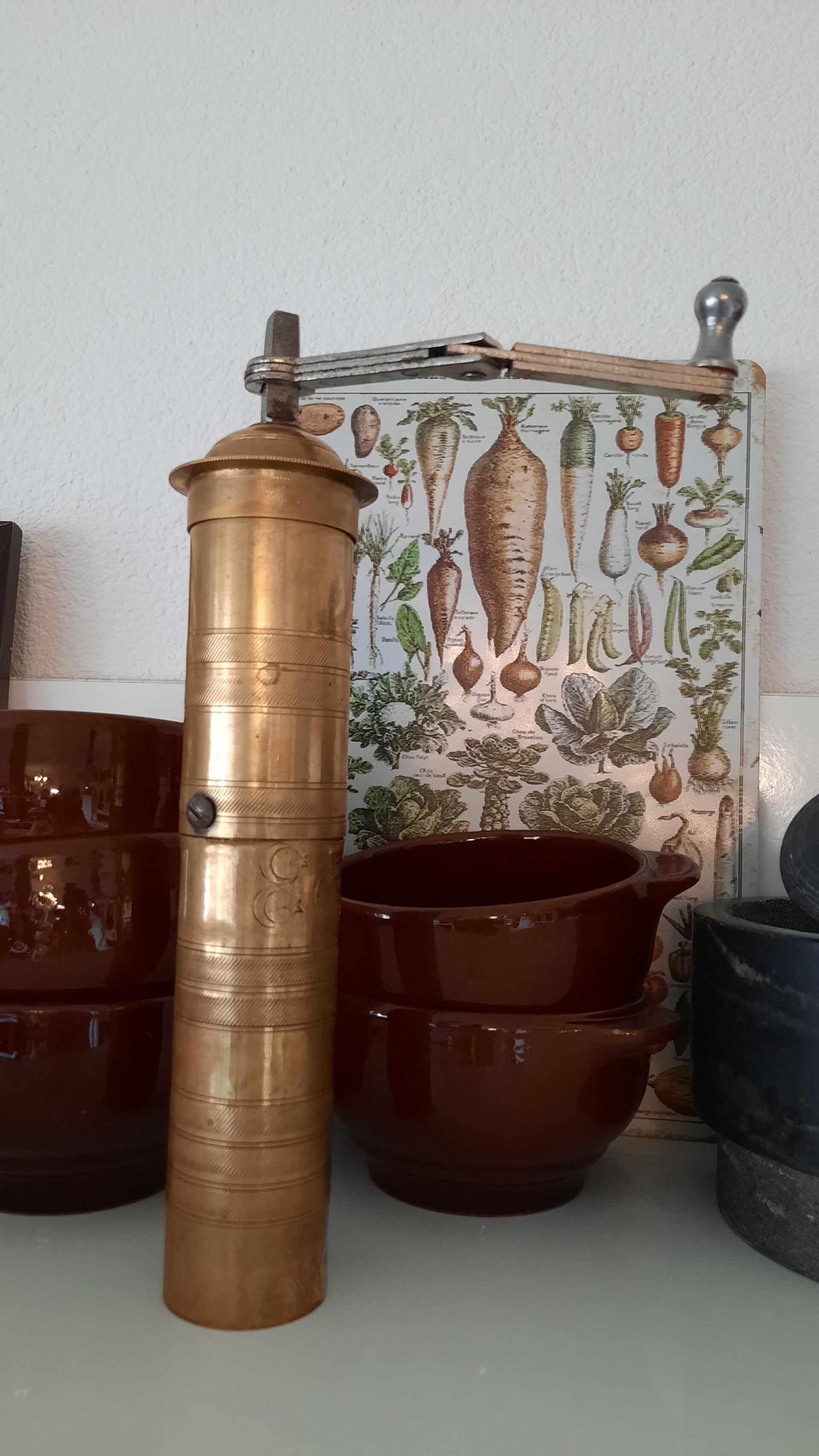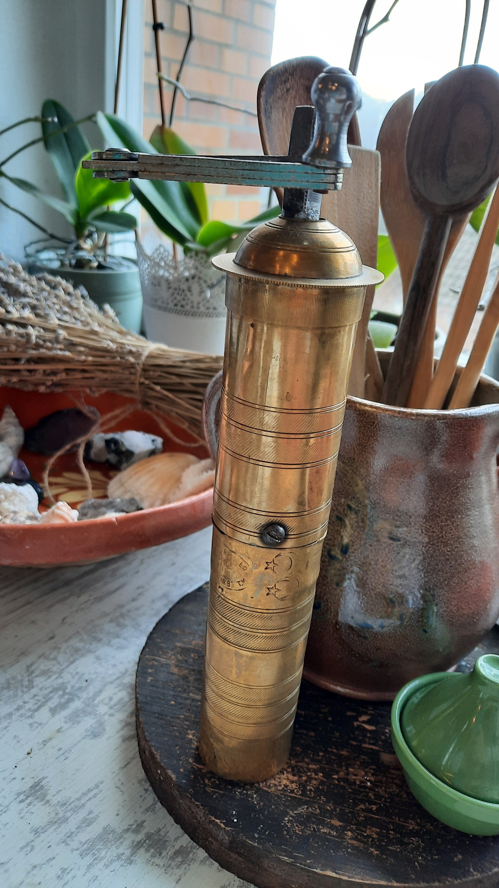 A great collectible Turkish brass engraved coffee mill, pepper mill, or spice grinder. A beautiful kitchen decor piece. Marked on the side: OZENK.