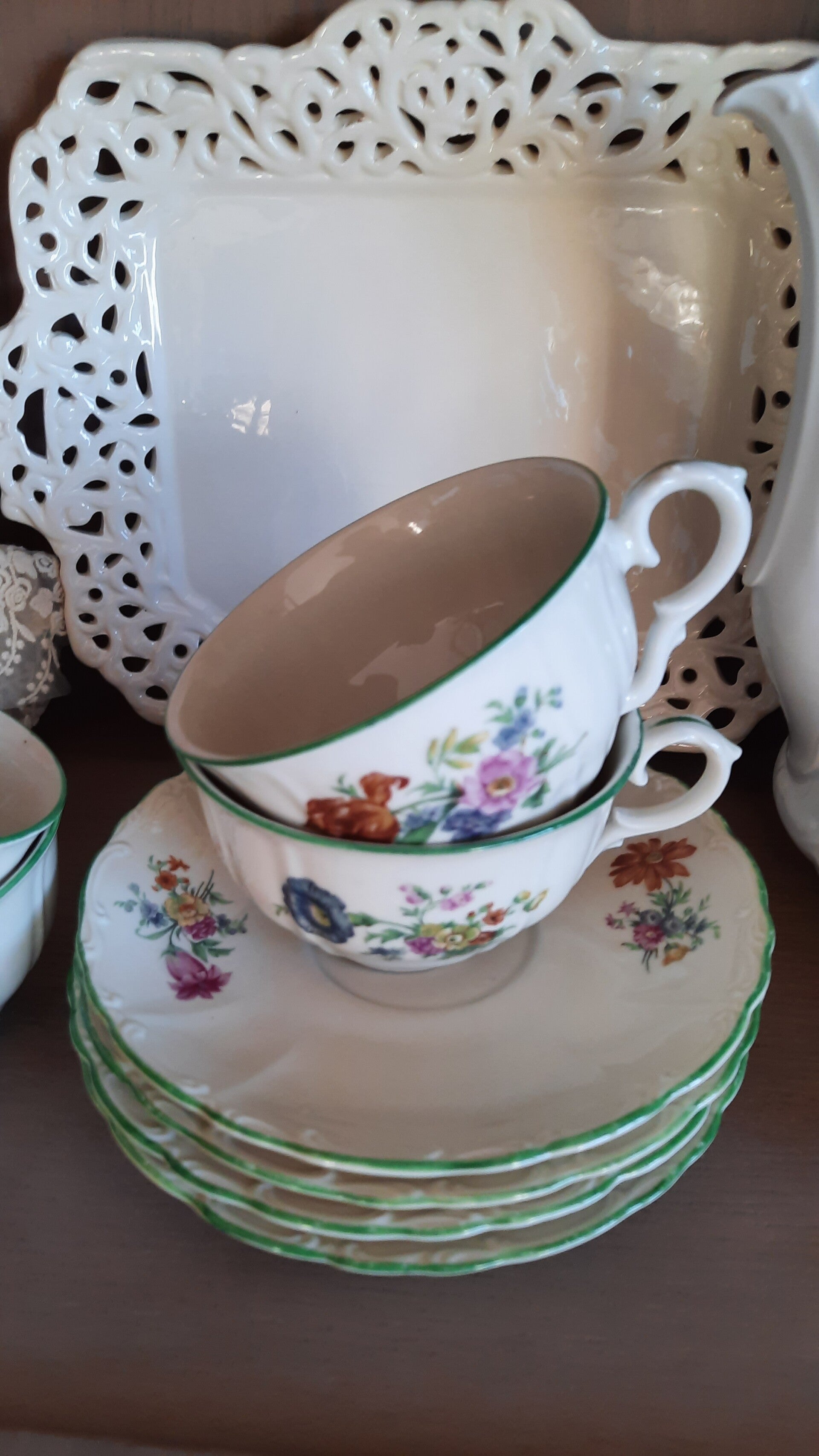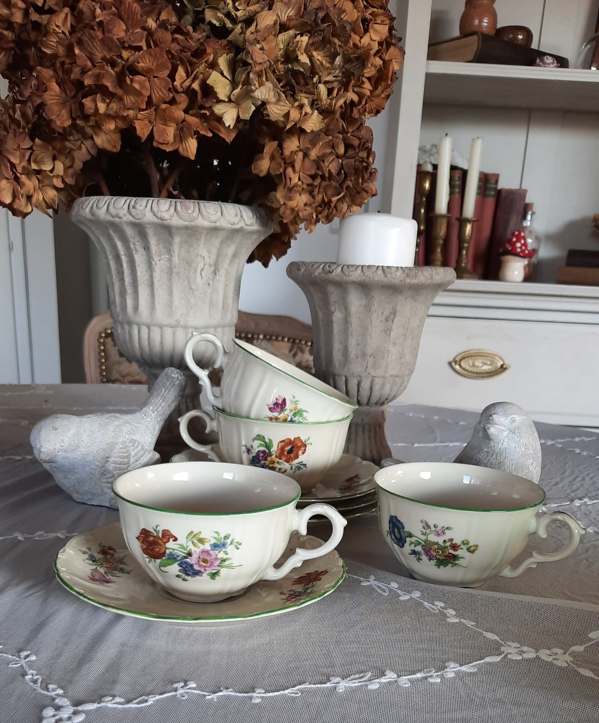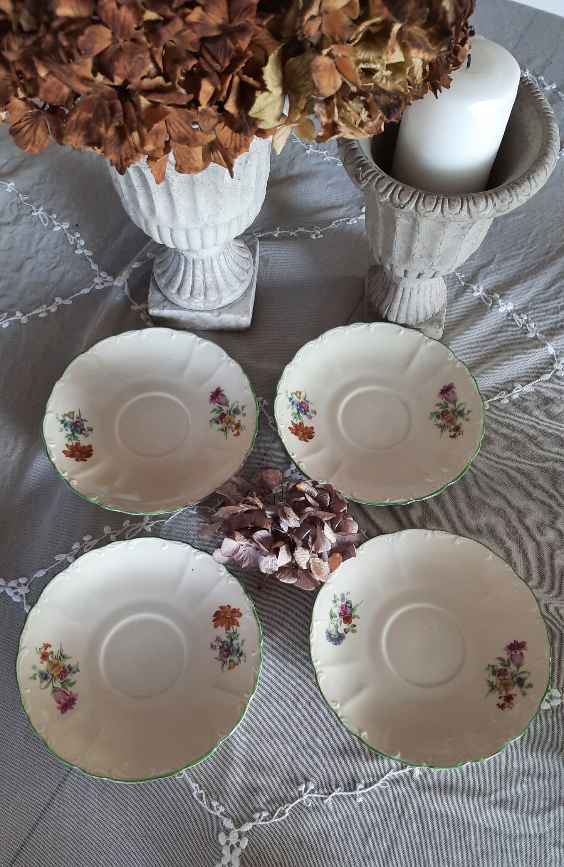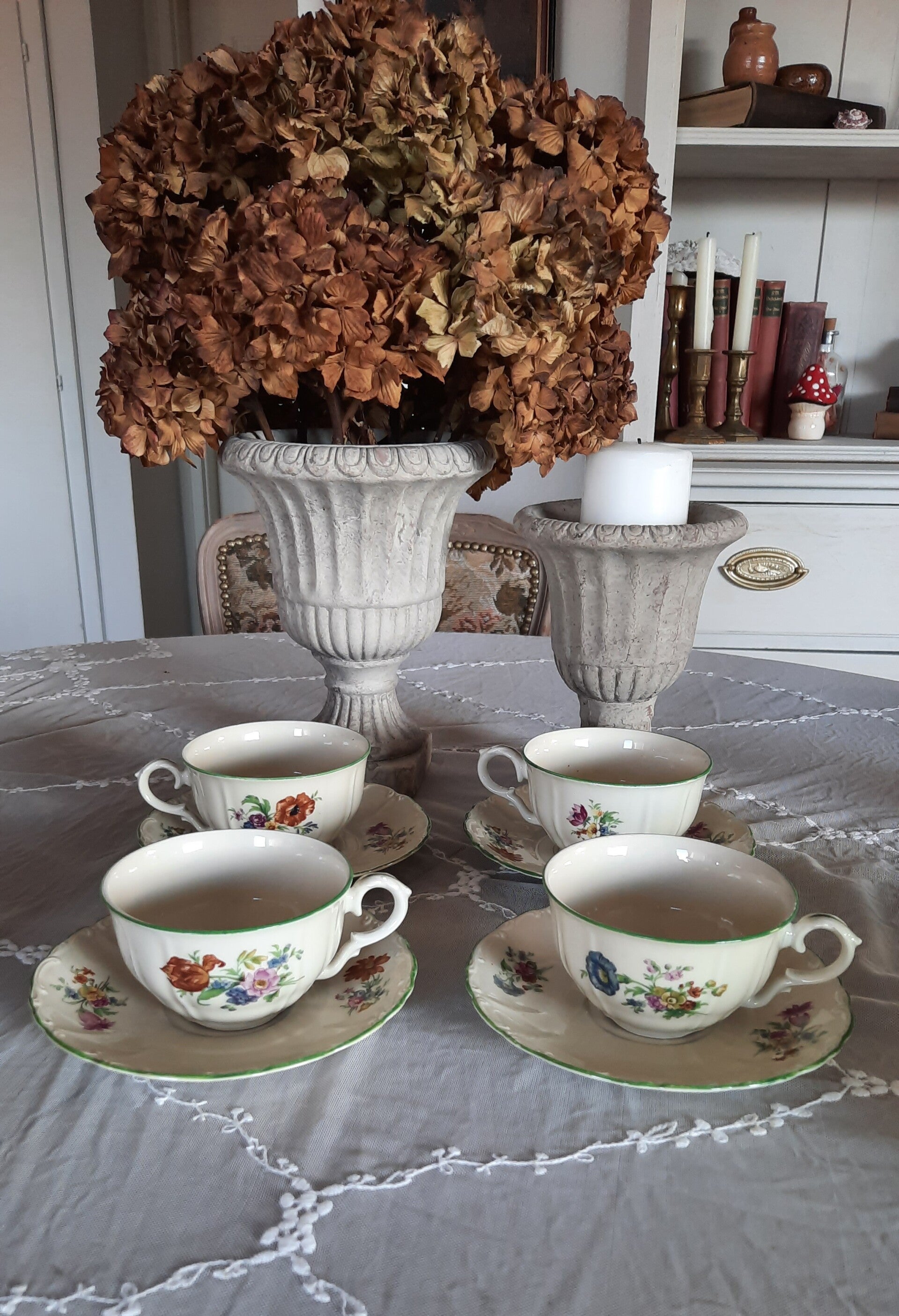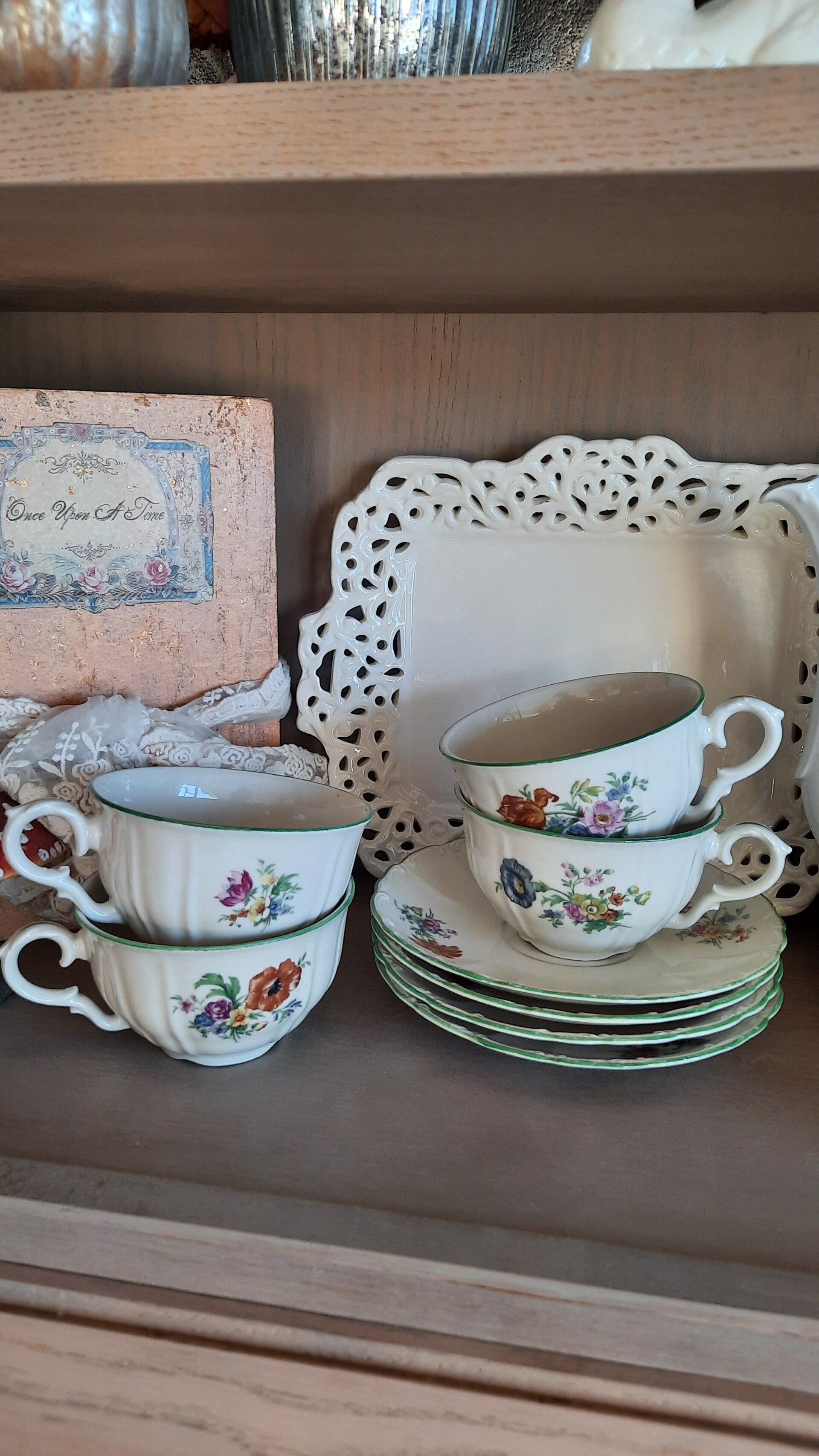 This charming vintage set includes 4 teacups and 4 saucers, each featuring two different colorful floral patterns—one on the front of the teacup and another distinct design on the back. The saucers also showcase two different floral motifs, adding to the uniqueness of this set. With lovely raised details, a green rim, and a curved base, this set is both a rare and beautiful find for any collector or tea lover.