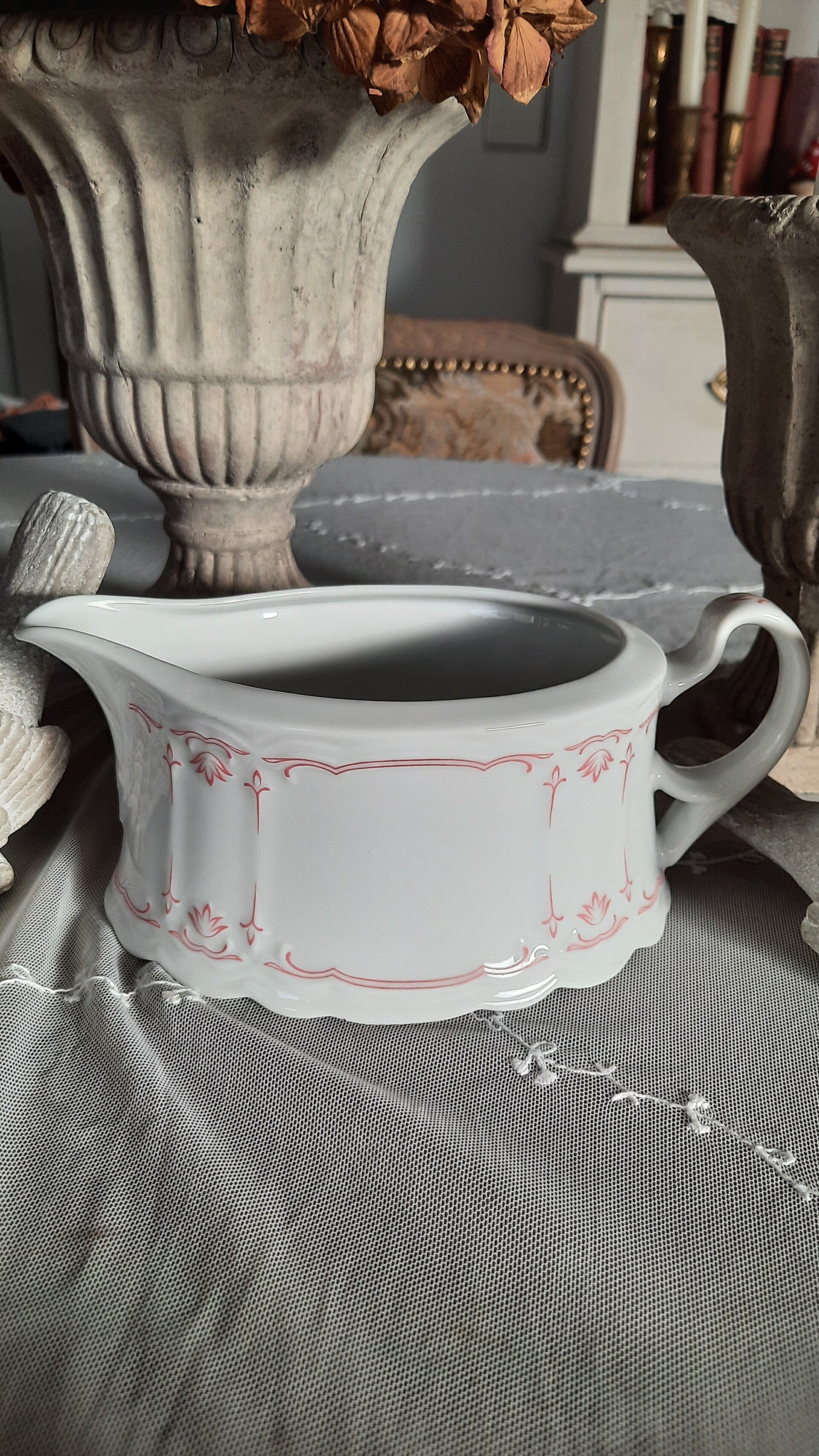 In very good condition with no chips or cracks. The oval platter has some barely visible knife marks in the middle, and the handle of the saucer has a small manufacturing mark.