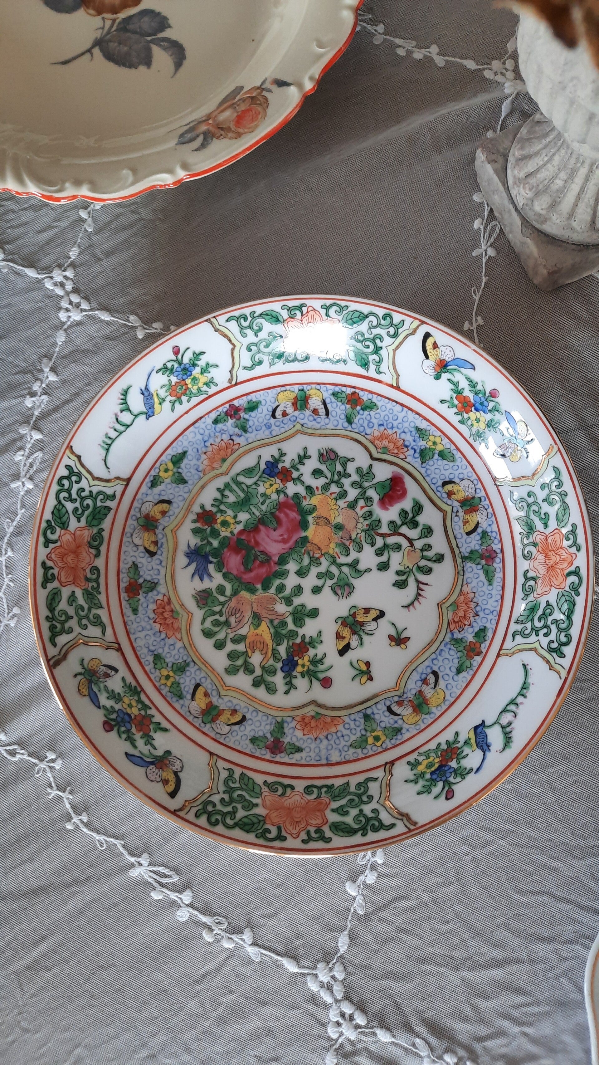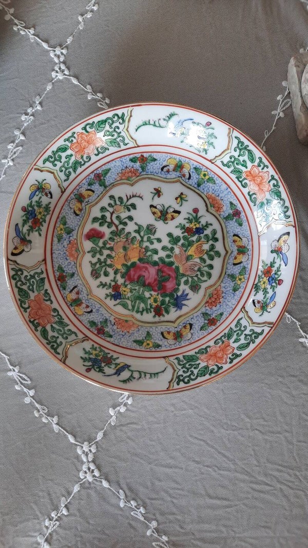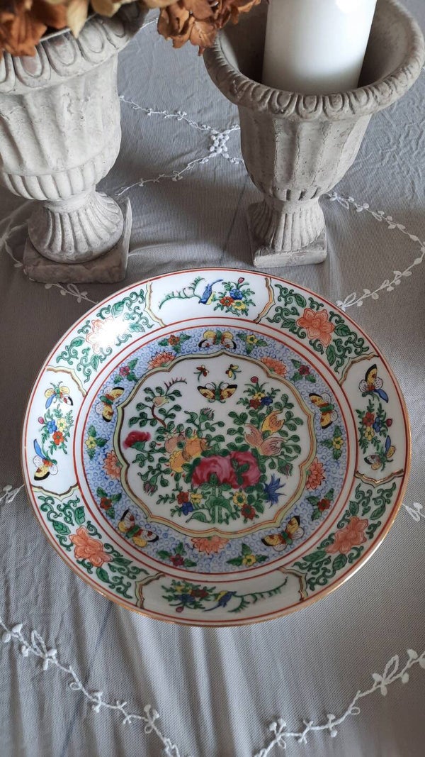 A gorgeous porcelain plate in white with a beautiful and colorful floral and butterfly pattern. It is handmade, hand-painted, and glazed. Made in Hong Kong in the 1960s. Marked on the bottom.