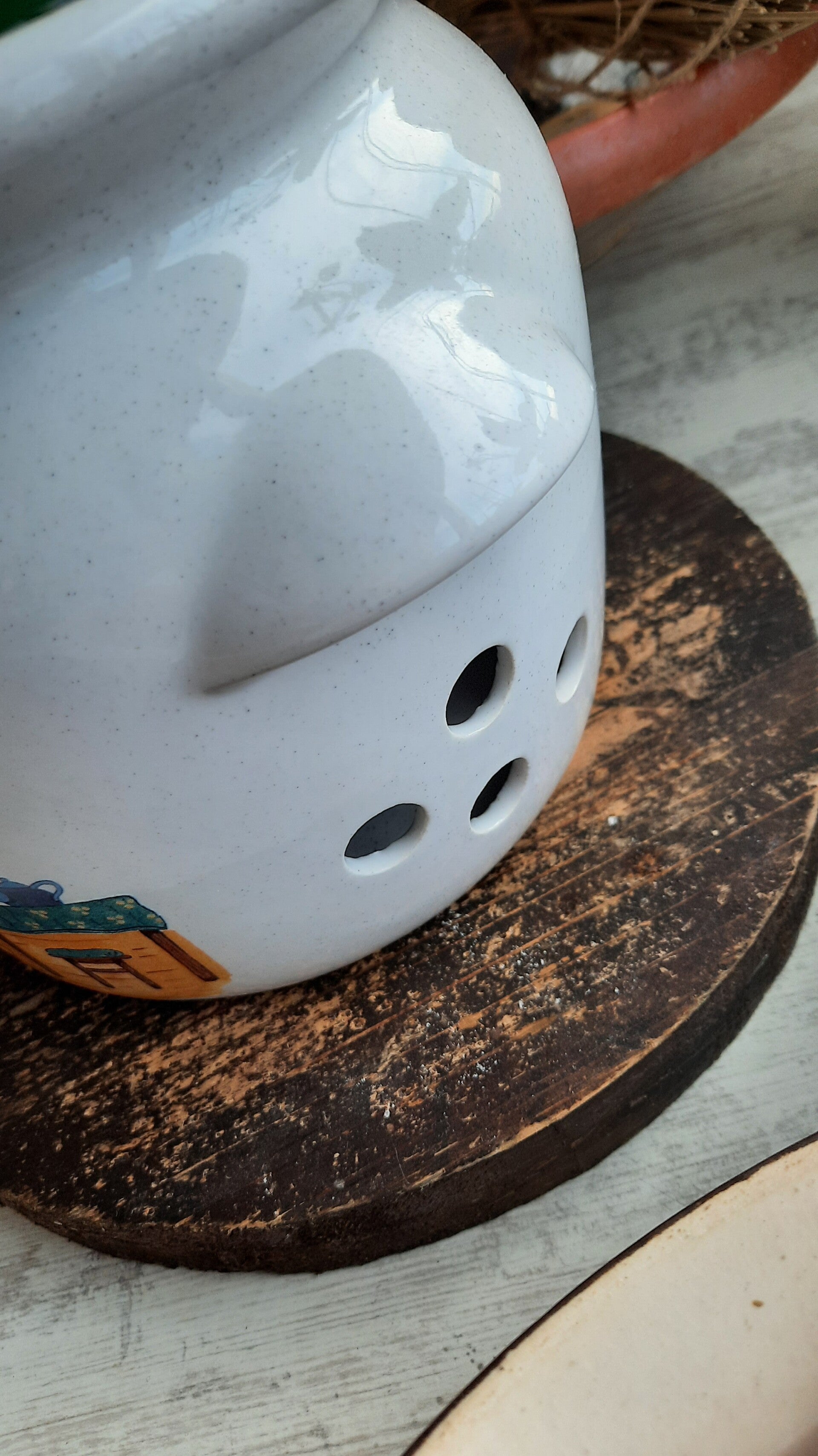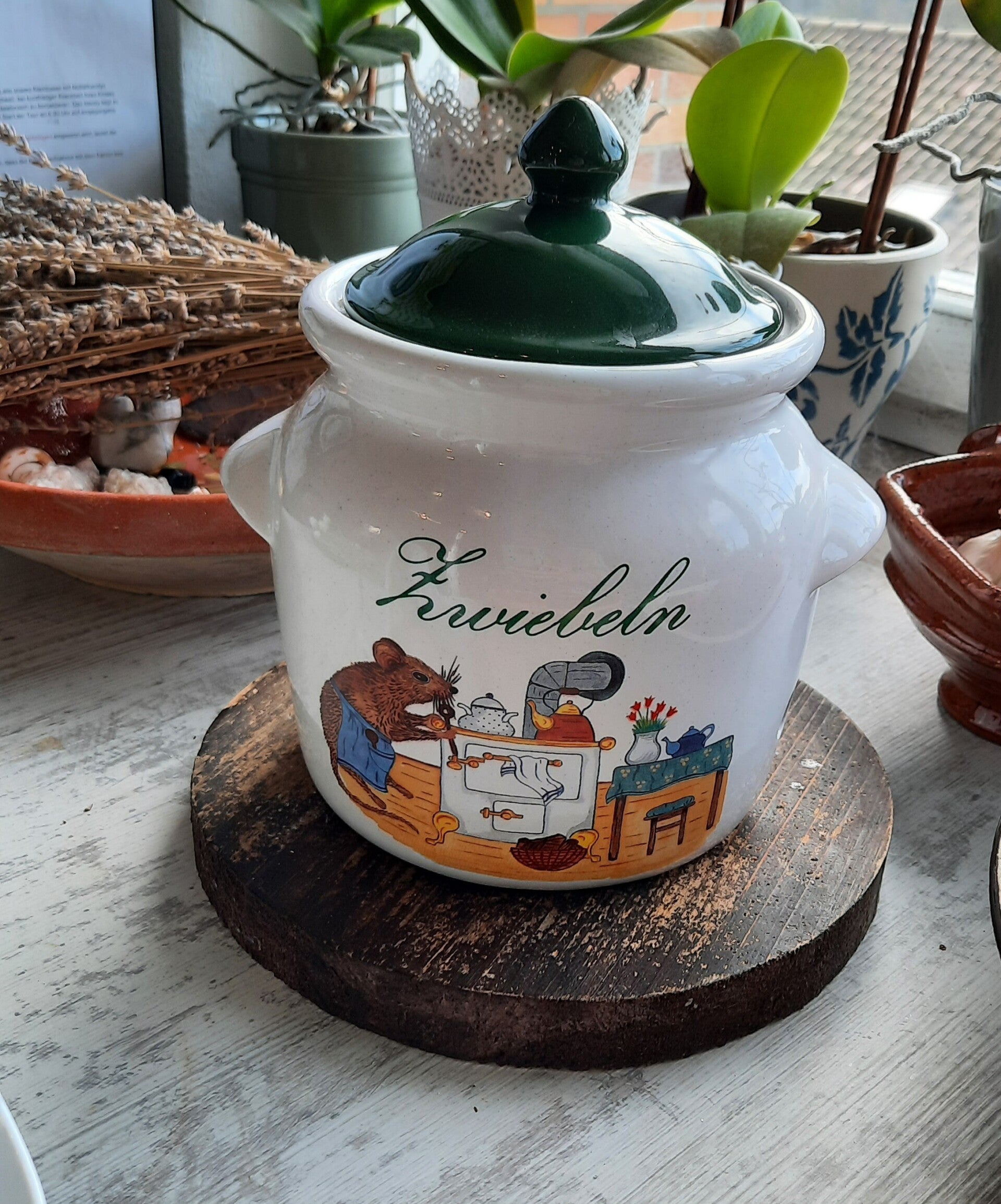 A lovely vintage onion pot in white with a rustic kitchen and mouse pattern. It has a green lid. There are 4 holes on one side and 4 holes on the other side. Marked on the bottom "LINEA."