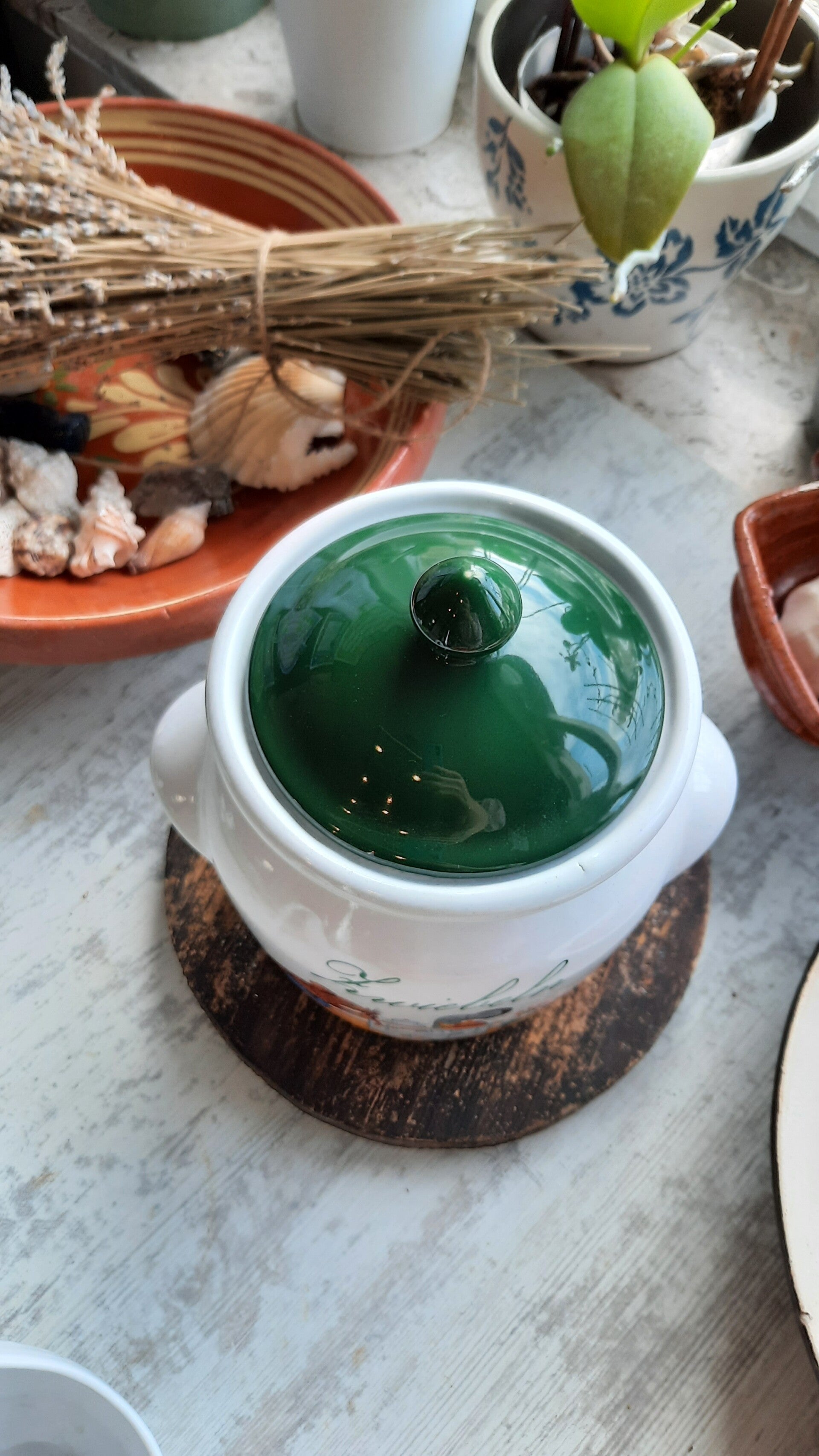 In good vintage condition with no chips or crazing. There is a crack on the lid and some wear on the green handle.