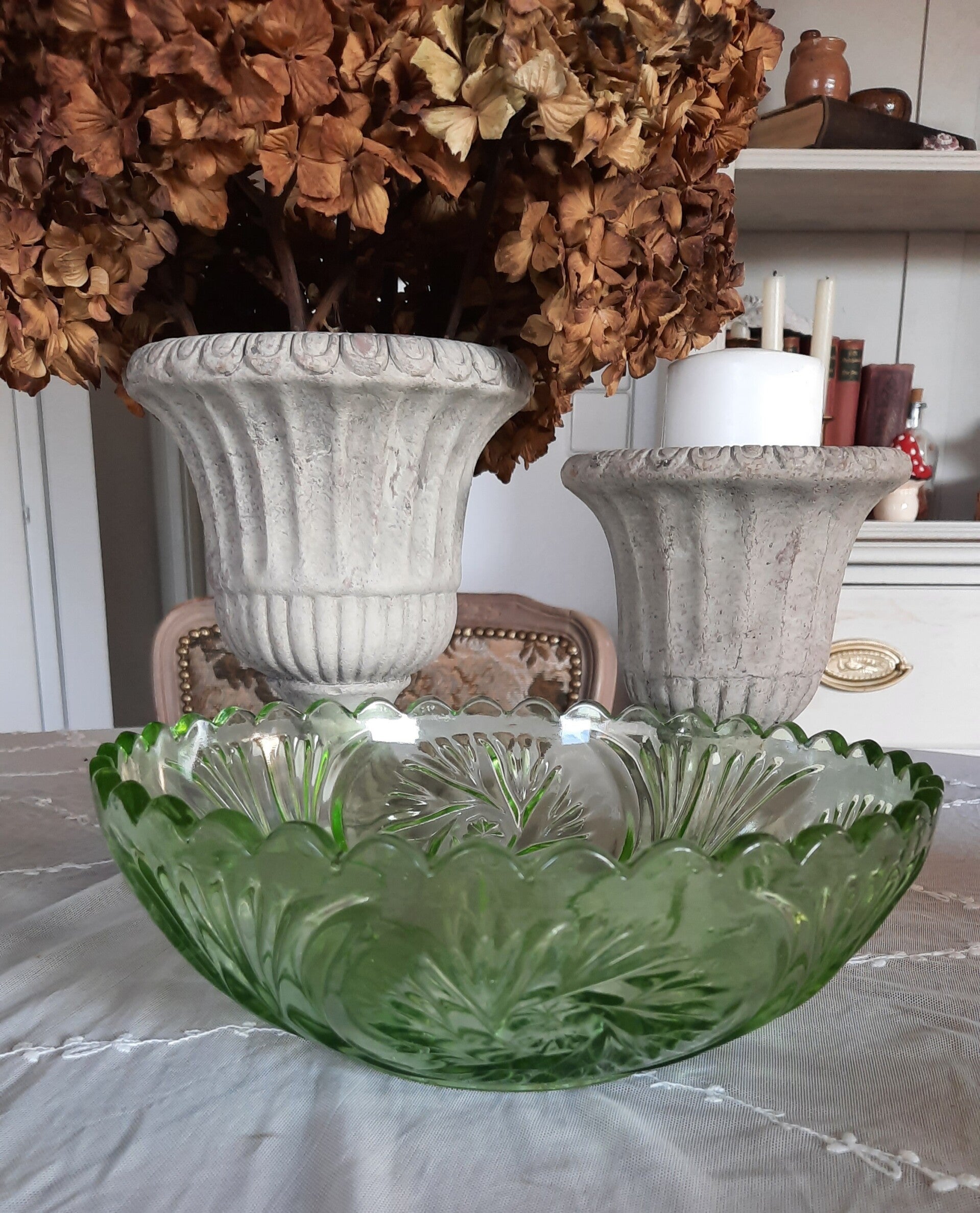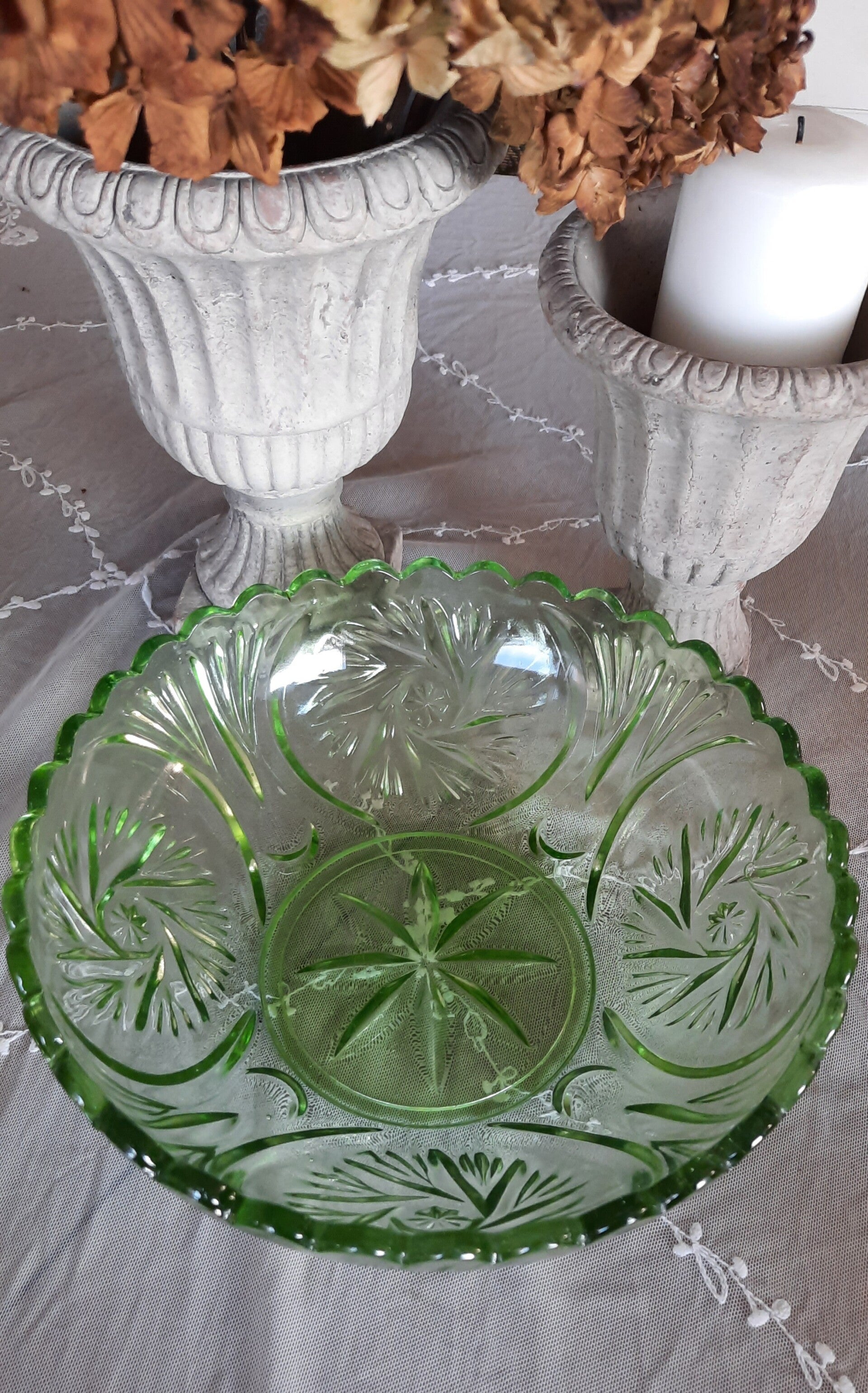 A vintage green pressed glass large bowl with a beautiful Art Deco design and curved rim. The glass is solid green, not coated.