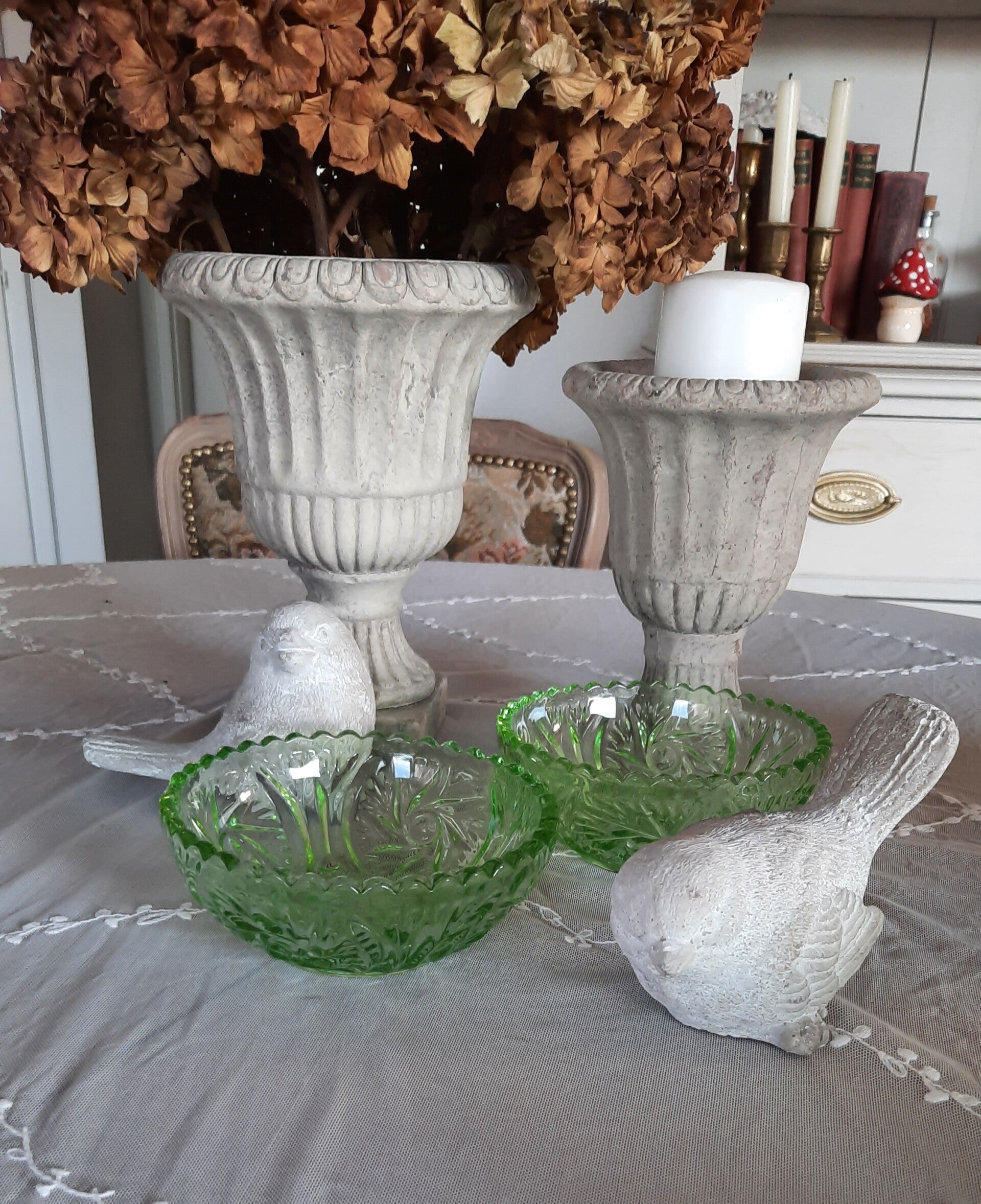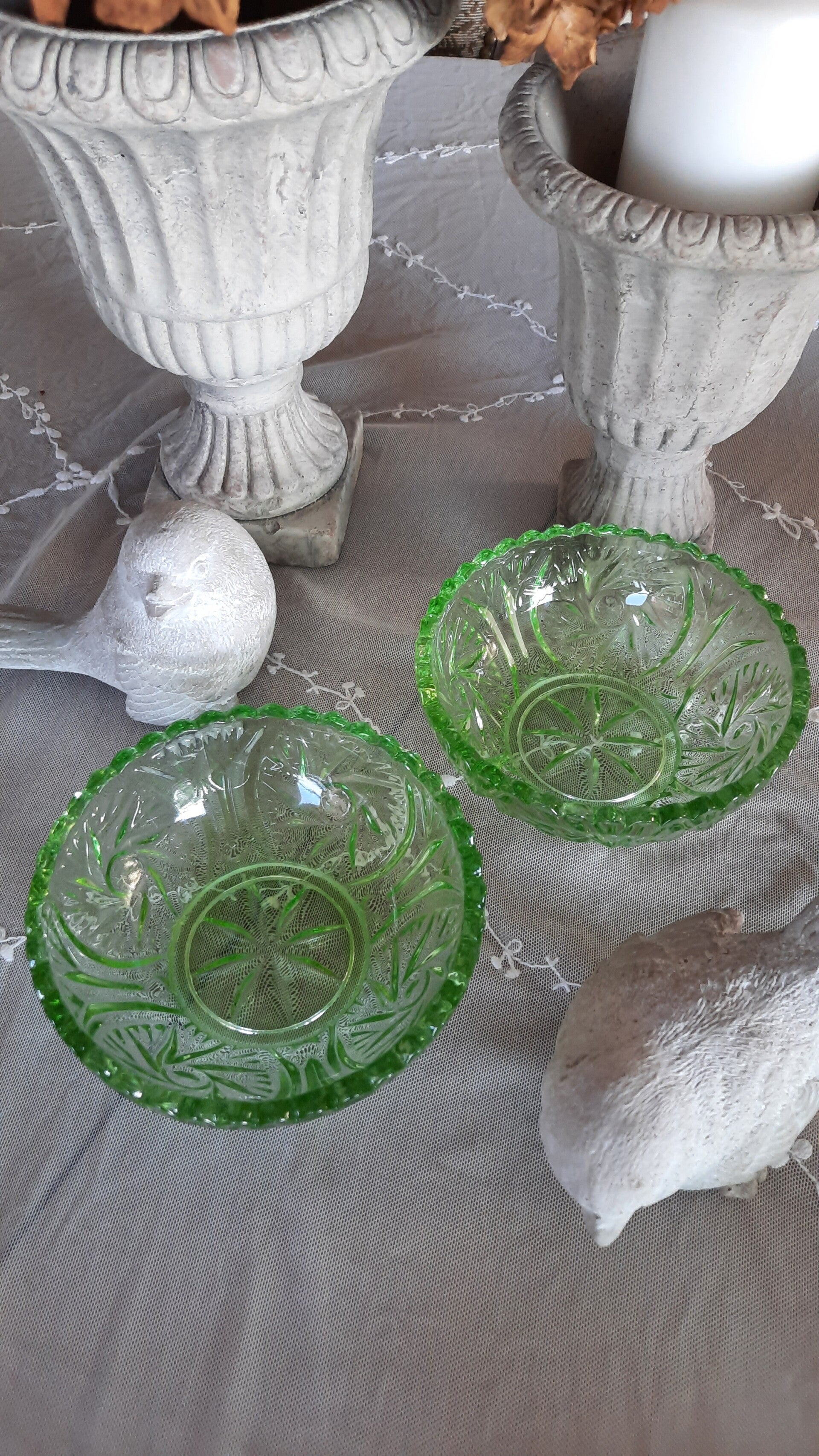 2 small vintage green pressed glass bowls with a beautiful Art Deco design and curved rim. The glass is solid green, not coated.