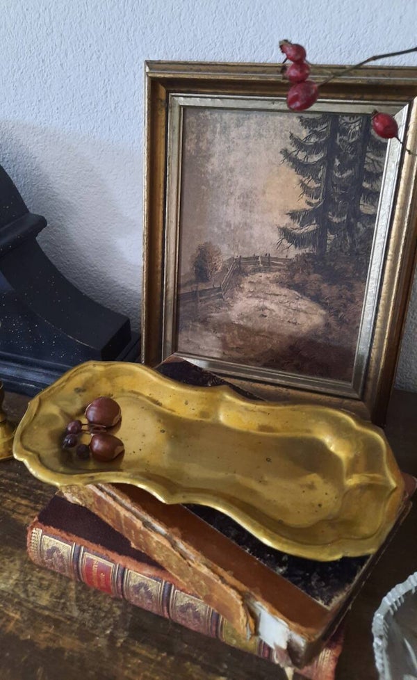 In vintage condition. The tray has some age-related patina wear and tarnish, which is normal for antique brass and only adds to its charm.