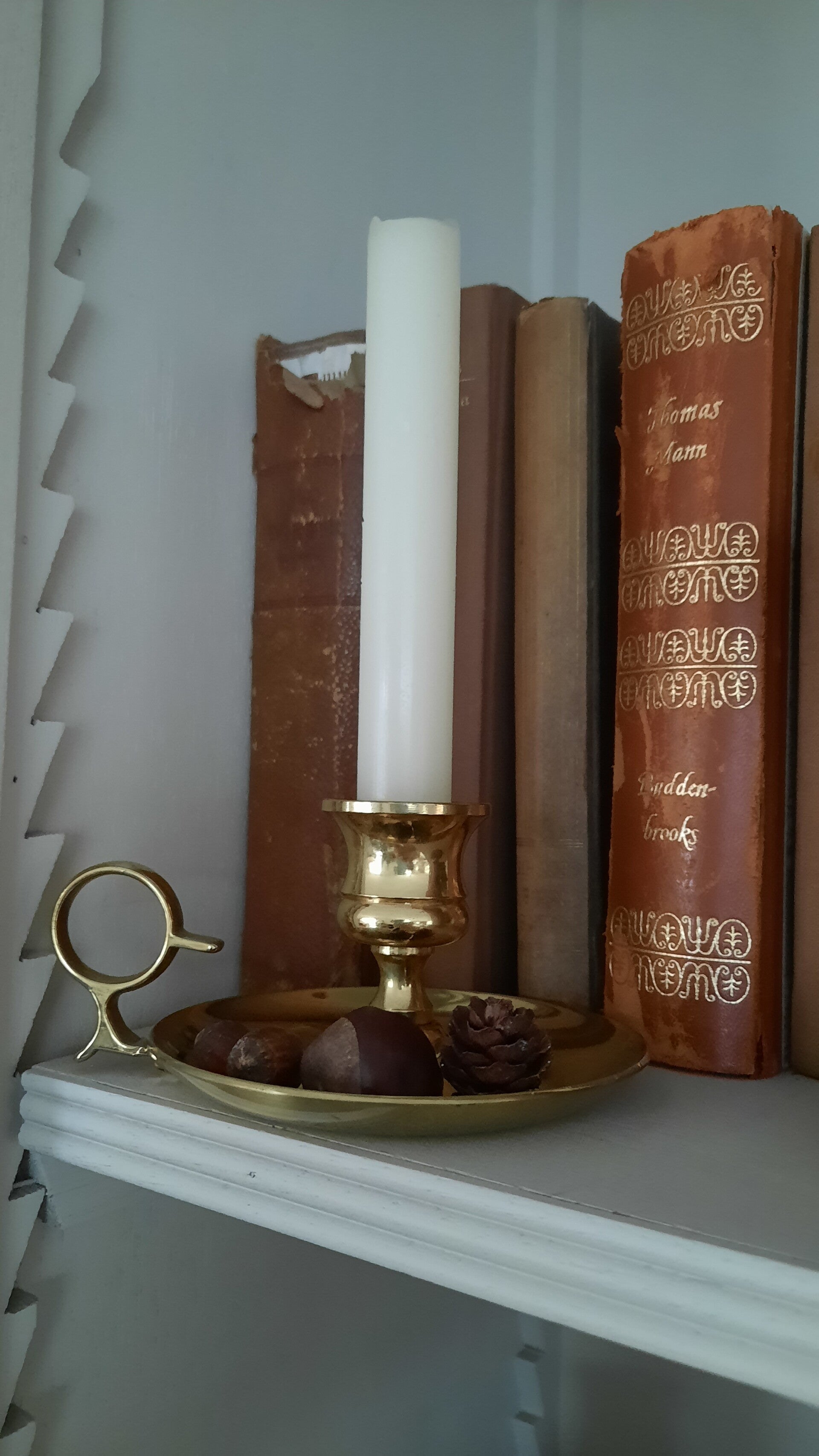 A beautiful vintage brass chamber candle holder with a handle. It is elegant and heavy.