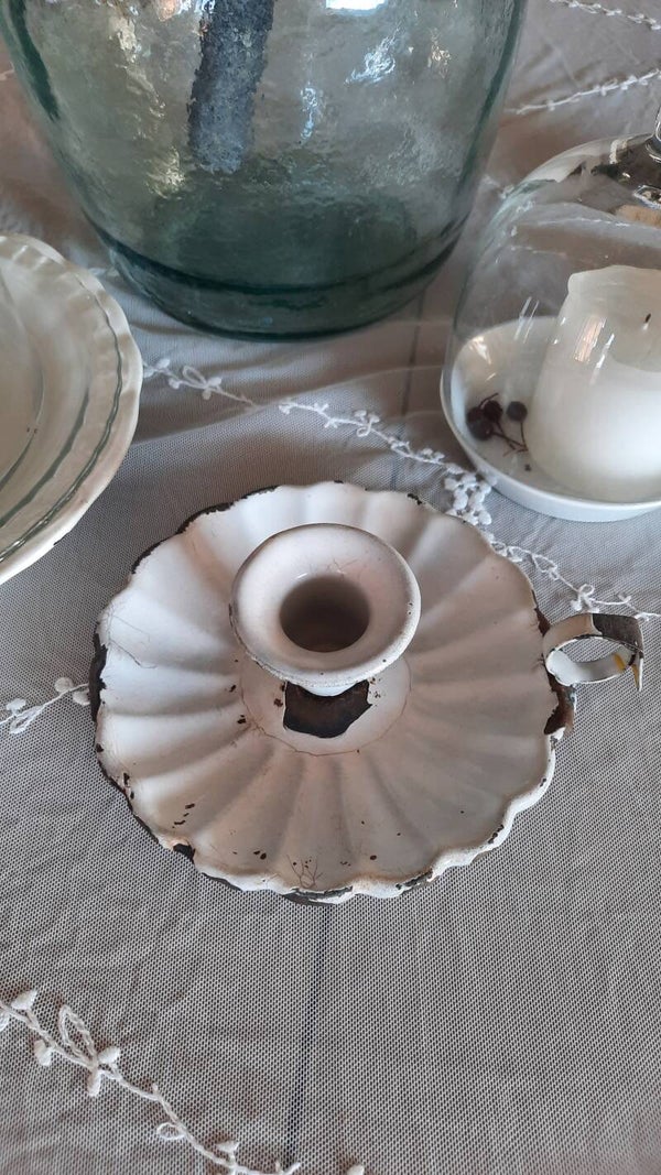 An antique enamelled chamberstick candle holder in white with a shell shape.