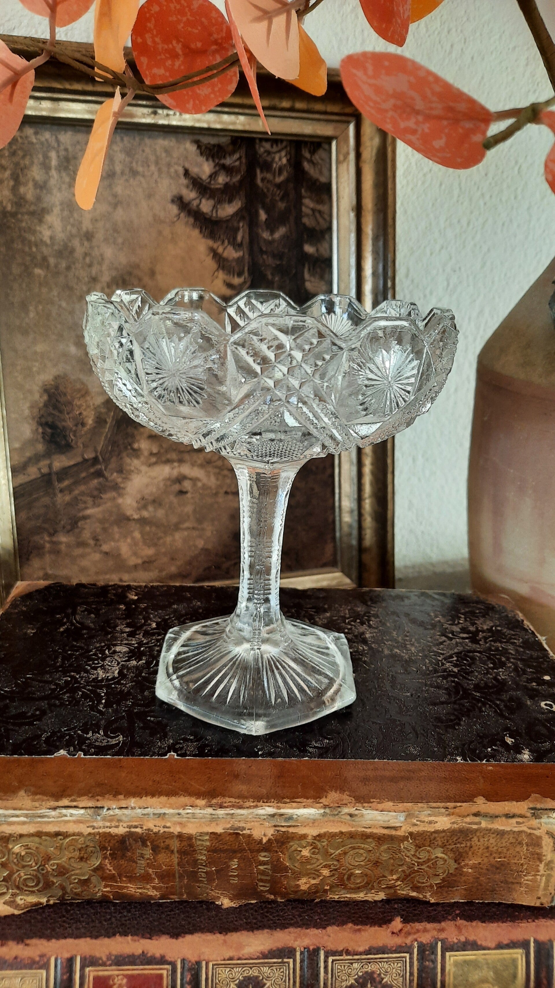An elegant small footed bowl with beautiful motifs and a curved rim, made of clear pressed glass.