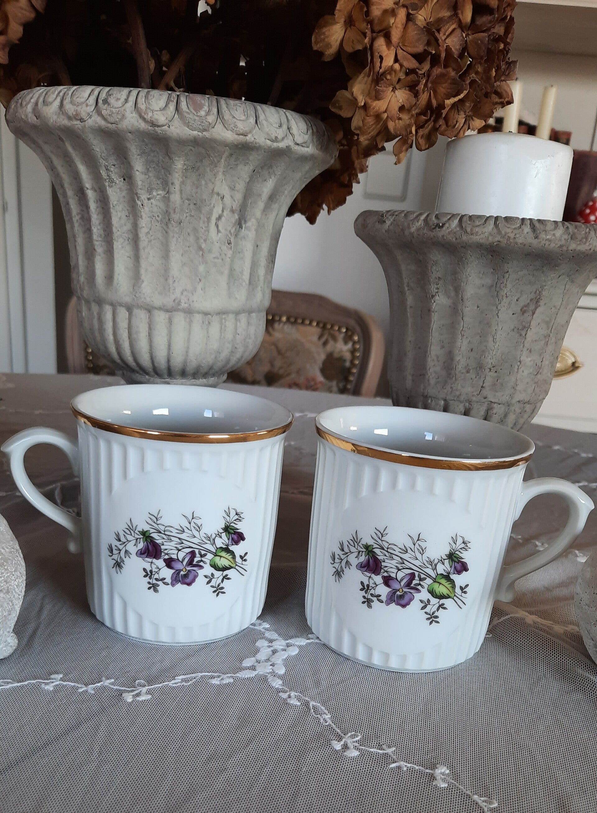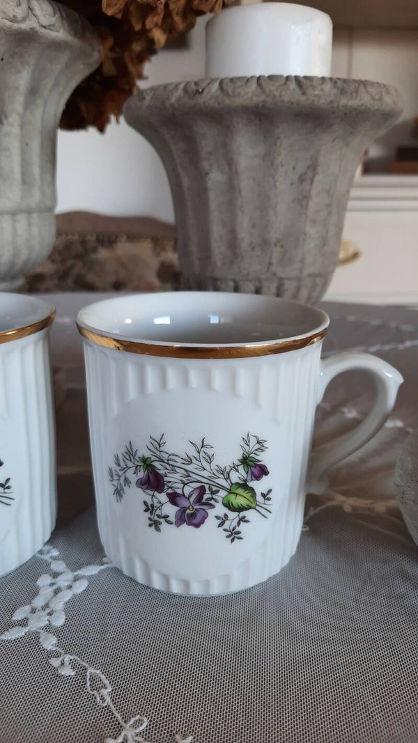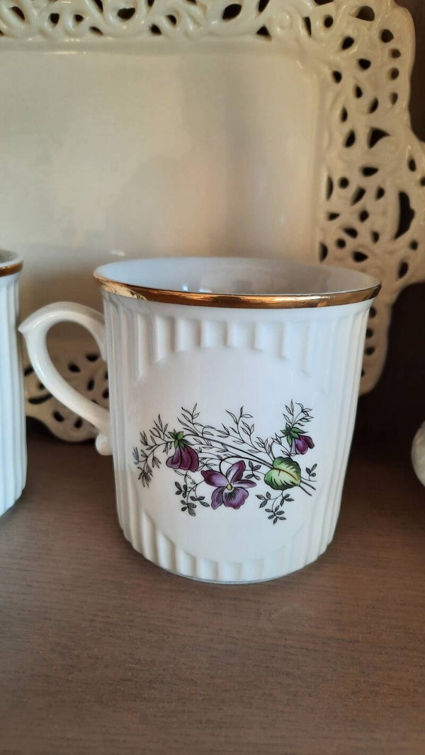 A beautiful vintage pair of porcelain cups in white with a gold rim and beautiful floral pattern in violet and green, along with a ribbed design. Marked on the bottom: Dubi, Czechoslovakia.