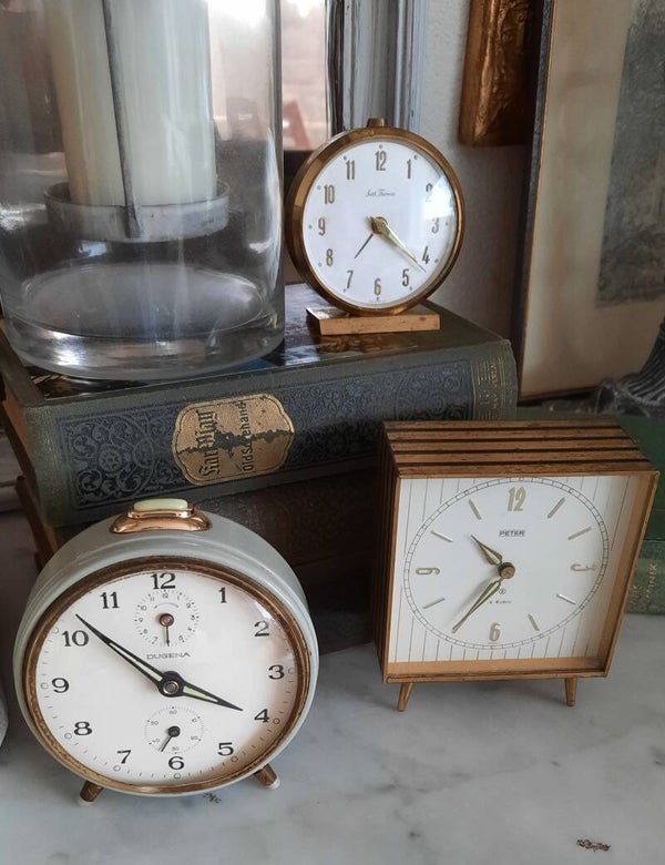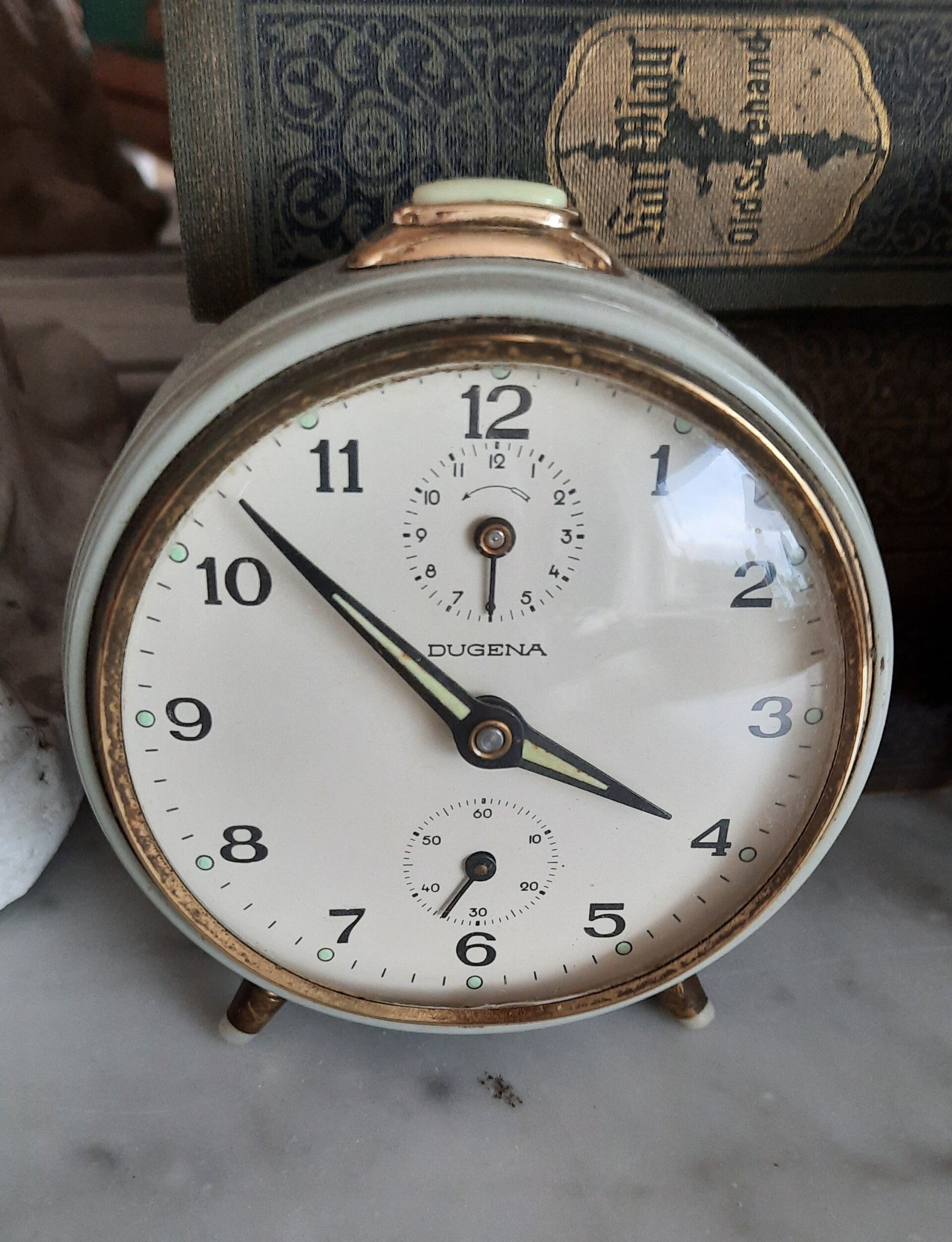 A beautiful Mid-Century Dugena clock from Germany in gray color, from the 1950s-1960s. There is a button on the clock that glows in the dark. (Fully functional)