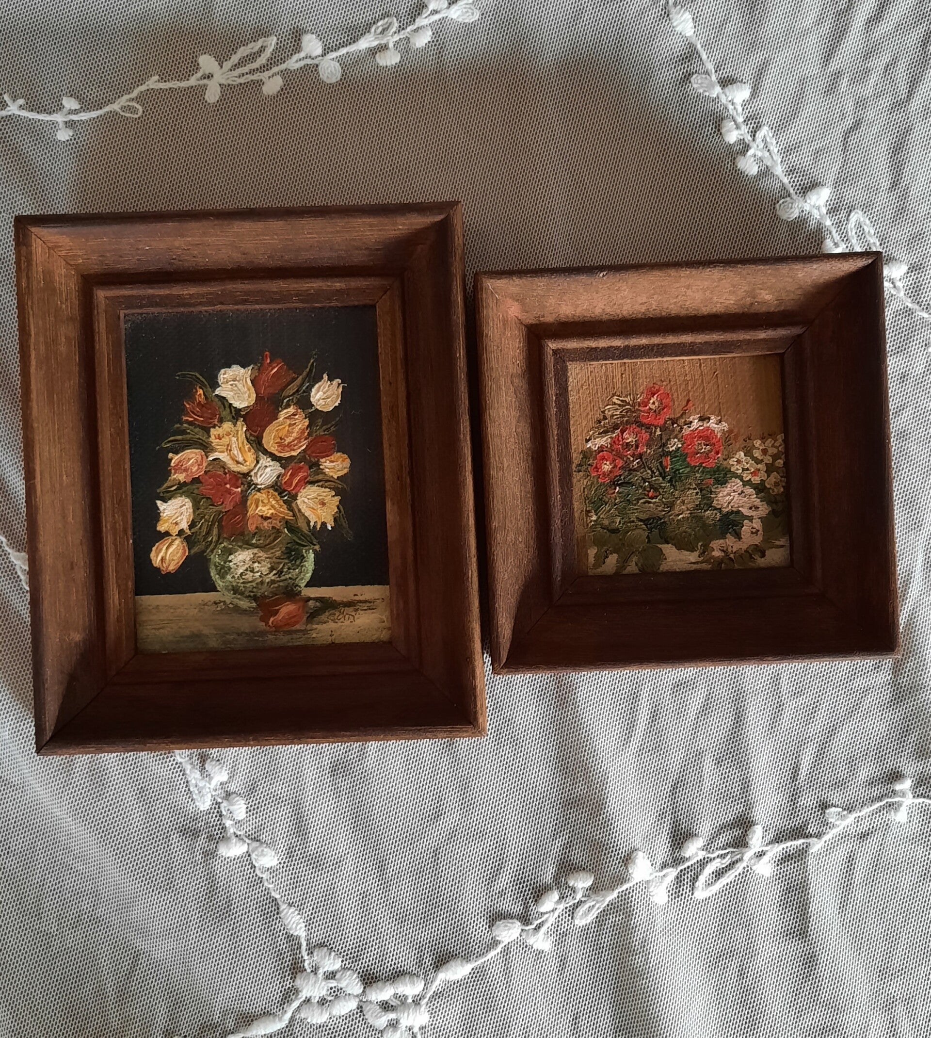 Two lovely original floral still life oil paintings. They have beautiful wooden frames. There is a triangular device on the back for wall hanging.