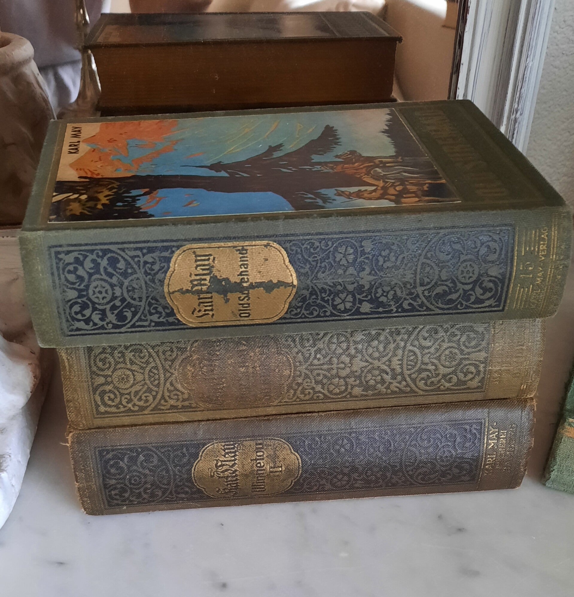 Vintage set of 4 books with travel stories, including 1 book of Winnetou the Indian, 2 books of Old Surehand (one with plastic wrap), and 1 book Der Schatz im Silbersee. All in German, from the 1950s, by Karl May.
