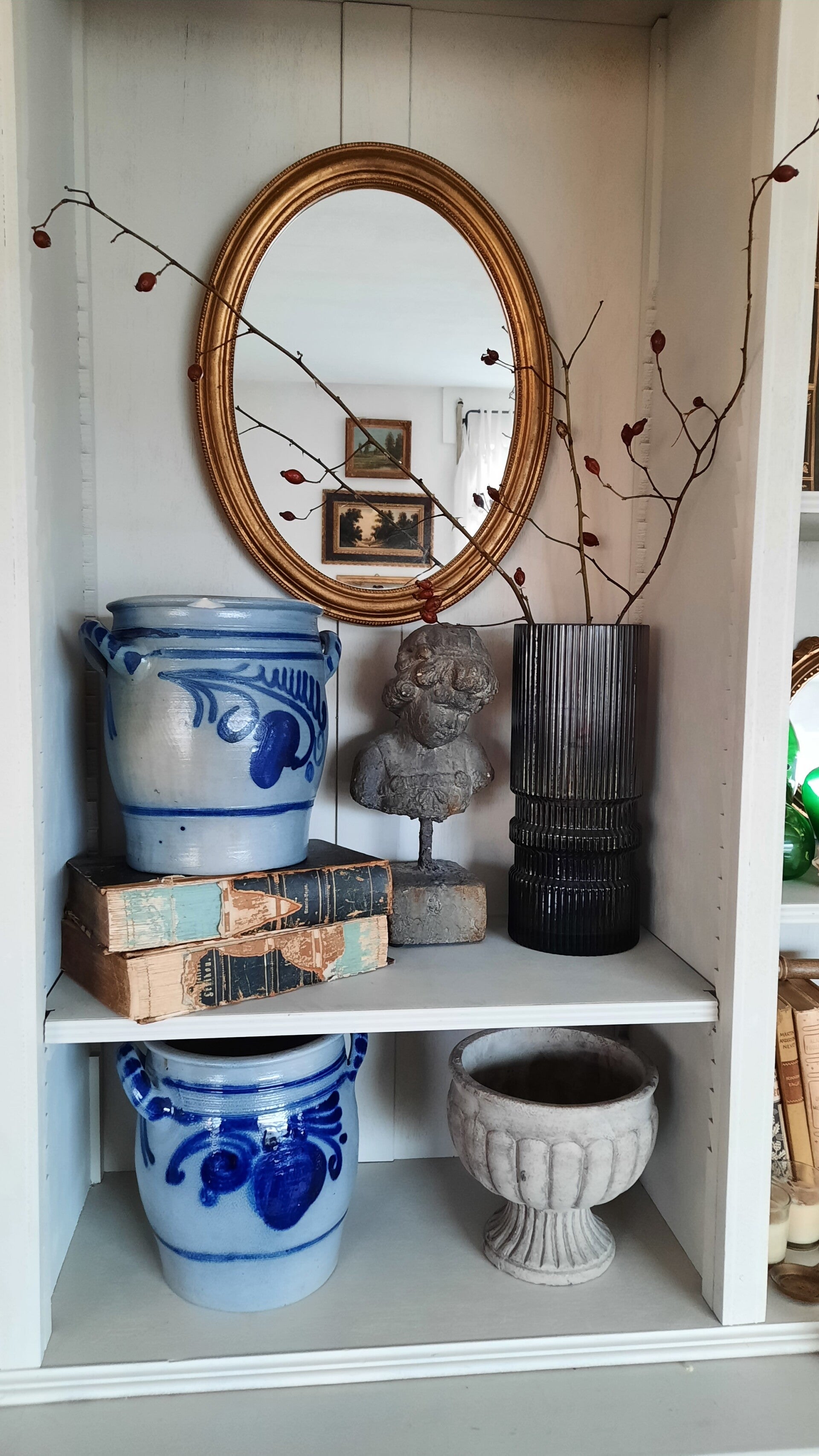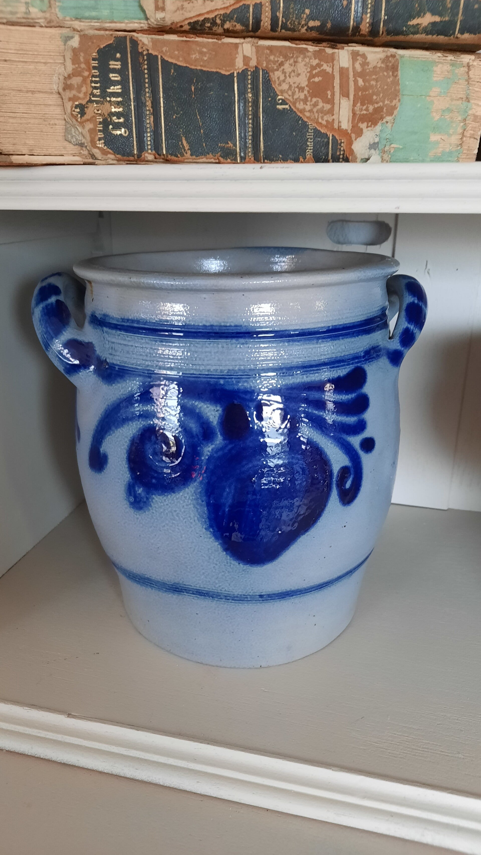 A beautiful vintage rustic salt-glazed pot in blue-gray color with blue floral patterns. The special salt glaze gives the pot a unique texture and color, and the blue-gray color adds to its rustic character.