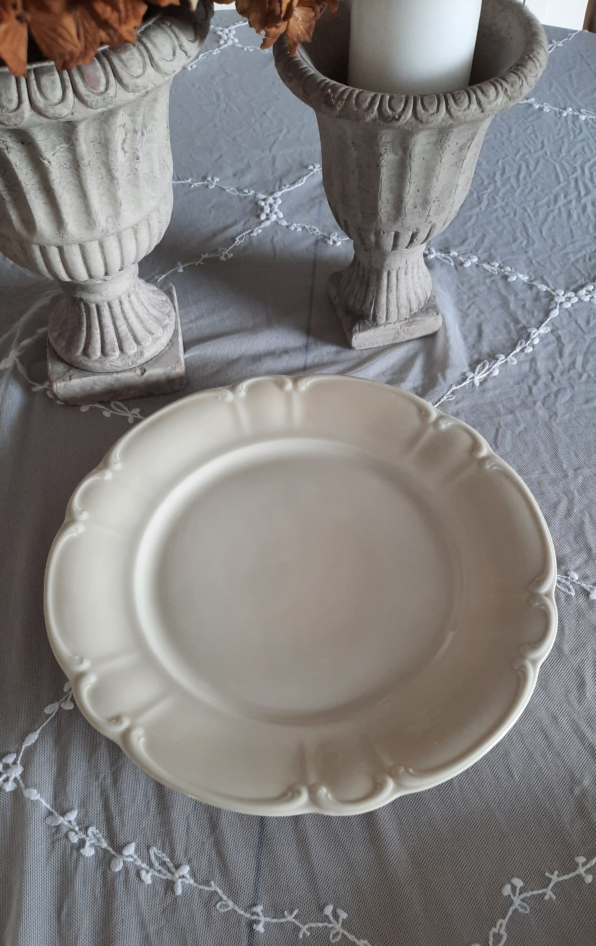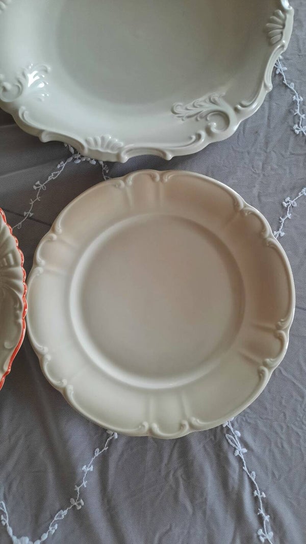 A beautiful vintage porcelain plate in cream color with raised details. Ideal for wall decoration. Marked on the bottom: Antoinette.