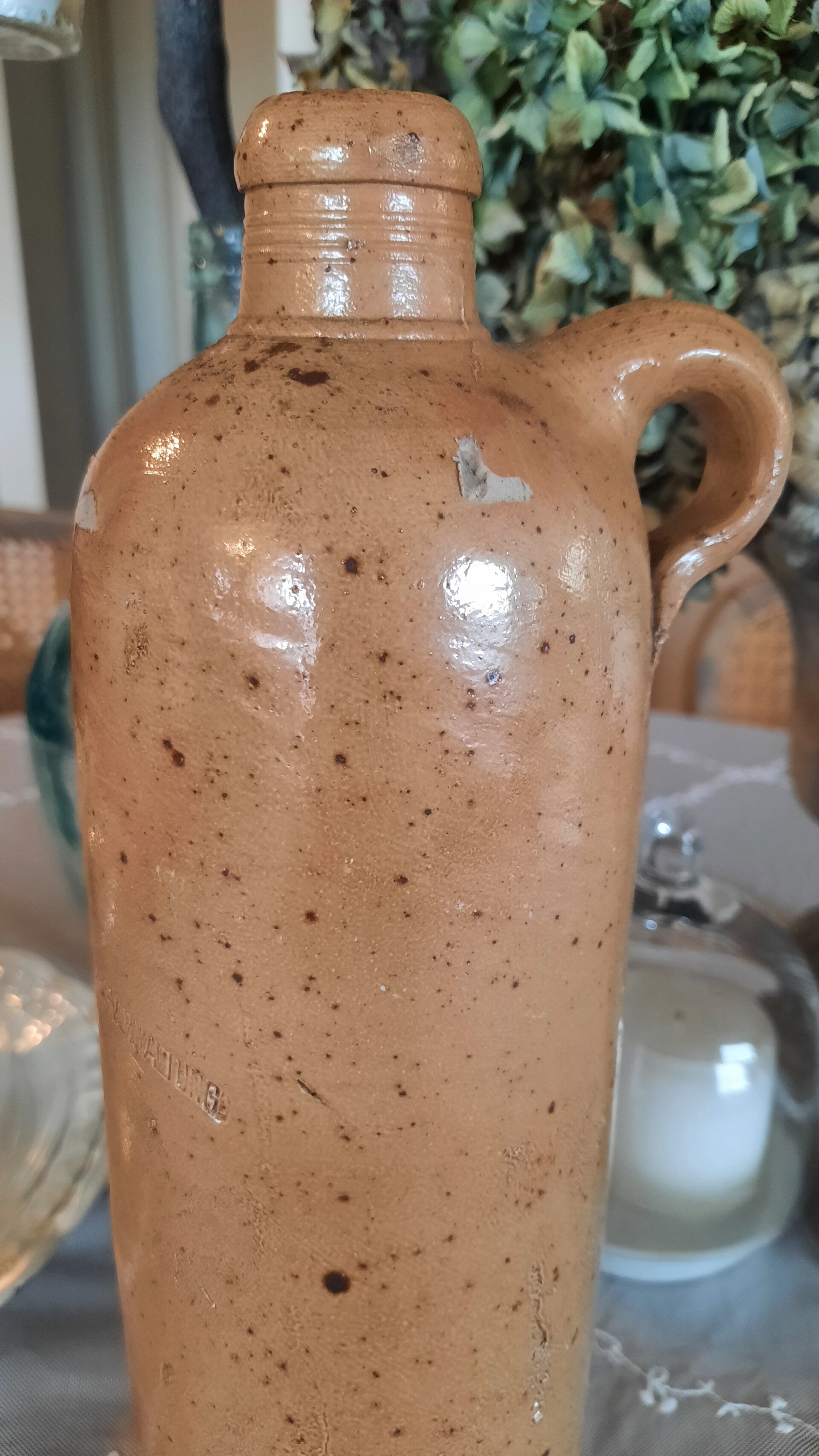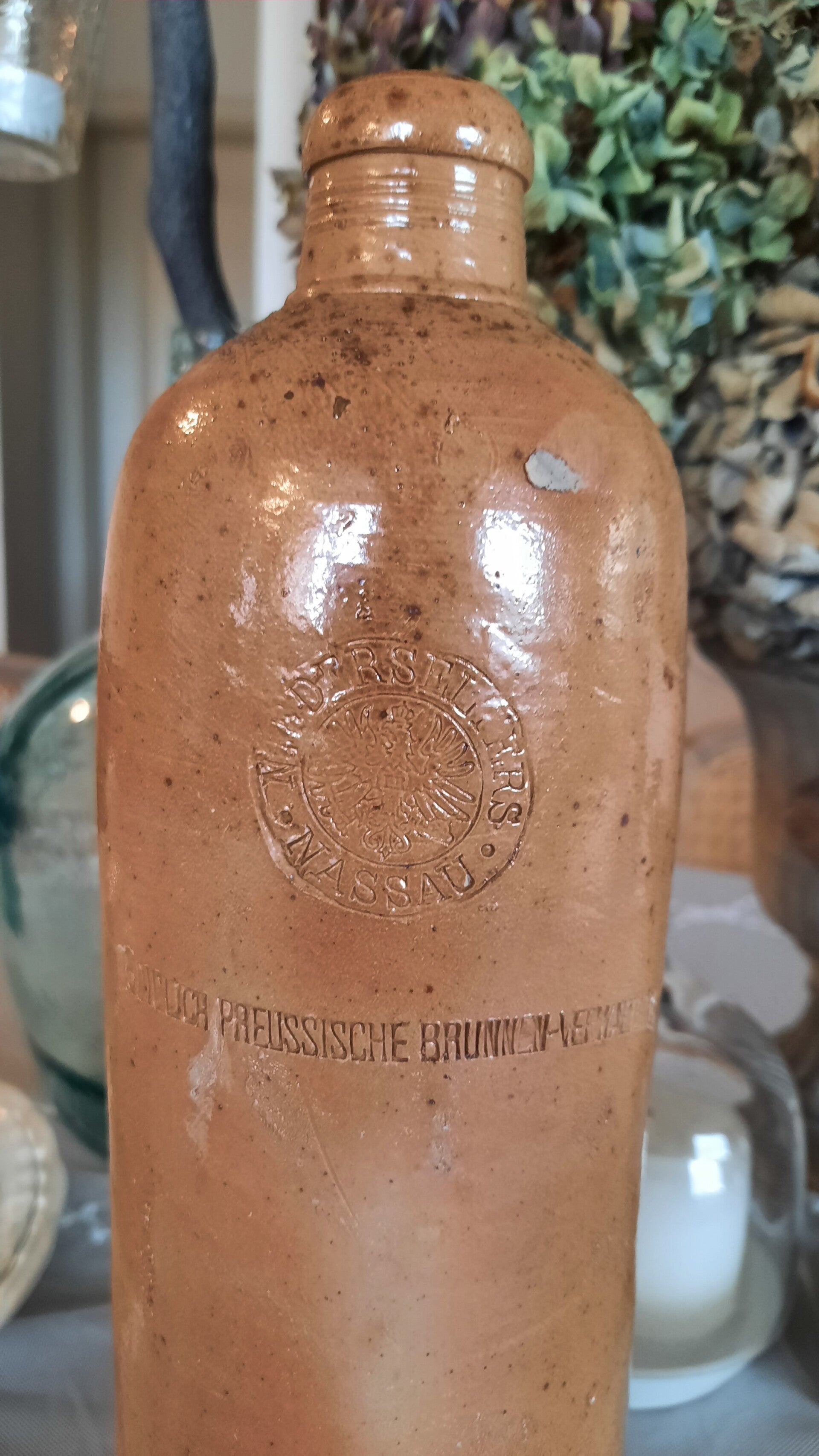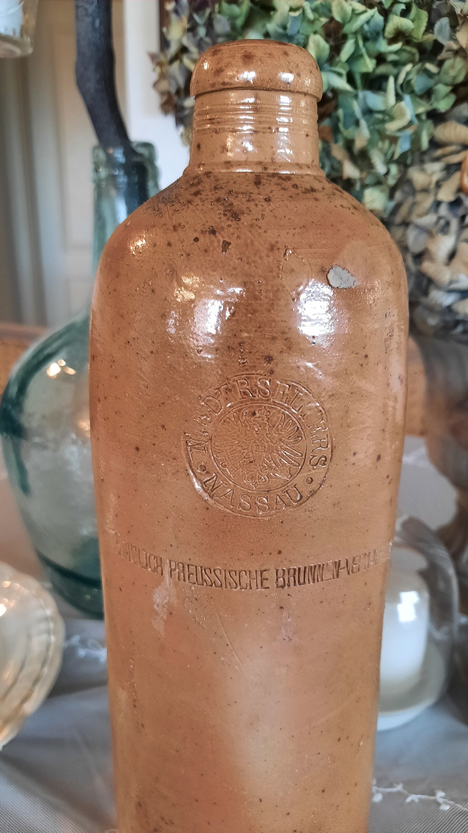 A very rare German stoneware mineral water vessel. Handmade and quite old. German mineral seltzer water was exported to England in the 1800s, making this bottle from that period. It has a ringed neck and a small side handle. There is a readable imprint on the front of a winged emblem and the words "Niederselters Nassau." Also, there is some text in German. It has an amber-brown color and is glazed.
