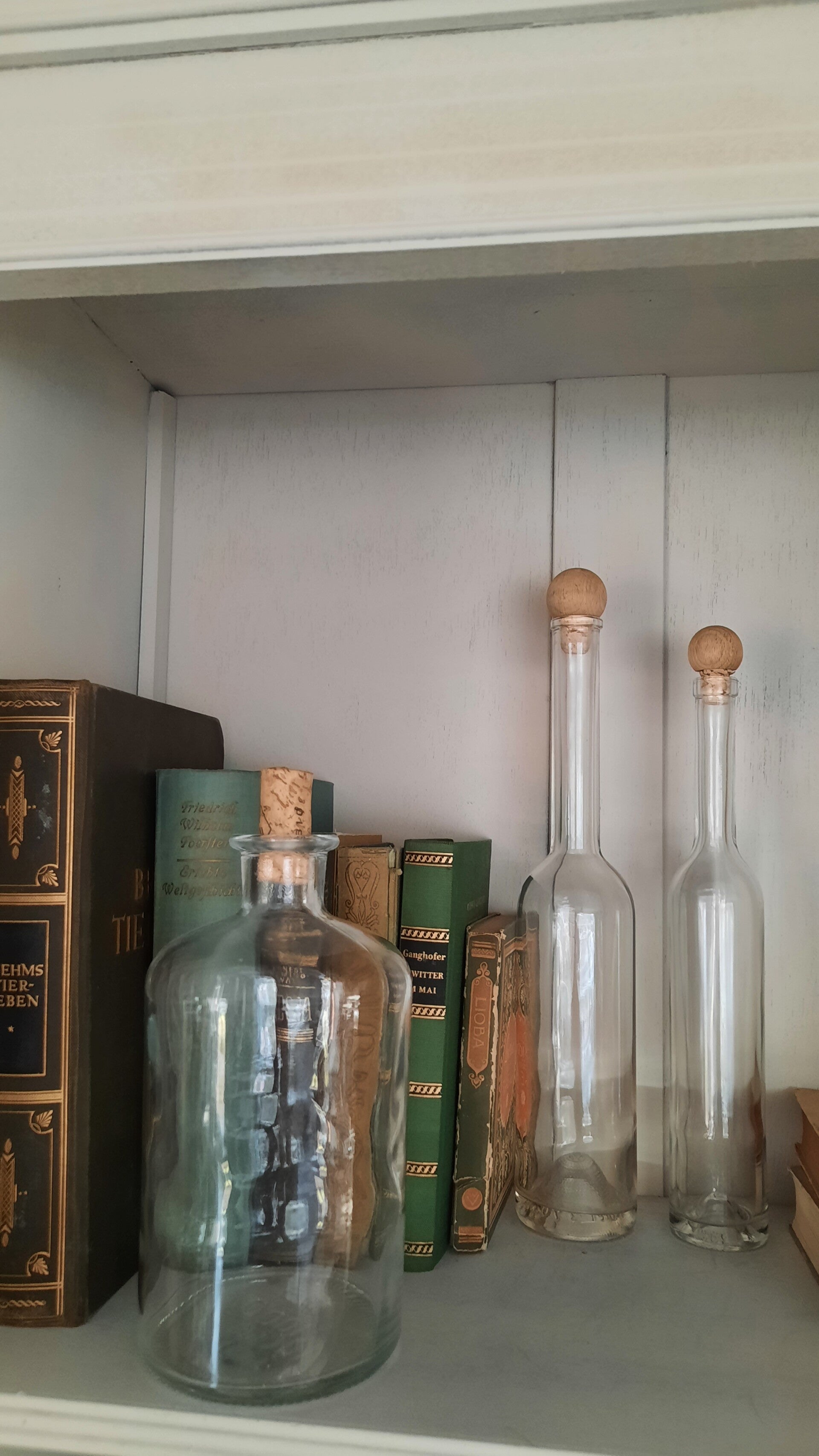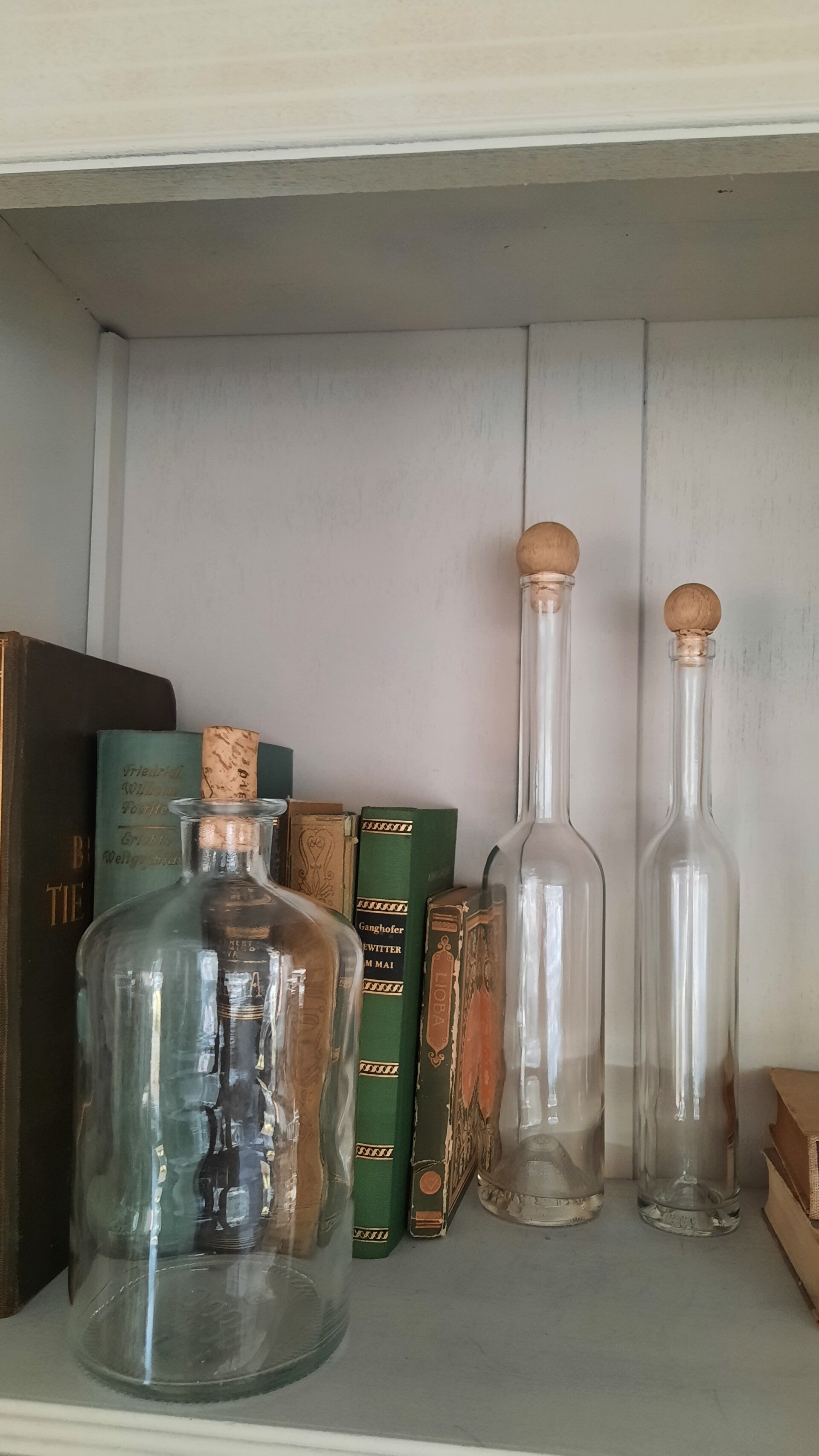 A beautiful set of 3 bottles made of thick and solid clear glass with cork stoppers.