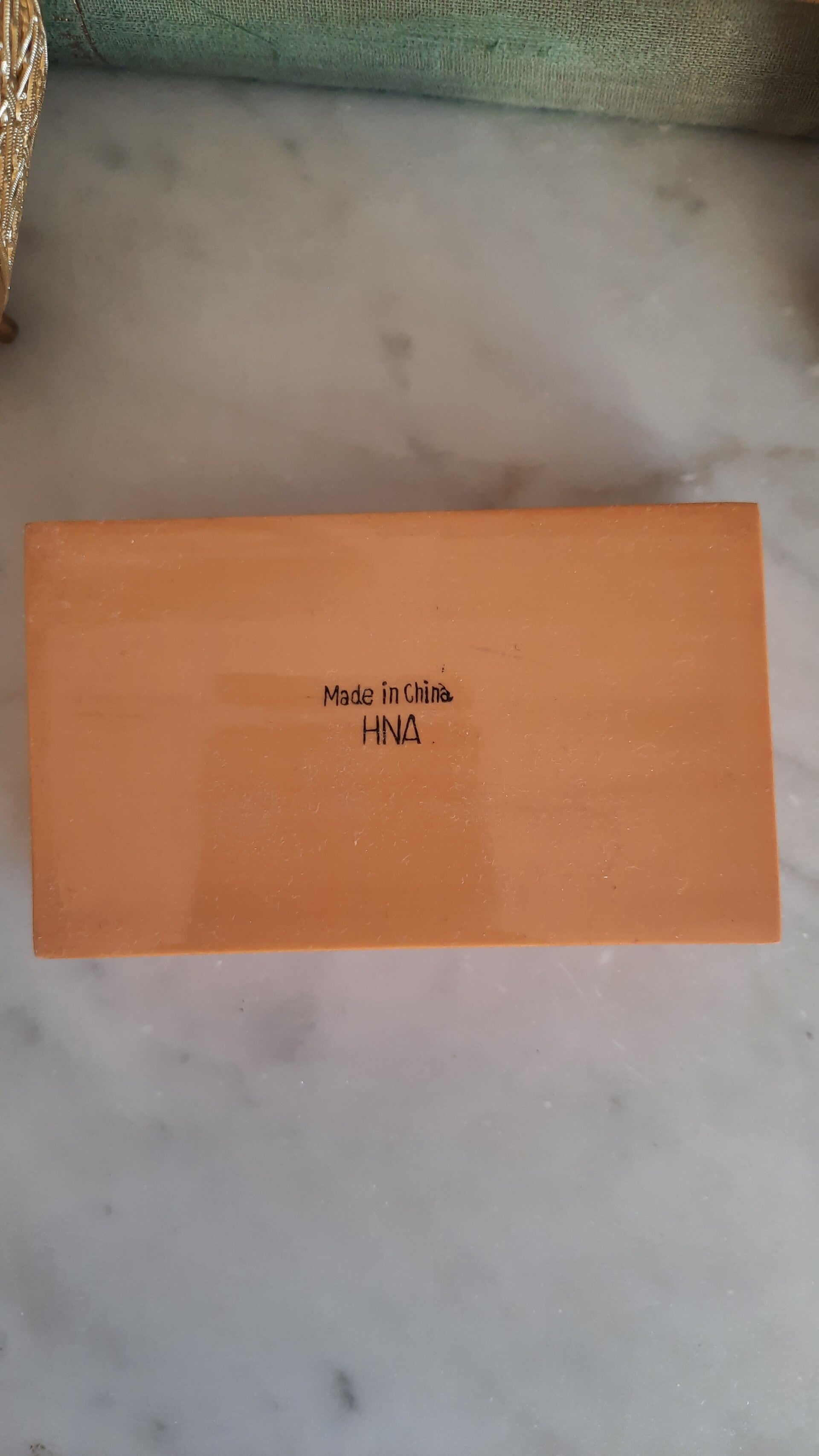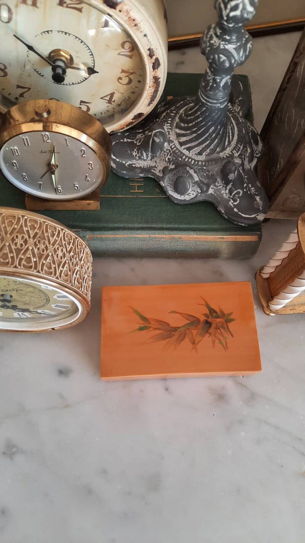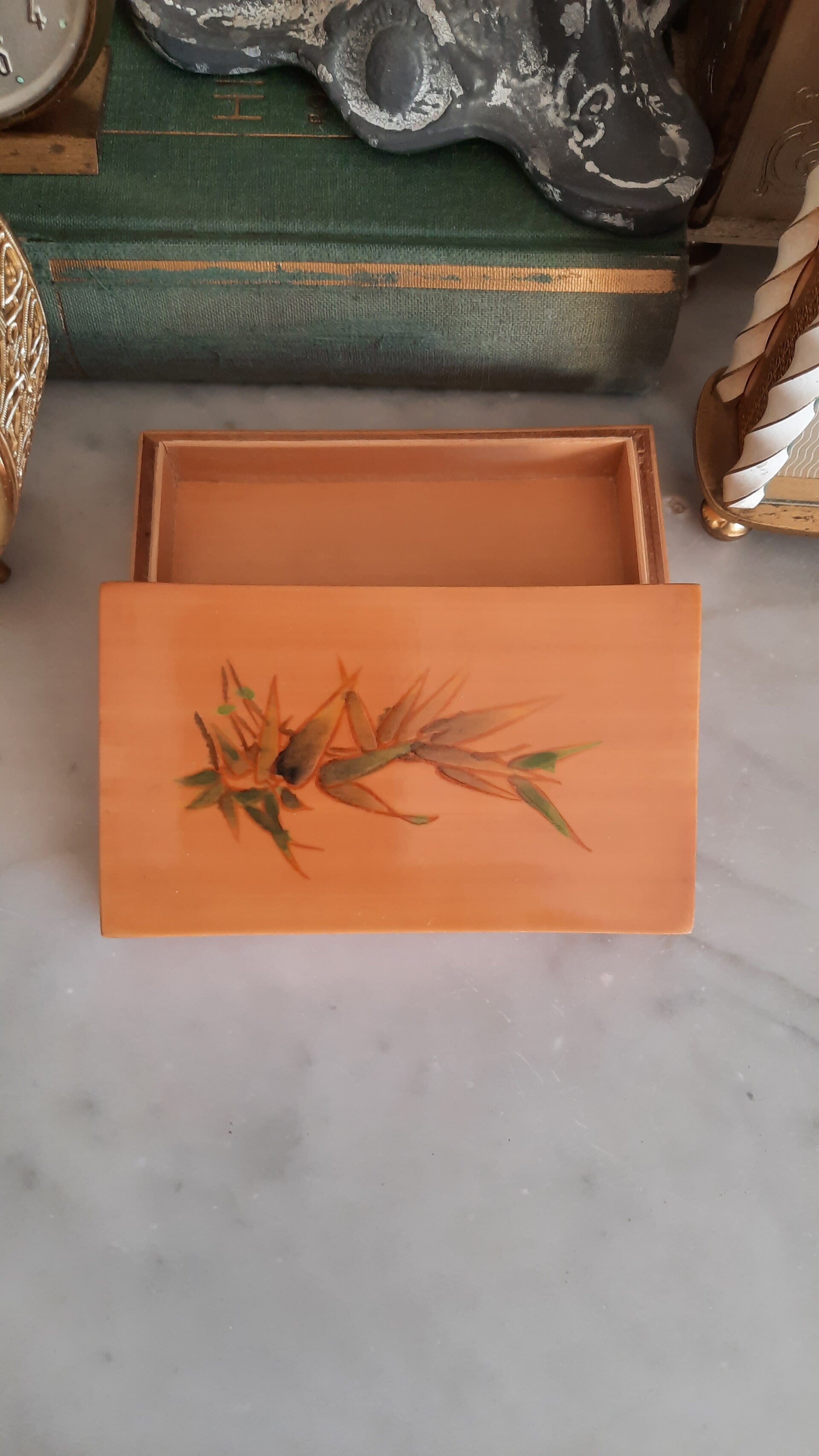A lovely vintage small wooden box with a lid in light brown color, featuring a floral pattern on the lid.