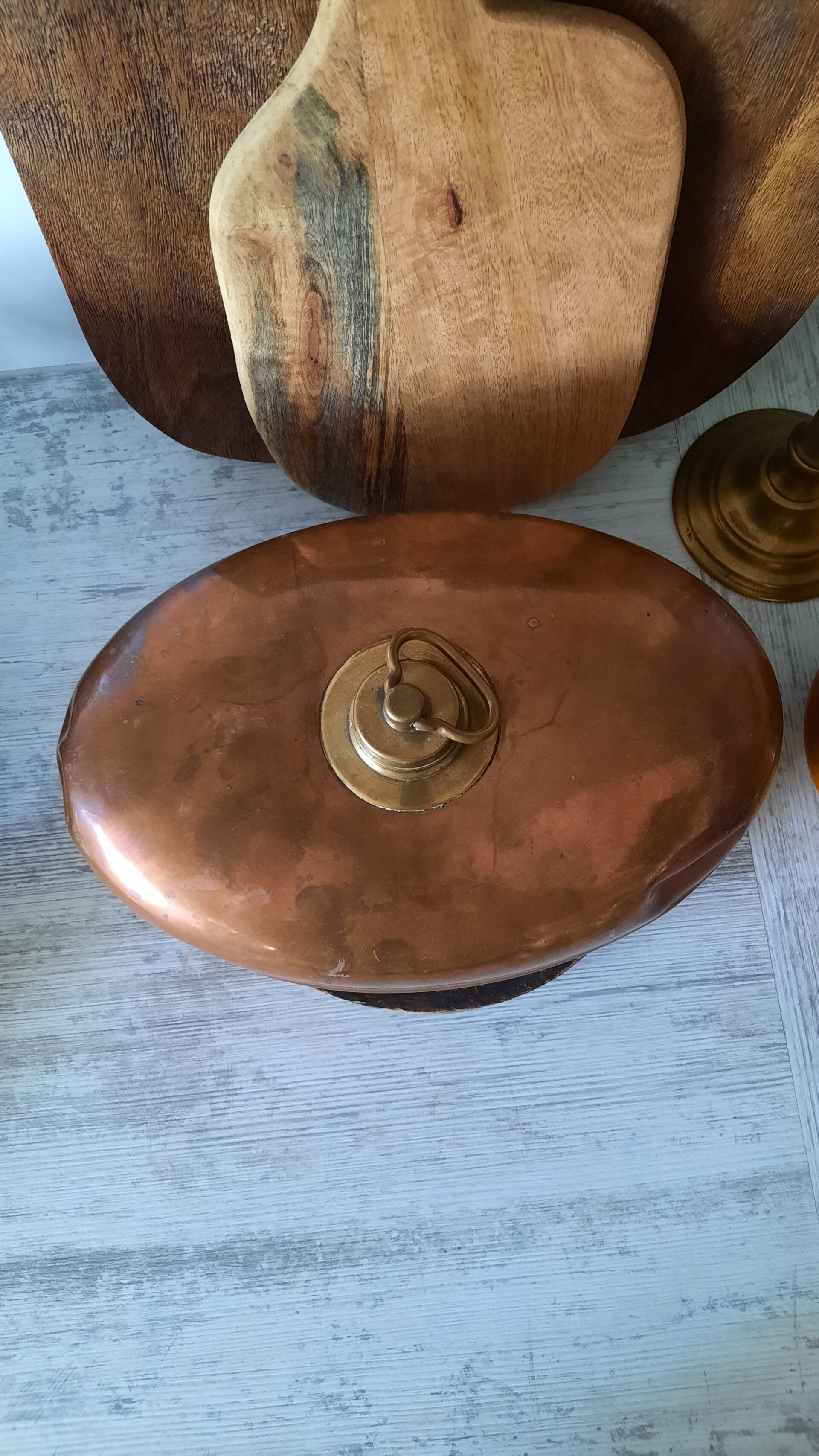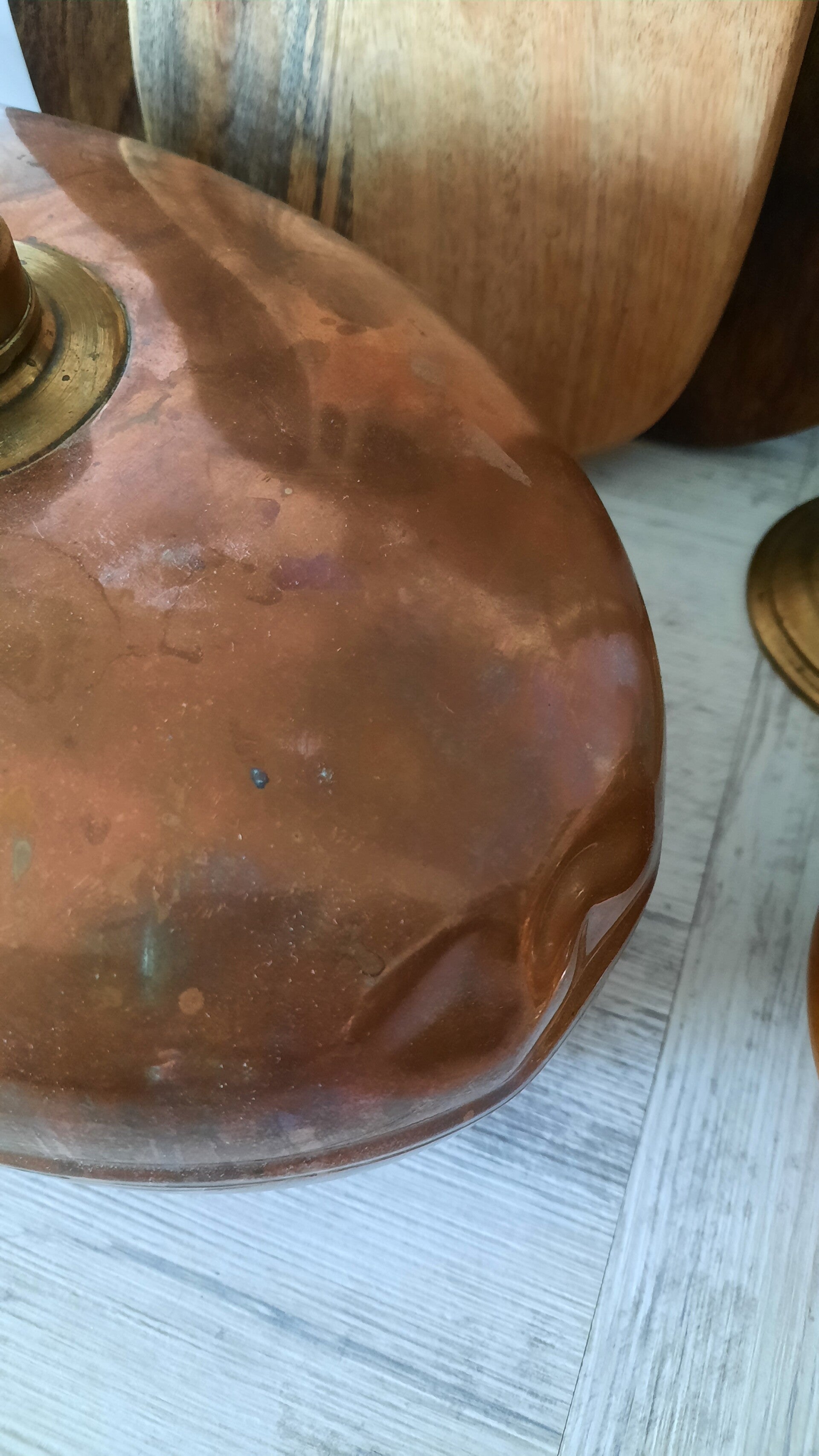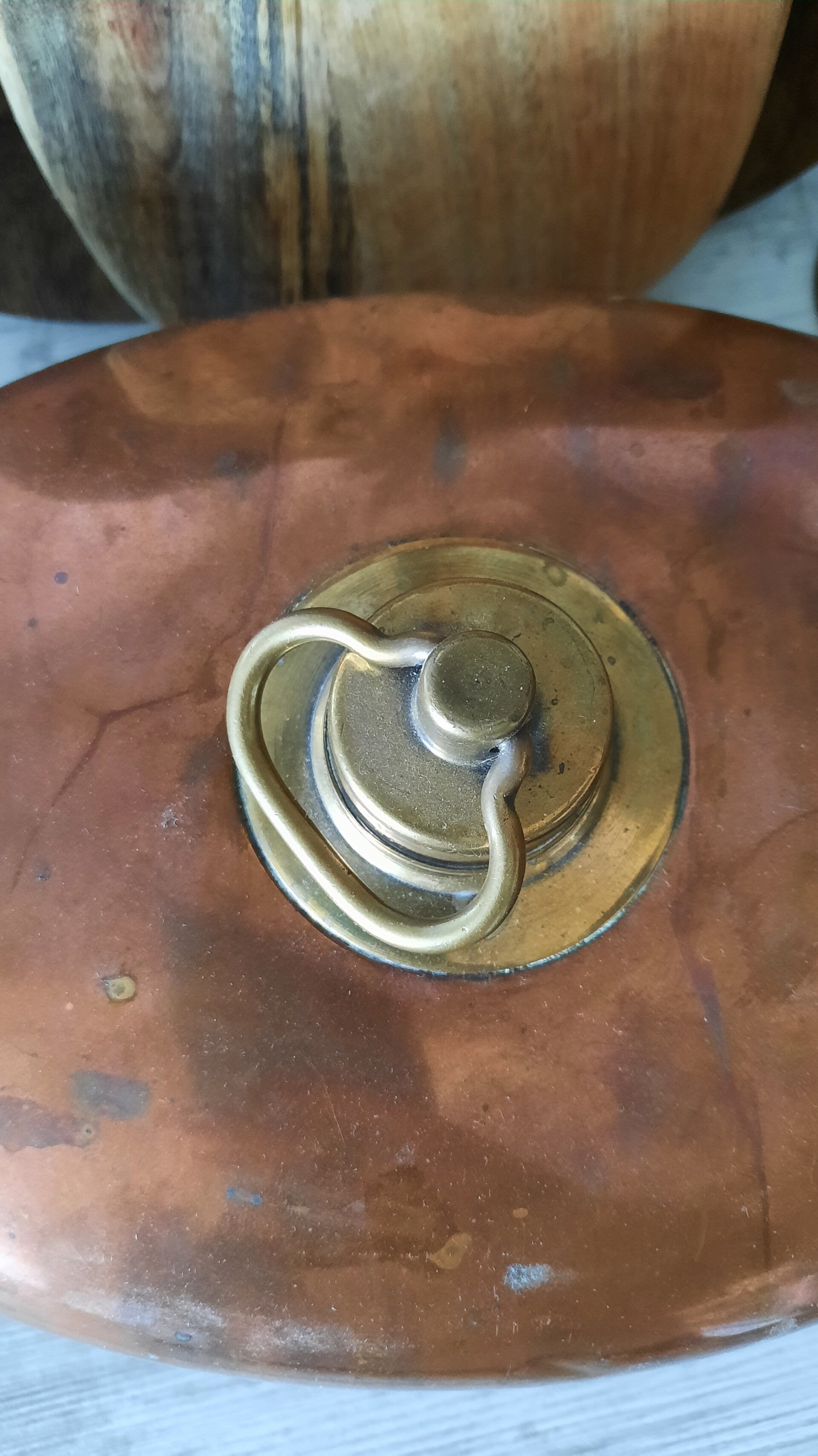 In vintage condition with age-related wear and tarnish, typical for antique copper and brass, adding to its charm and patina. The metal surface also shows some dents.