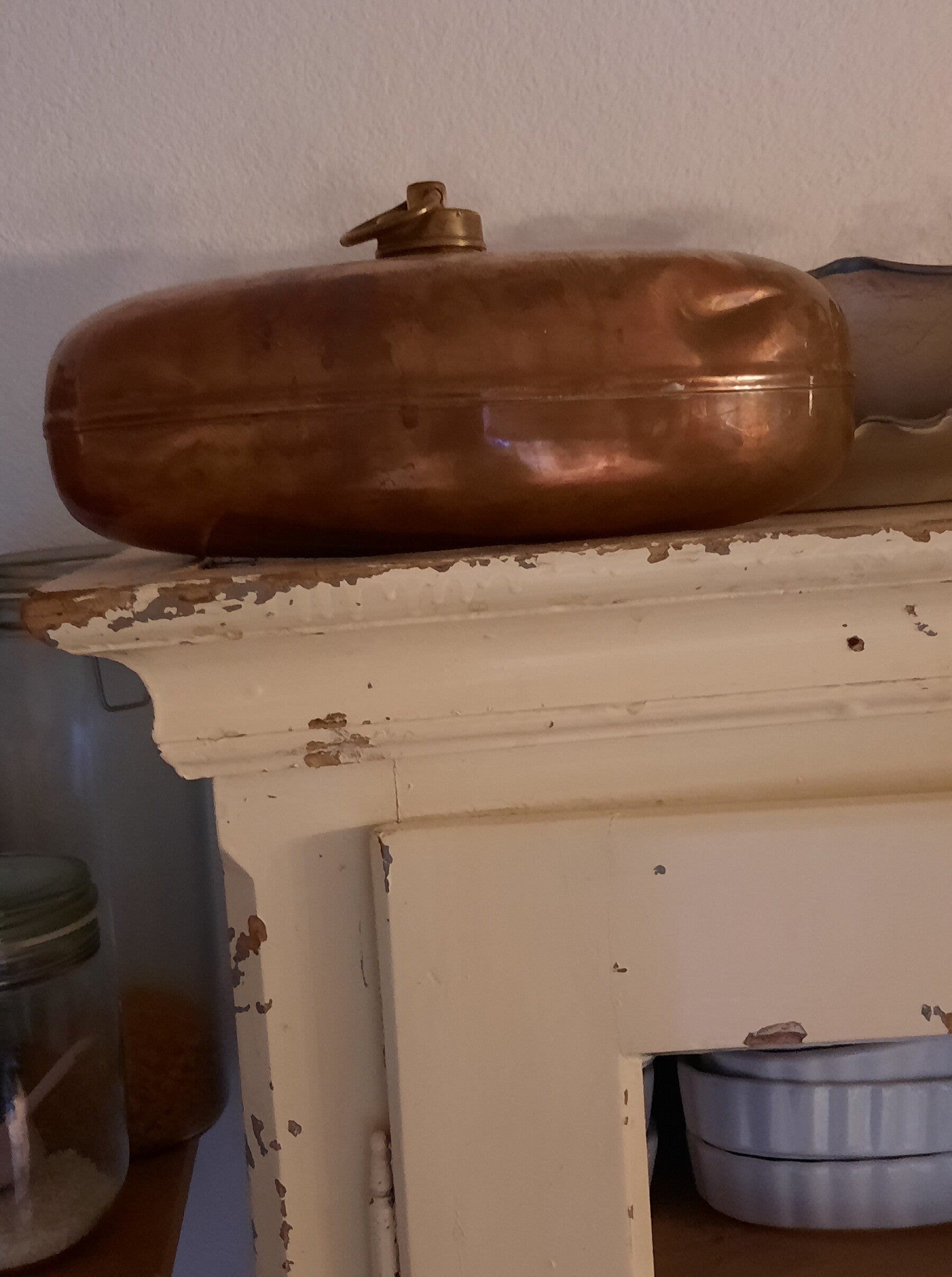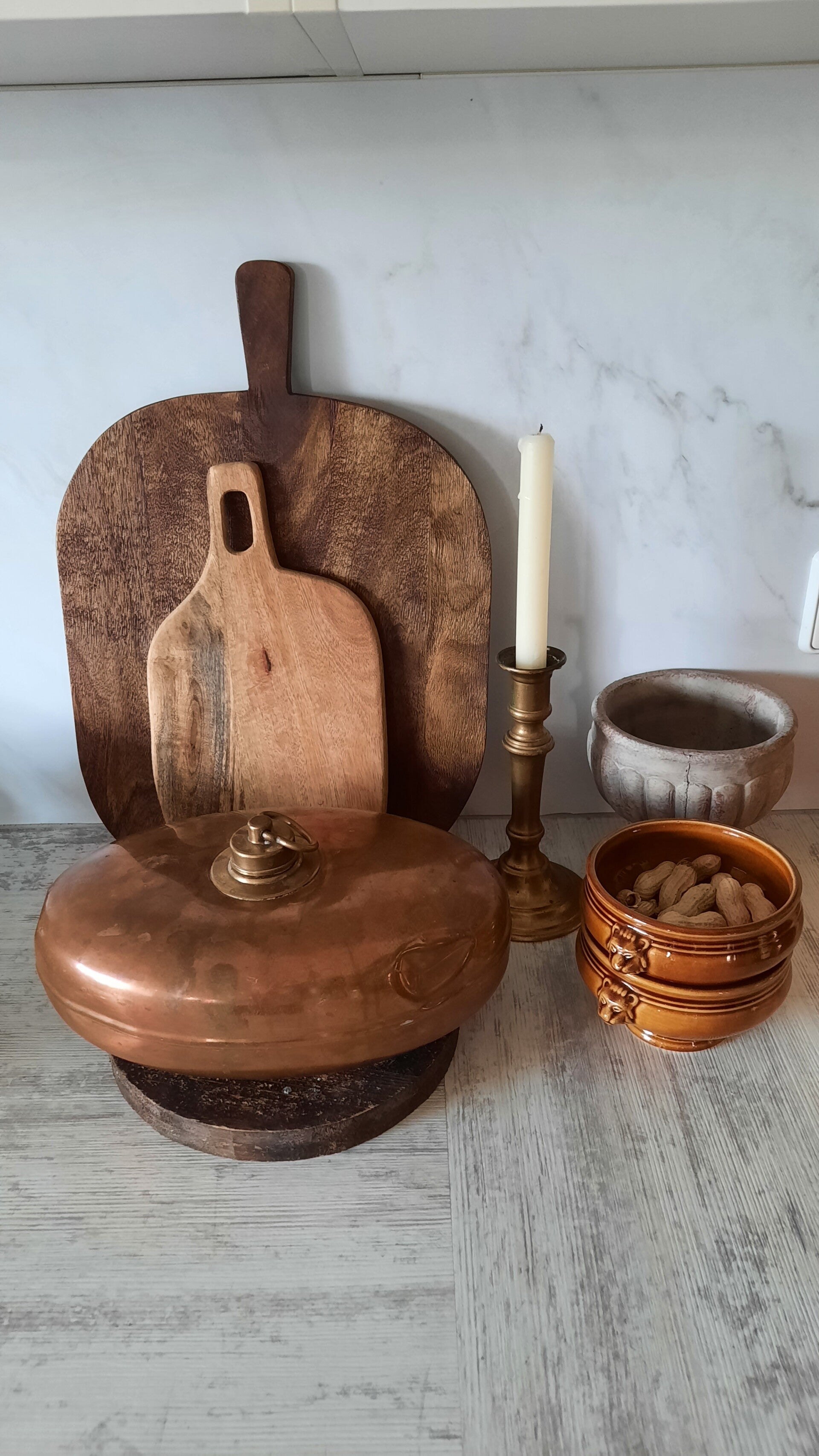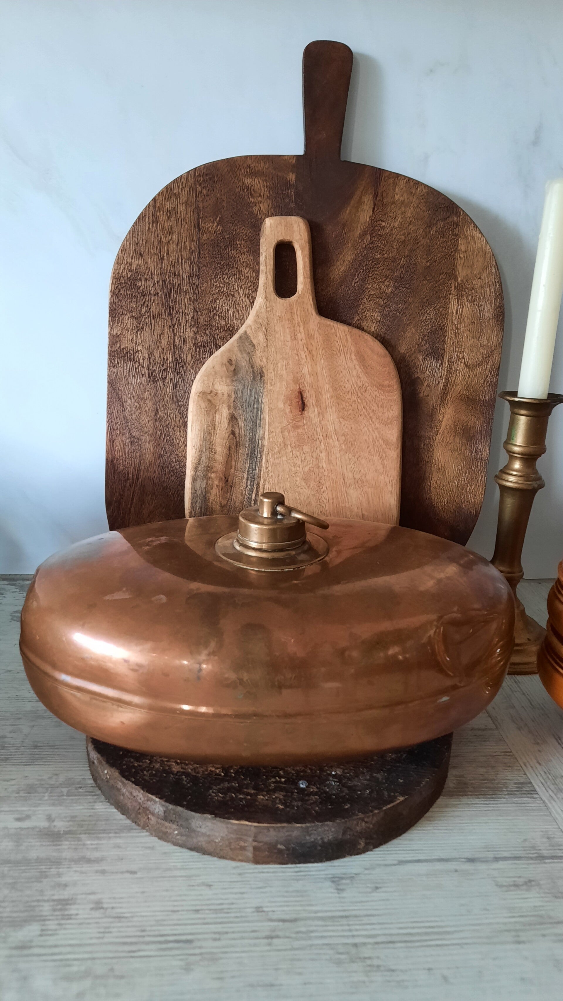 In vintage condition with age-related wear and tarnish, typical for antique copper and brass, adding to its charm and patina. The metal surface also shows some dents.